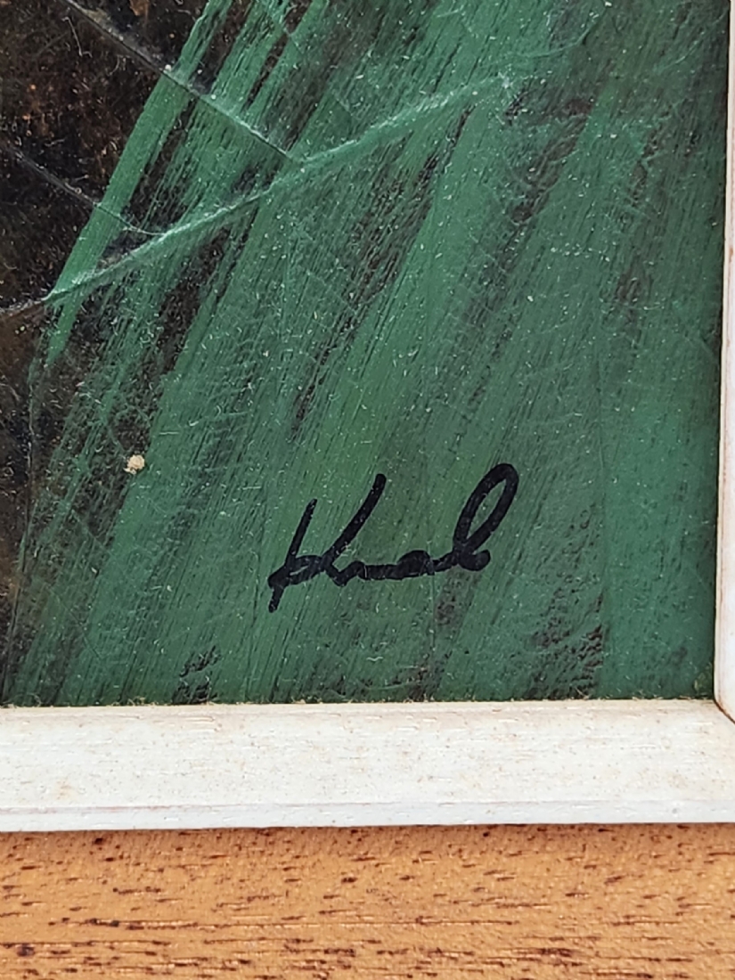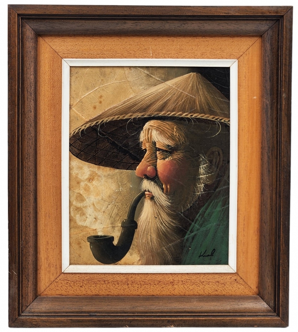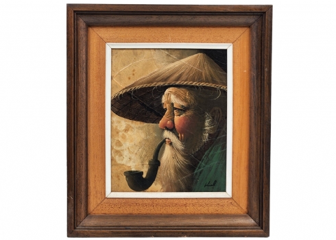 'גבר מעשן מקטרת' - ציור תאילנדי, שמן על נייר אורז ועלים, חתום, מידות: 25X19 ס"מ, מידות המסגרת: 38X33.5 ס"מ.
