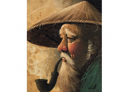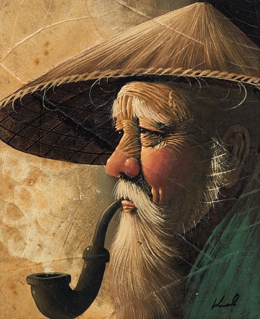 'גבר מעשן מקטרת' - ציור תאילנדי, שמן על נייר אורז ועלים
