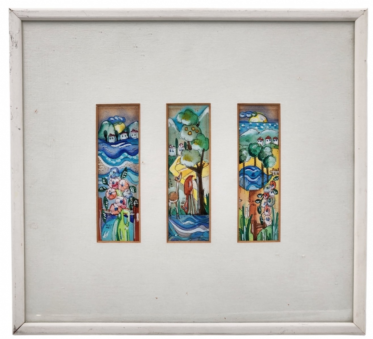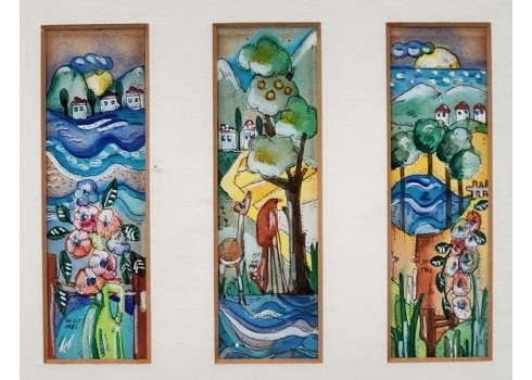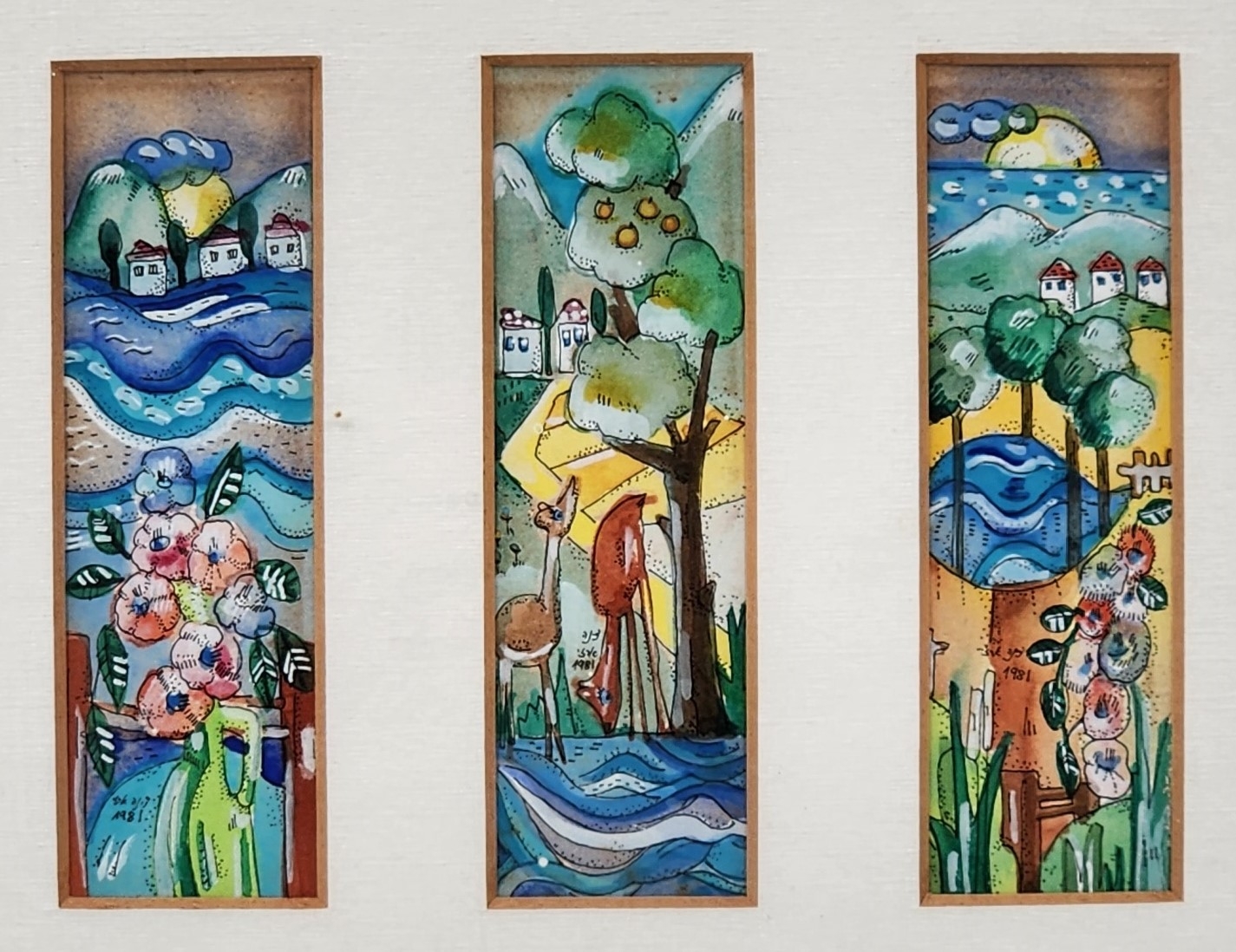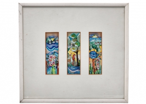 דינה ארזי - טריפטיך' - אקוורל על נייר, חתום ומתוארך: 1981, מידות כל ציור: 14X4.5 ס"מ, מידות המסגרת: 33X35.5 ס"מ.