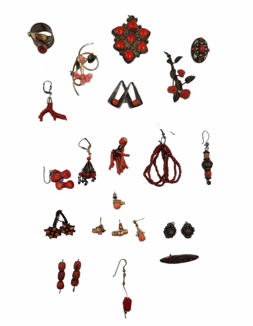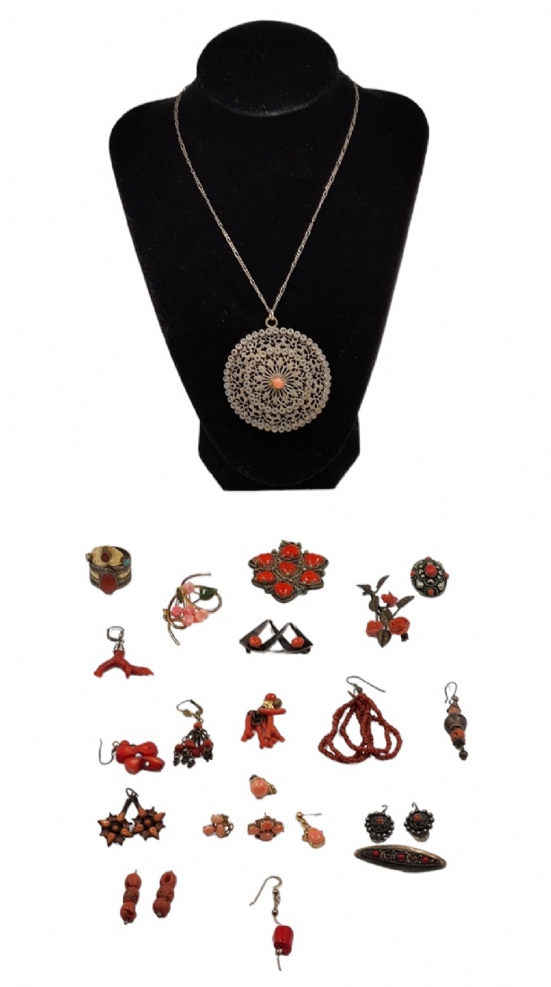 לוט של 24 תכשיטים עשויים מתכות שונות בתוכן כסף, כסף נמוך ועוד, וקורלים