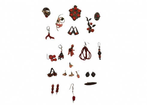 לוט של 24 תכשיטים עשויים מתכות שונות בתוכן כסף, כסף נמוך ועוד, חלקם הגדול משובצים קורלים, גובה התליון בצורת אשכול ענבים: 6 ס"מ, קוטר התליון העגול הגדול: 6 ס"מ.