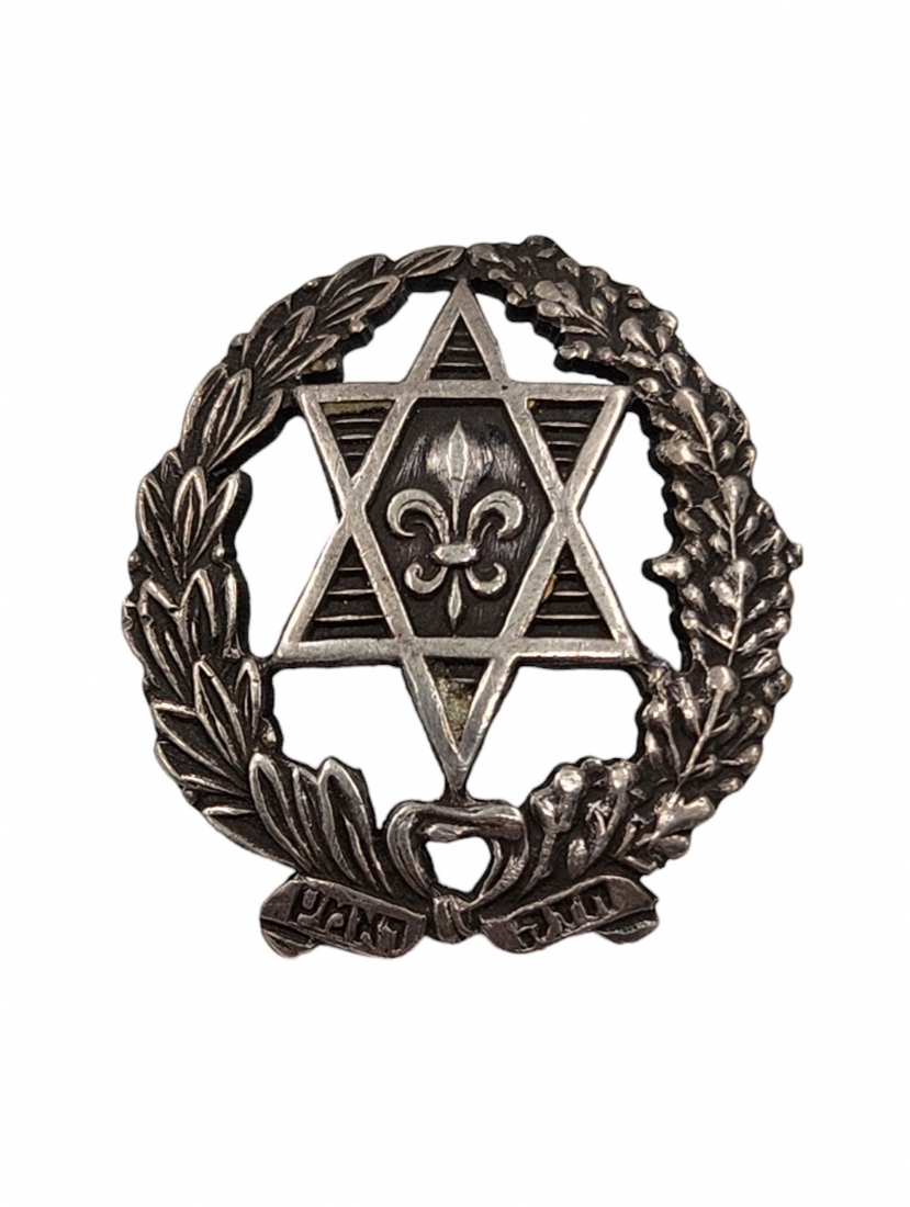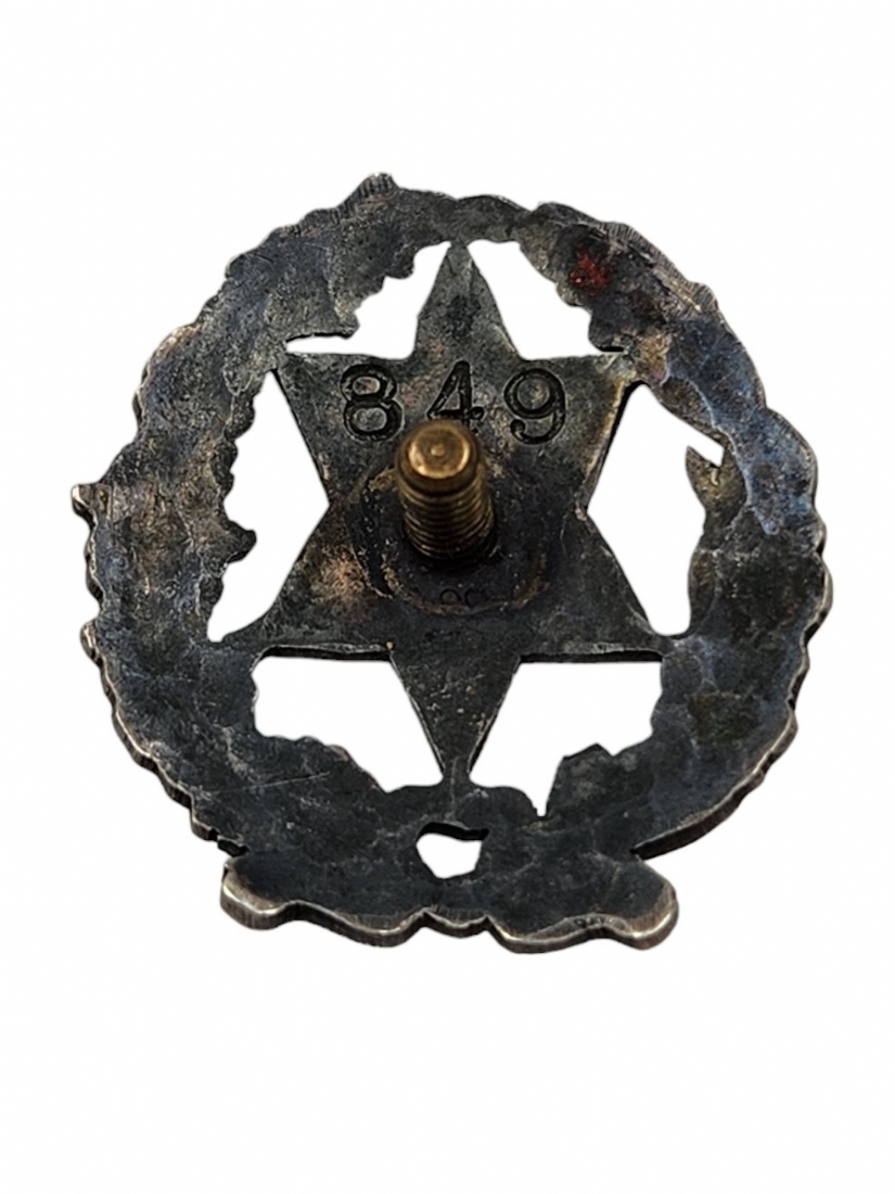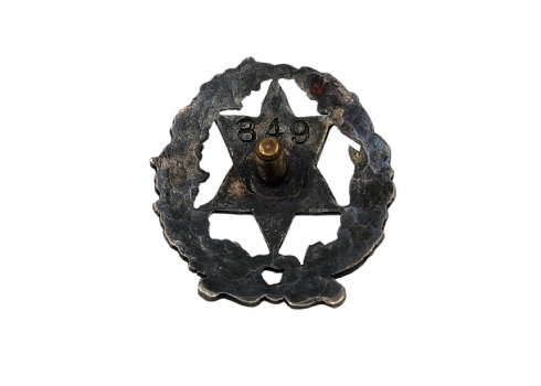 סיכה של השומר הצעיר, עשויה כסף ומעוטרת בכיתוב: "חזק ואמץ" ממוספרת מאחור: 849, רוחב: 3 ס"מ, גובה: 3 ס"מ.