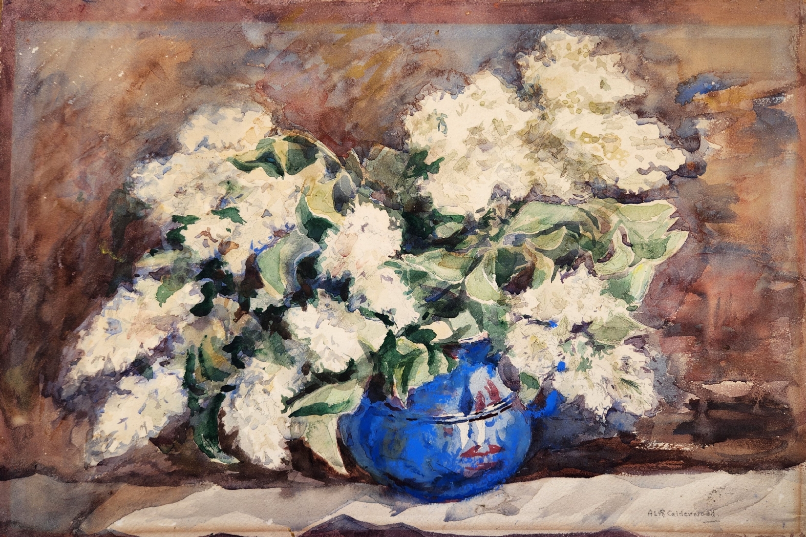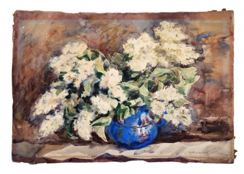'פרחים בסיר כחול' - גואש ואקוורל על נייר, חתום (נשמח לעזרה בזיהוי האמן), ללא מסגרת, מידות: 39X57 ס"מ.