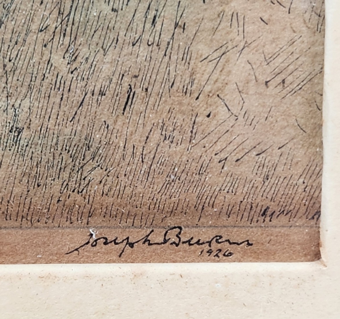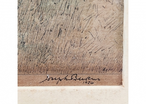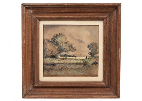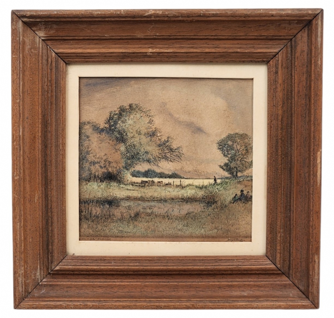 'עמק סקוטי' - ציור בן כמאה שנה, דיו ואקוורל על נייר, חתום, מתוארך 1926 ונושא את שם היצירה, מידות: 17X18 ס"מ, מידות המסגרת: 31.5X32.5 ס"מ.