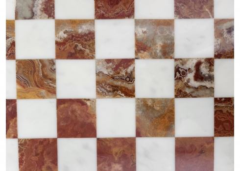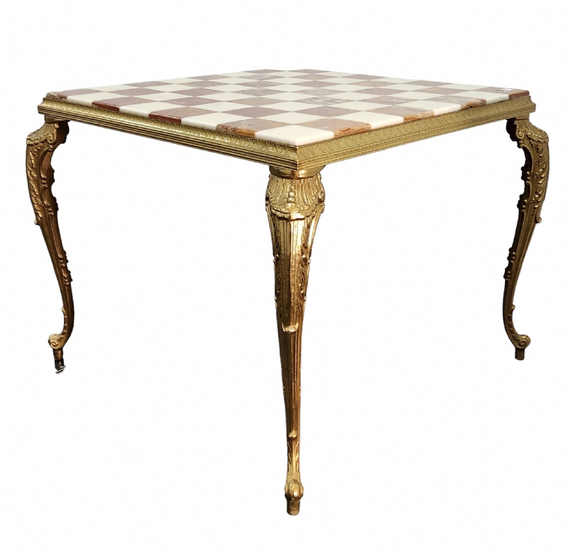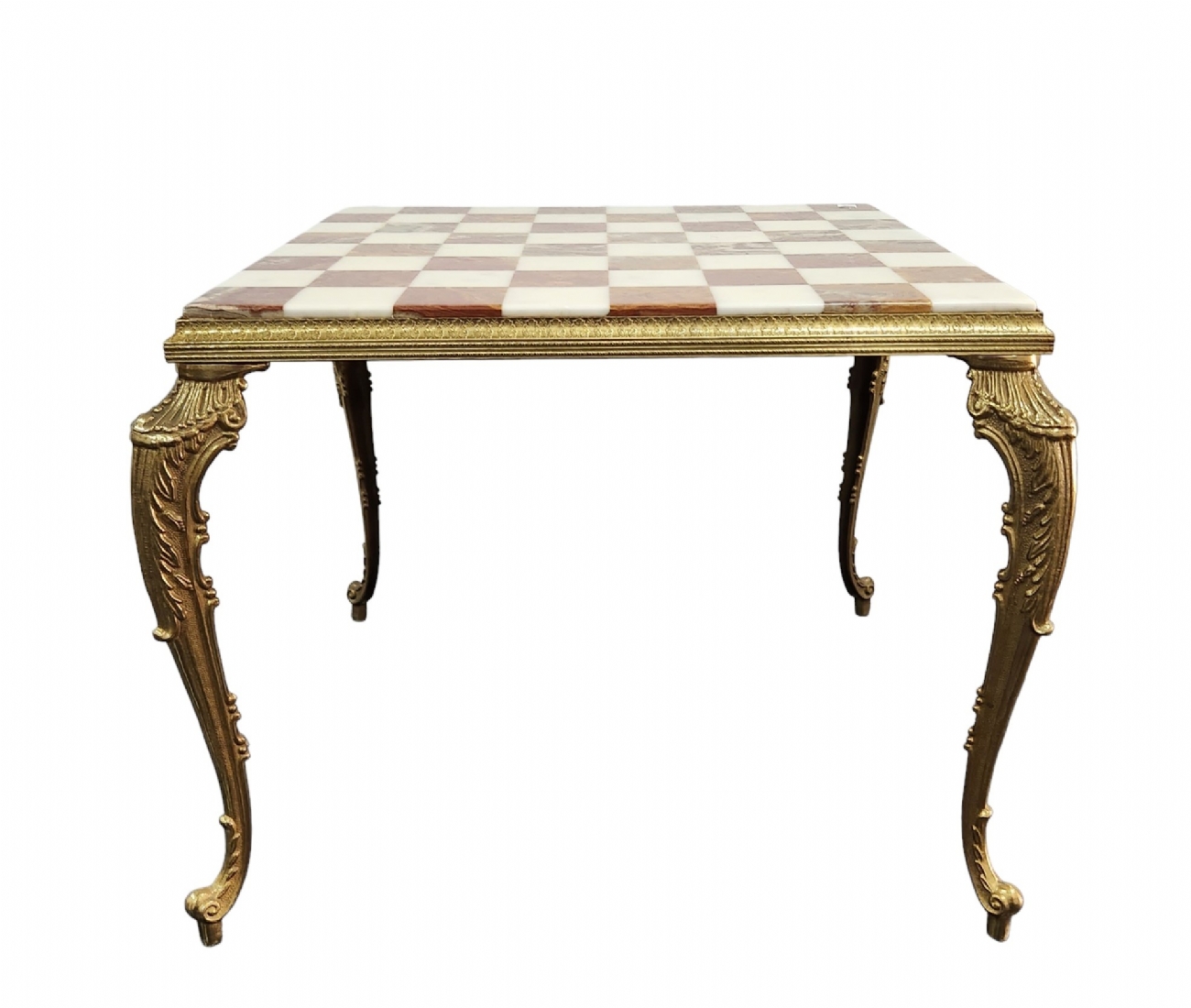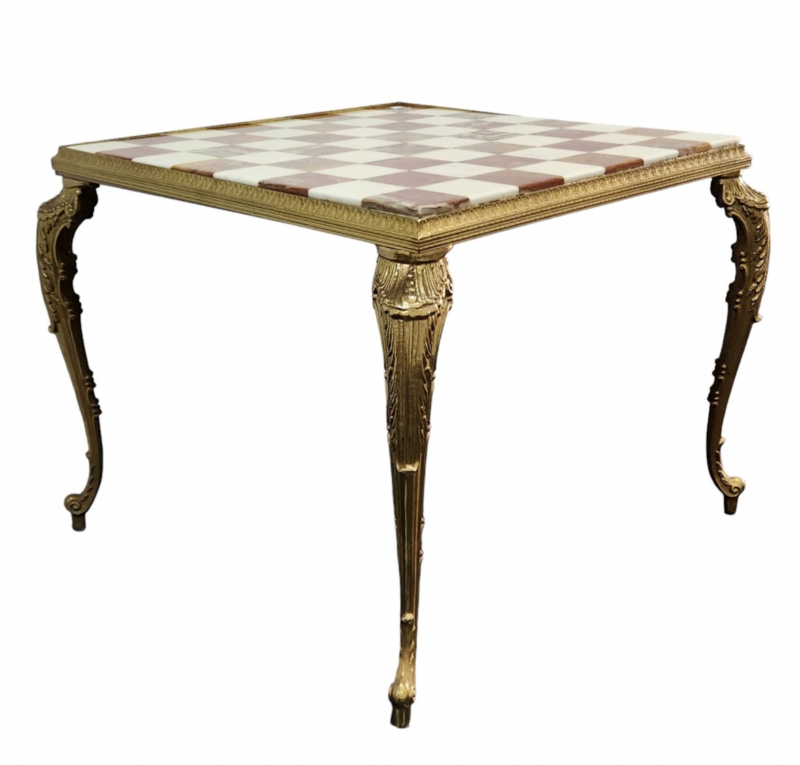 שולחן שחמט / דמקה דקורטיבי סלוני עשוי פליז יצוק ומשטח עליון עשוי שני סוגי אוניקס מצרי בגווני ירוק בהיר וחום, גובה כולל: 42 ס"מ, אורך ורוחב כללי: 53.5X53.5 ס"מ, מידות המשטח העליון: 48X48 ס"מ.