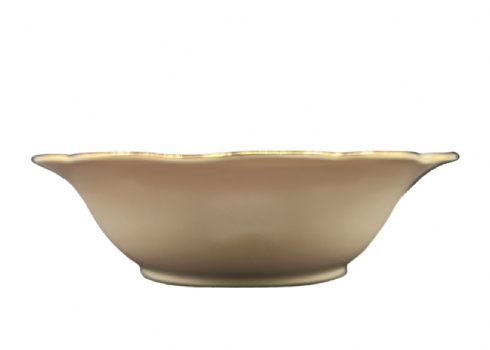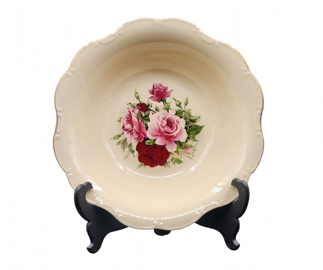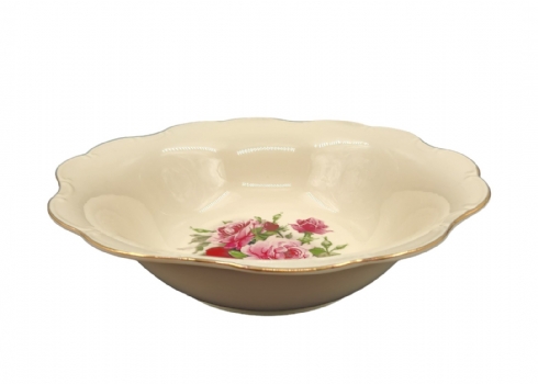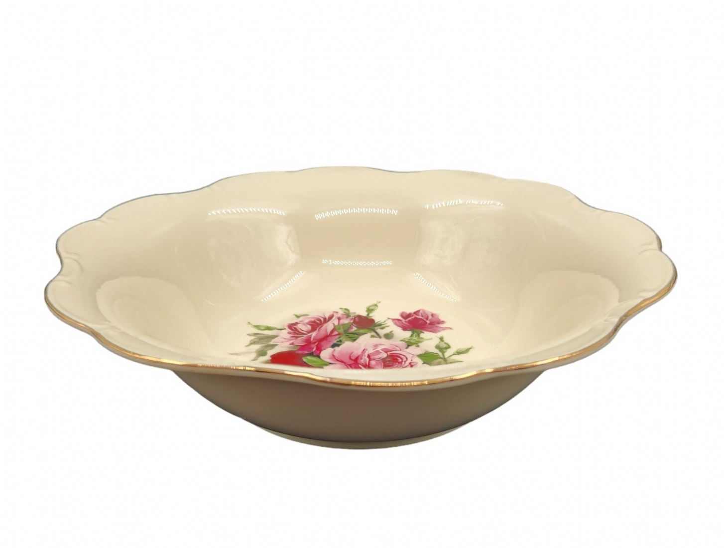 קערה עמוקה להגשת פירות.מעוטרת בהדפס של שושנים פורחות ופס זהב, חתומה.עומק: 8.5 ס"מ.קוטר: 30 ס"מ.