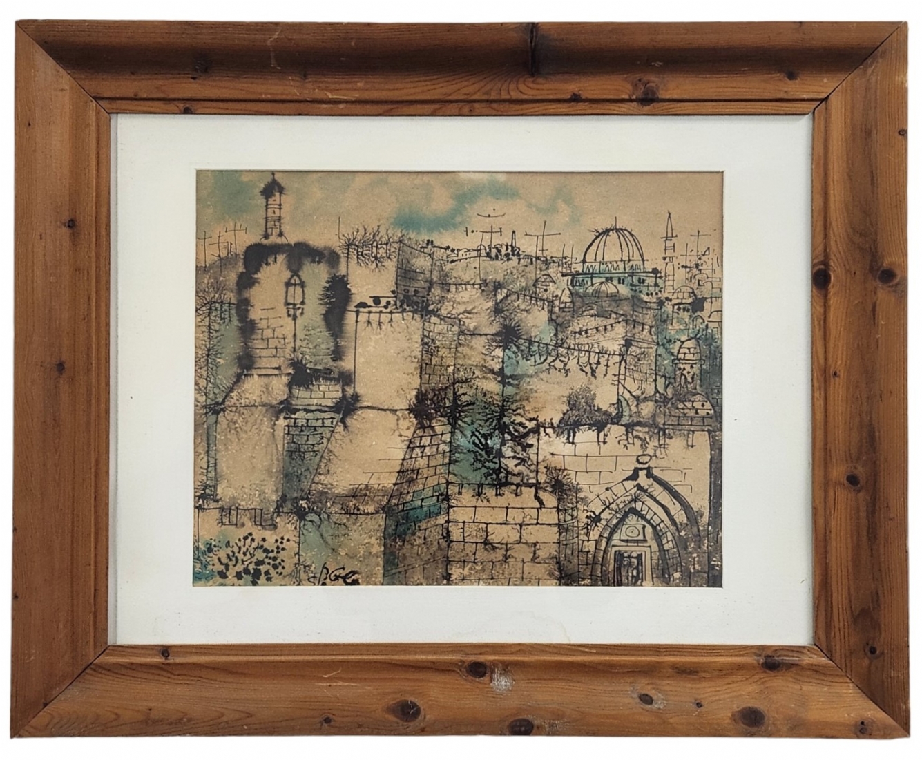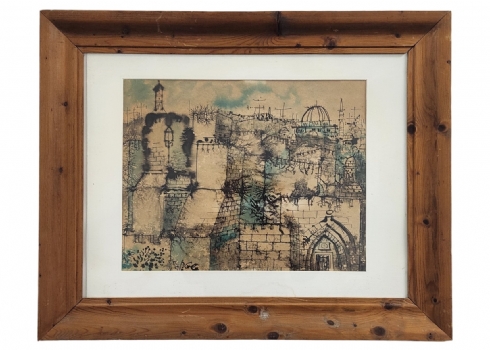 יוסי שטרן (Joseph Stern) - 'ירושלים' - ציור דיו ואקוורל על נייר, חתום, מידות: 37X48 ס"מ, מידות המסגרת: 63X78 ס"מ.