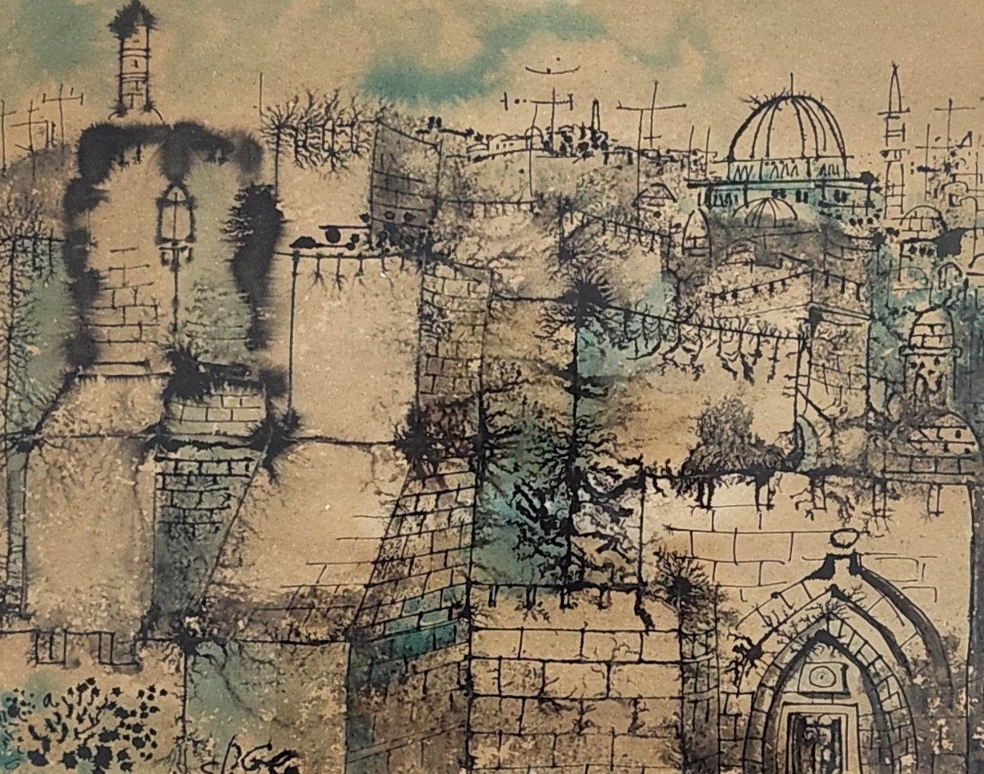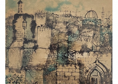 יוסי שטרן (Joseph Stern) - 'ירושלים' - ציור דיו ואקוורל על נייר, חתום