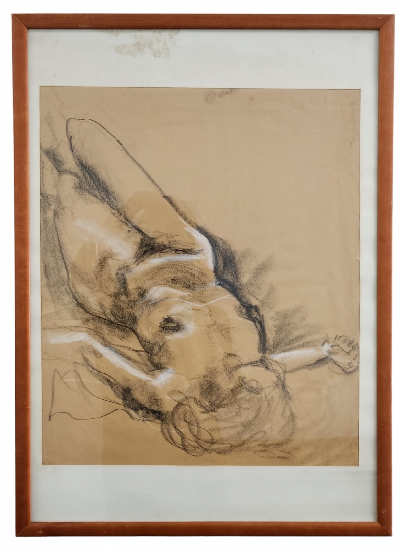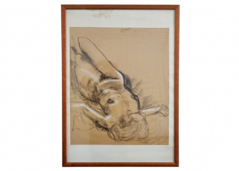 'עירום נשי' - רישום פחם וגירי פנדה על נייר, לא חתום, כתמים לפספרטו, מידות: 53X44.5 ס"מ, מידות המסגרת: 73X53.5 ס"מ.