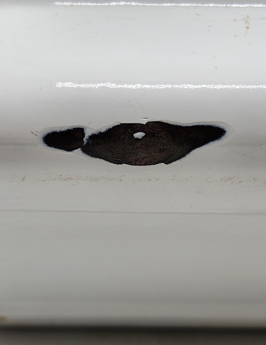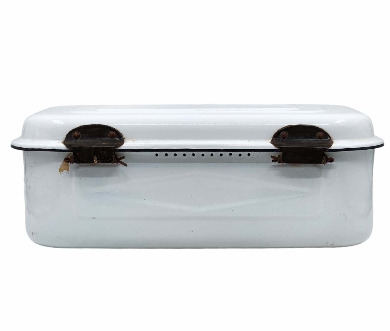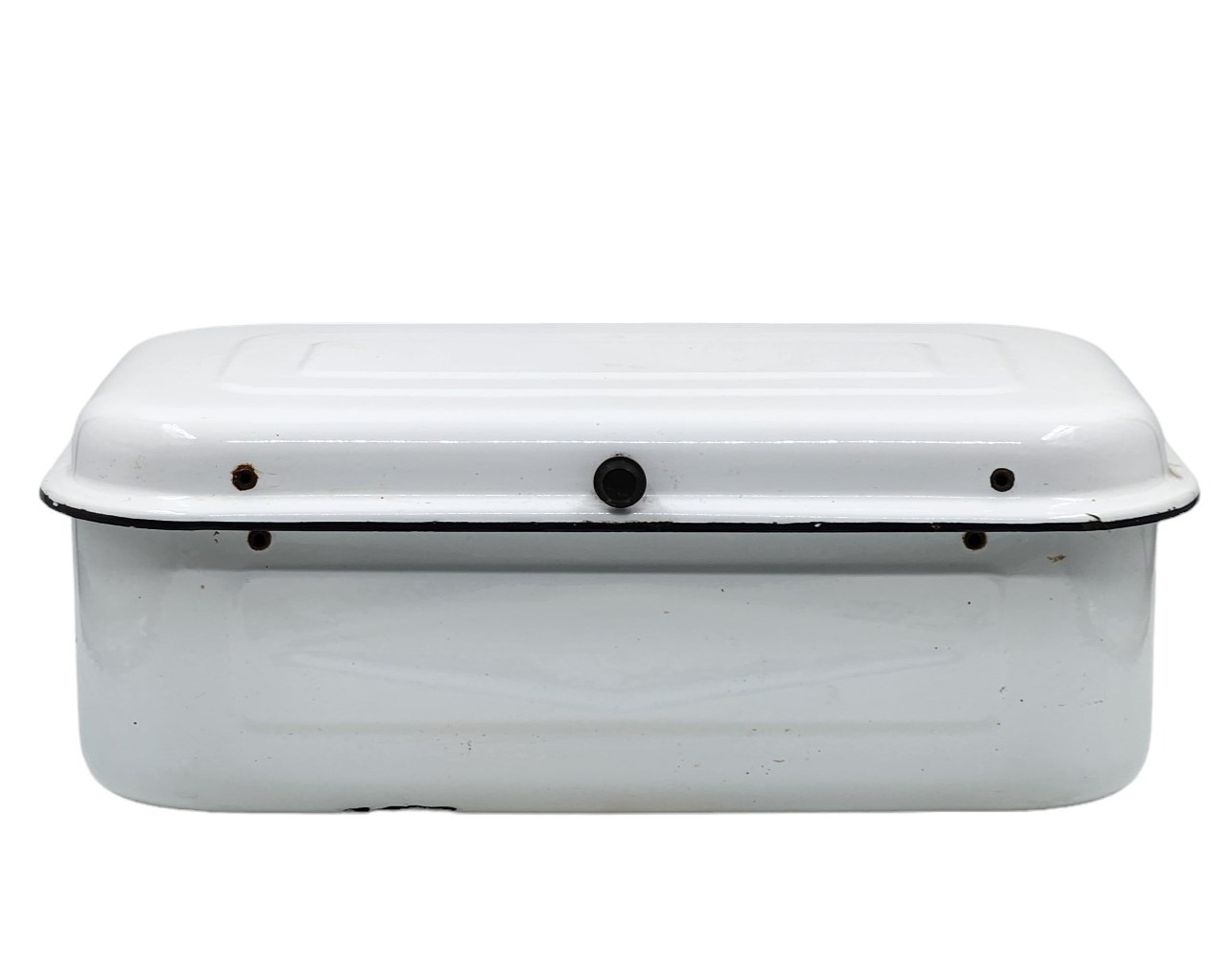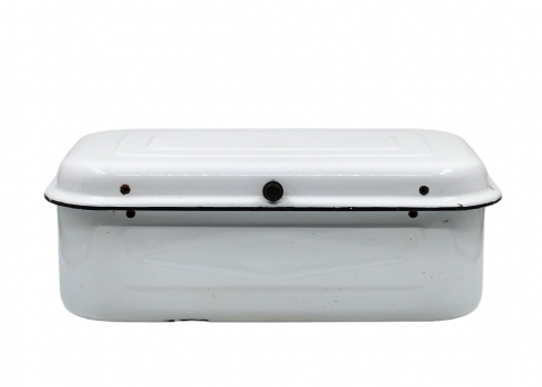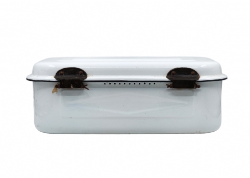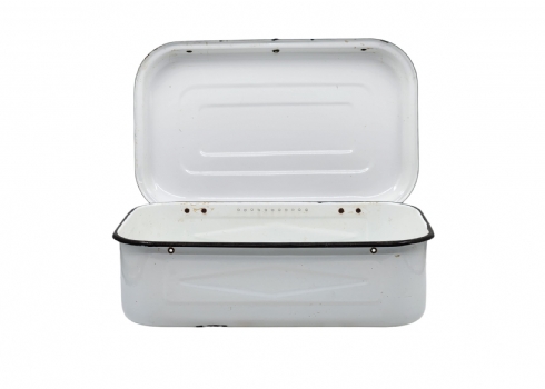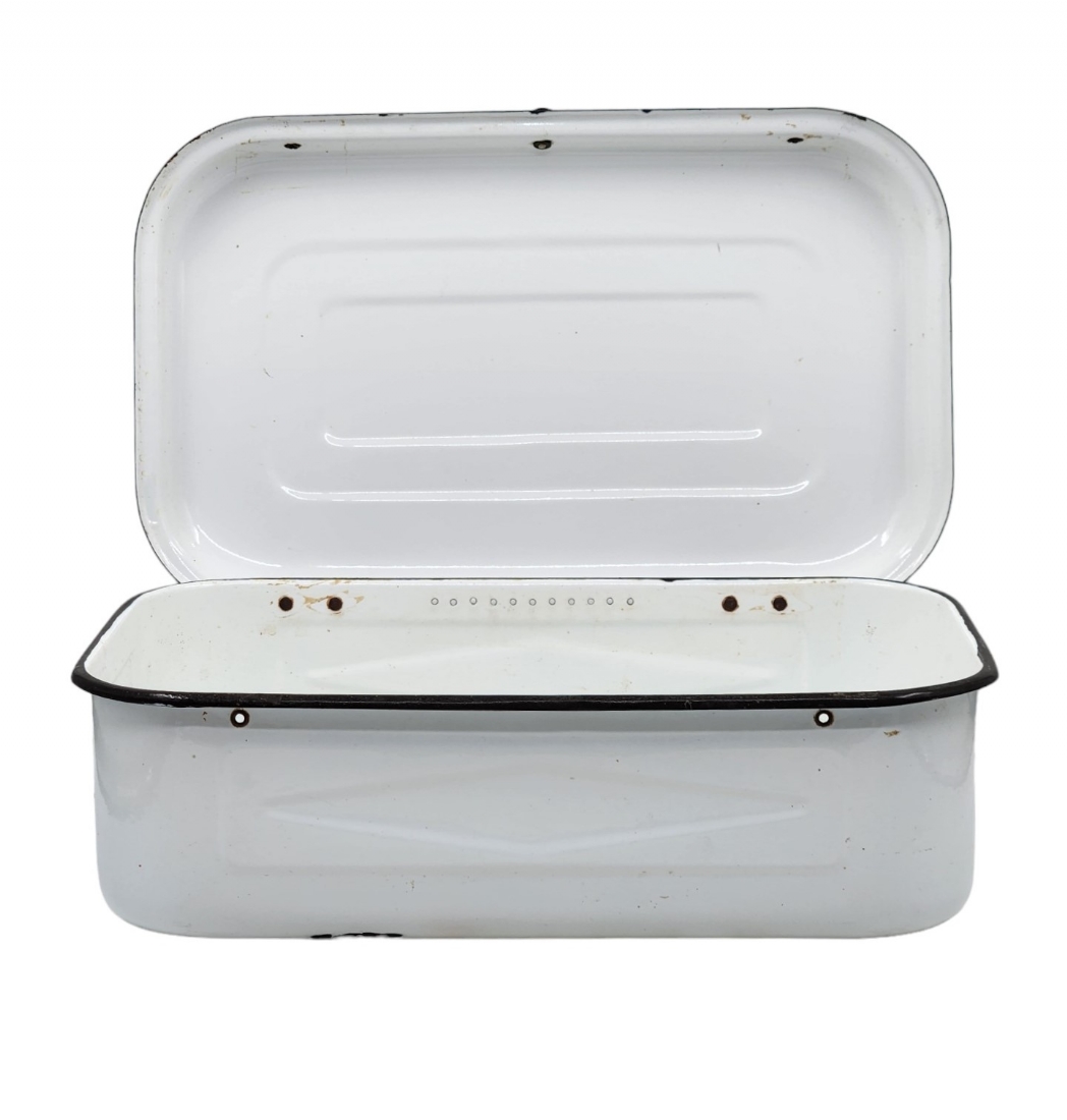 תיבת אמייל ישנה ללחם, שפשוף בתחתית, גובה: 15 ס"מ, אורך: 44.5 ס"מ, רוחב: 27 ס"מ.