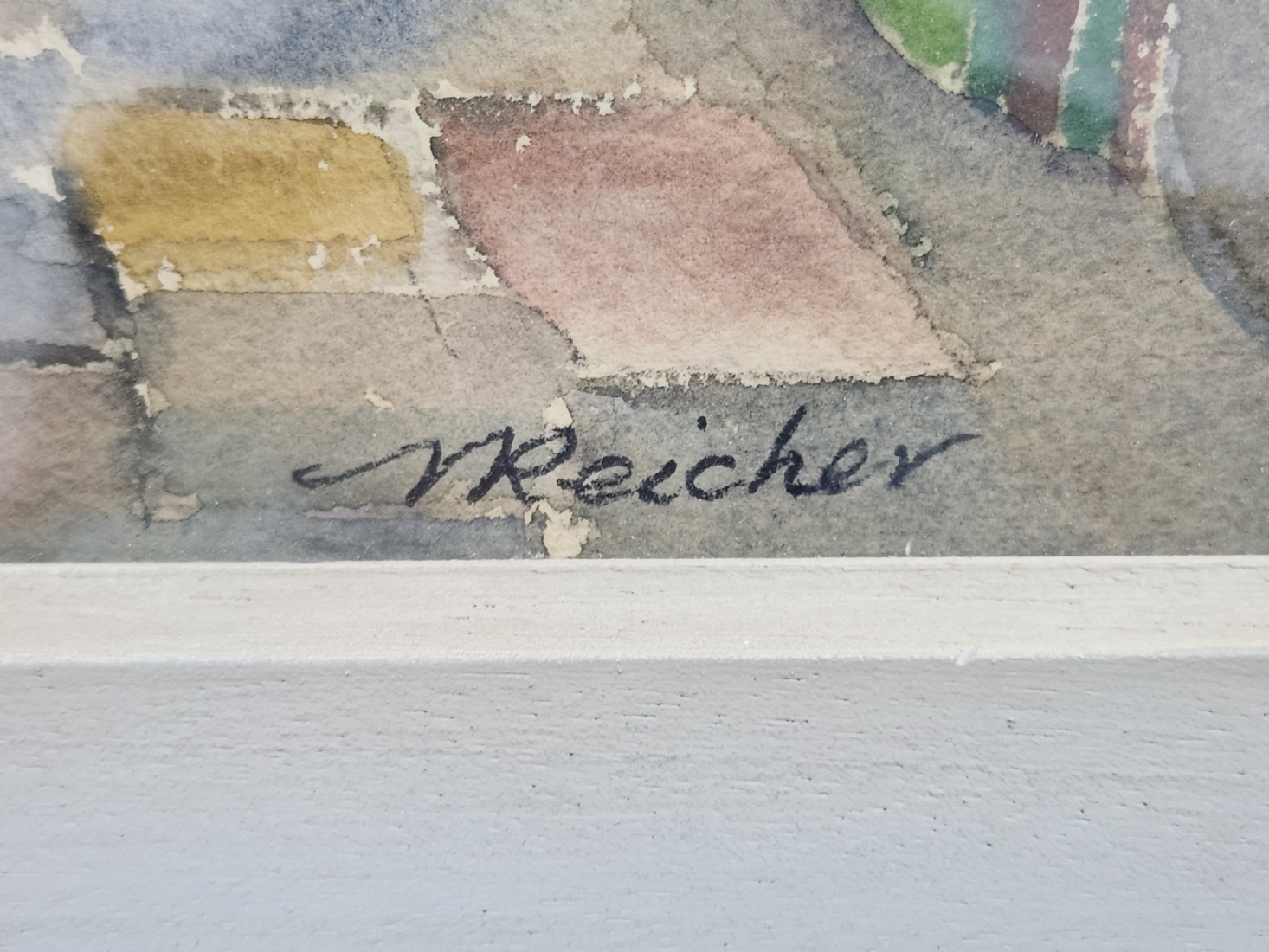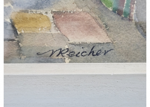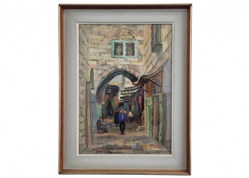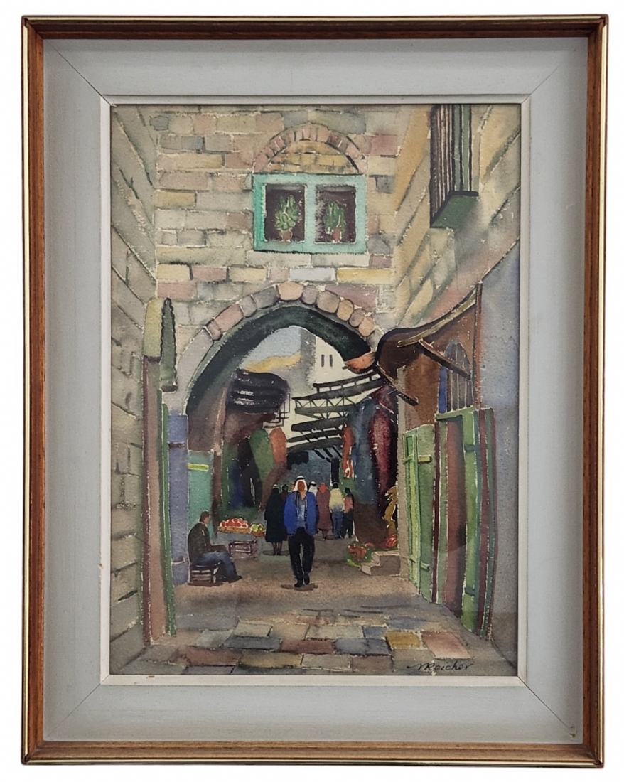 יצחק רייכר איגנץ (Itzchak Reicher) - 'דמויות בסמטה ירושלמית' - אקוורל על נייר, חתום, מידות: 55X40 ס"מ, מידות המסגרת: 69X53 ס"מ.