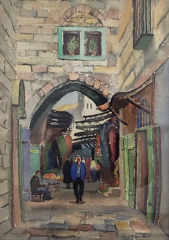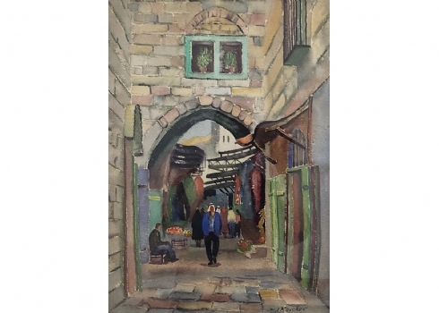 יצחק רייכר איגנץ (Itzchak Reicher) - 'דמויות בסמטה ירושלמית' - אקוורל על נייר