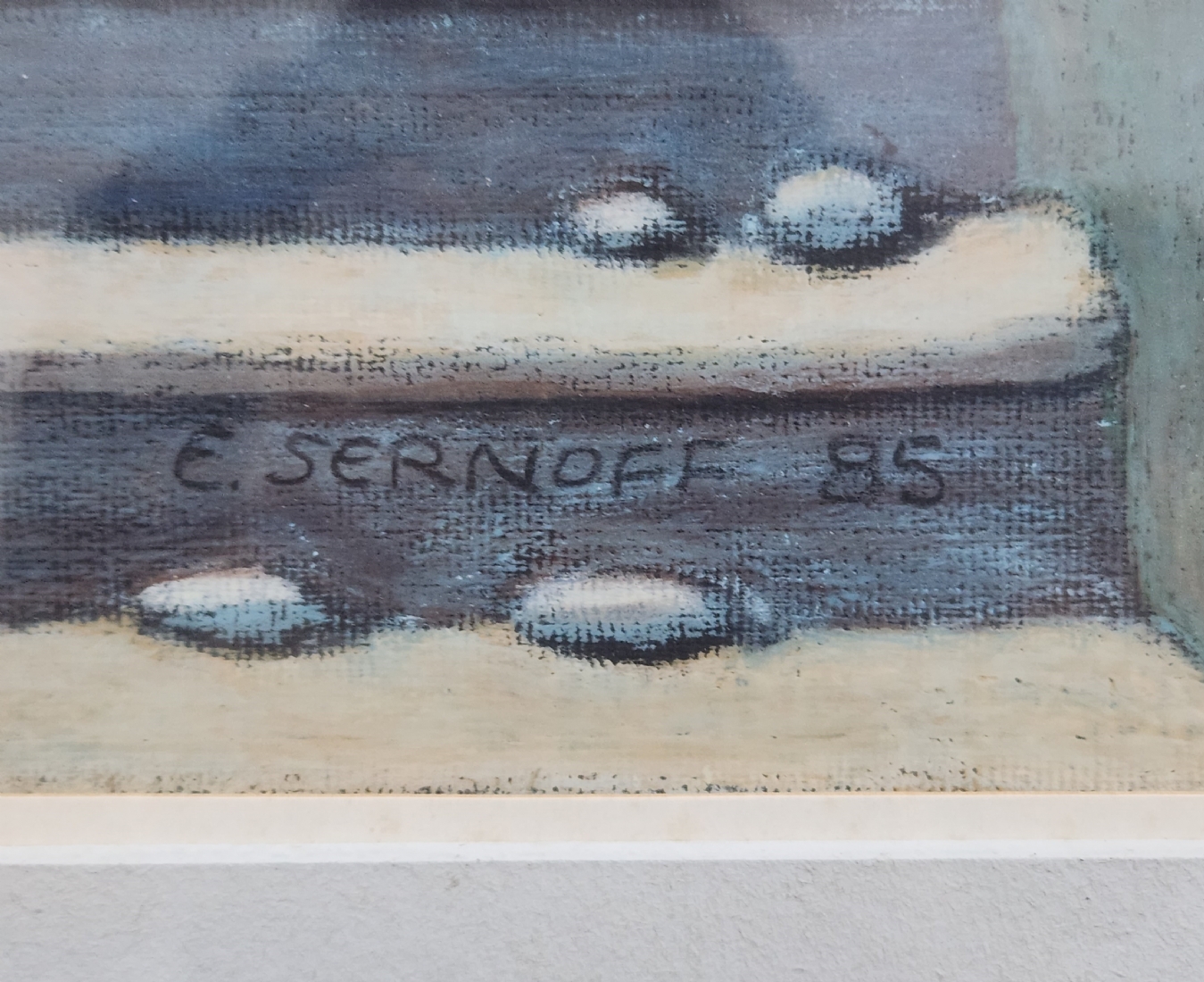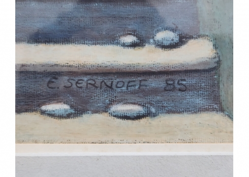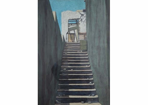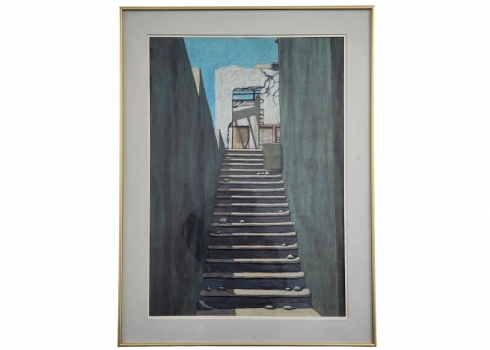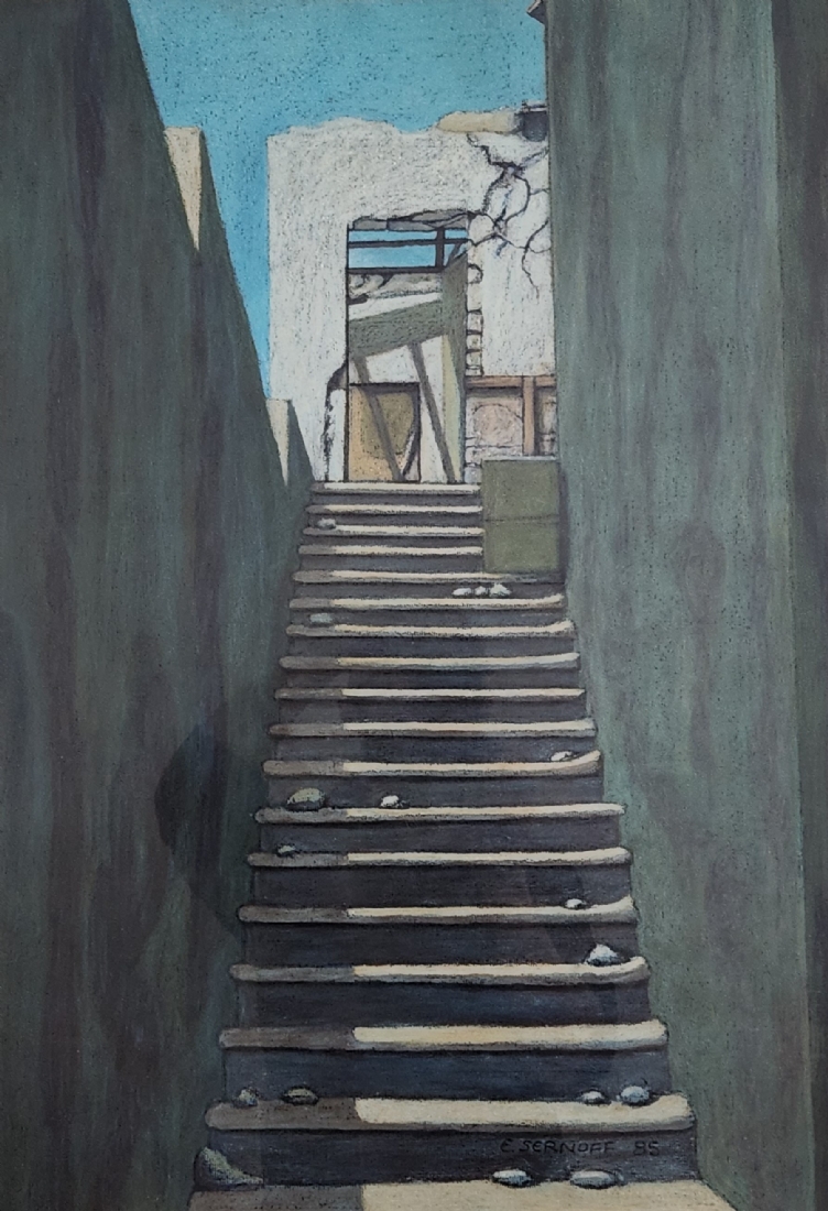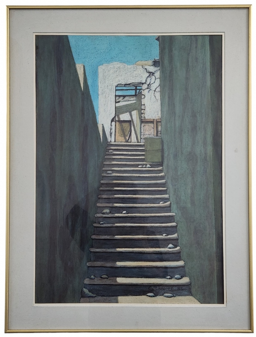 אד סרנוף (צייר ישראלי מעין הוד, Ed Sernoff) - 'מדרגות לשמים' - גירי פנדה על נייר, חתום, נושא בגב את שם היצירה, מתוארך לשנת: 1985, מידות: 70X48 ס"מ, מידות המסגרת: 83X63 ס"מ.
