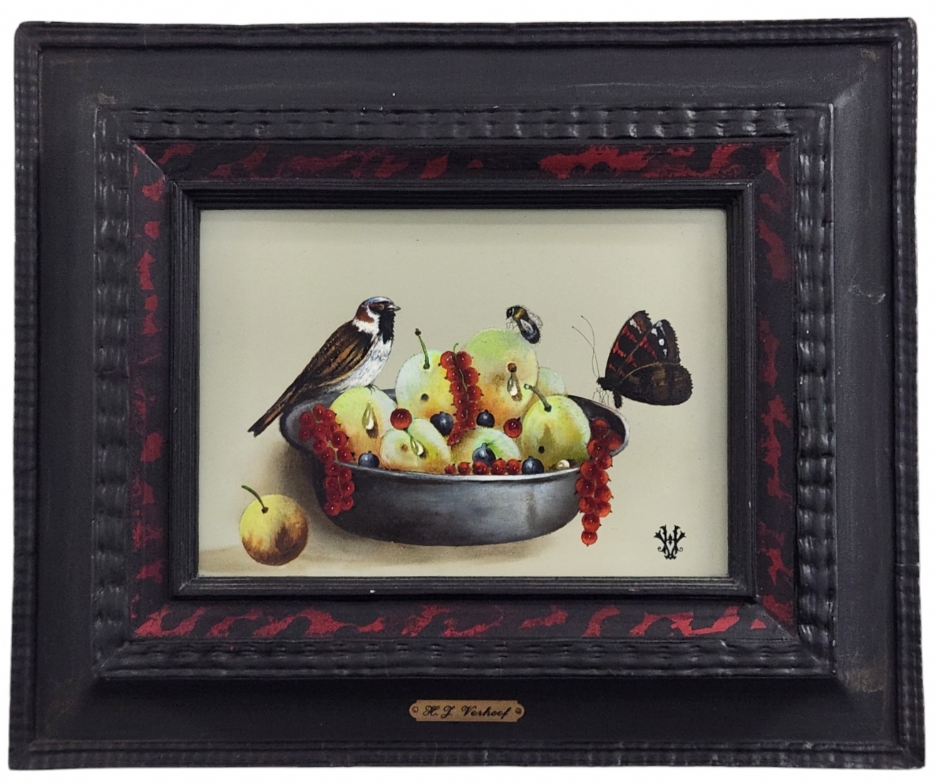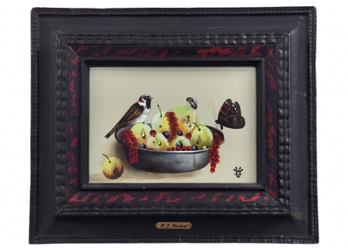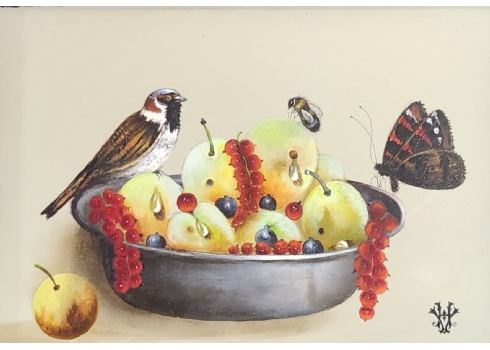 הנס ורהוף (Verhoef Hans) - 'ציפור דבורה ופרפר על קערת פירות'