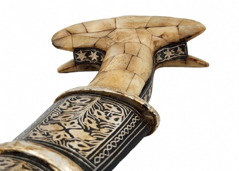 קישוט עשוי מתכת ועצם.