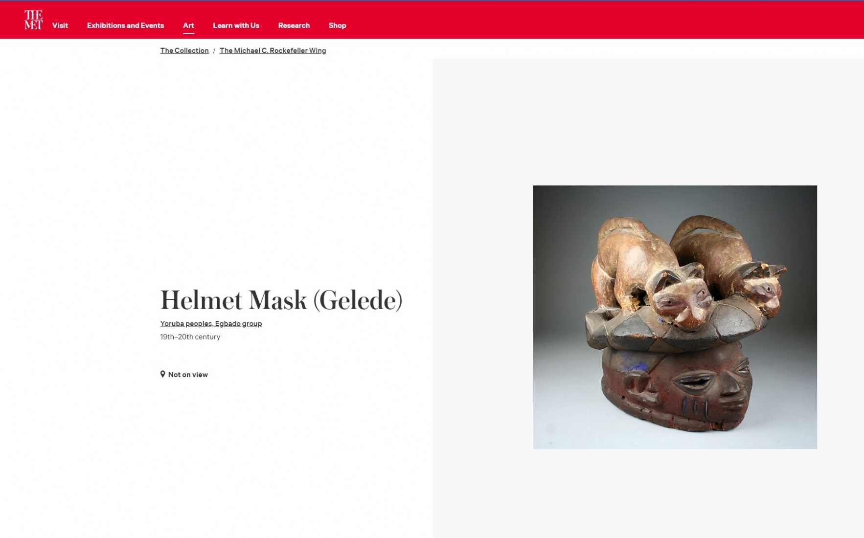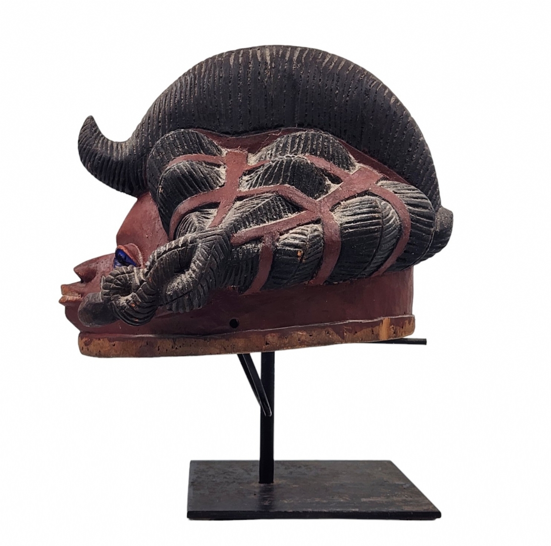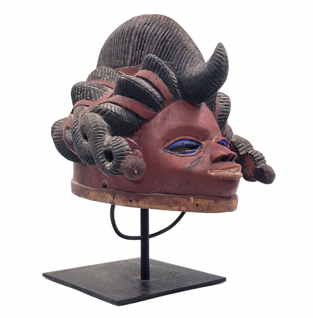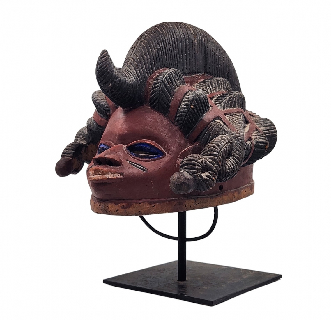 מסכה אפריקאית מסוג 'Gelede mask' של אנשי הירובה (Yoruba) מניגריה, עשויה עץ מגולף וצבוע פיגמנט אדום ושחור, המסכה נרכשה על ידי הבעלים הנוכחי בגלריה בדרום אפריקה בשנות השבעים של המאה העשרים, גובה המסכה עצמה: 33 ס"מ, גובה כולל המעמד היעודי: 44 ס"מ, רוחב: 30 ס"מ.