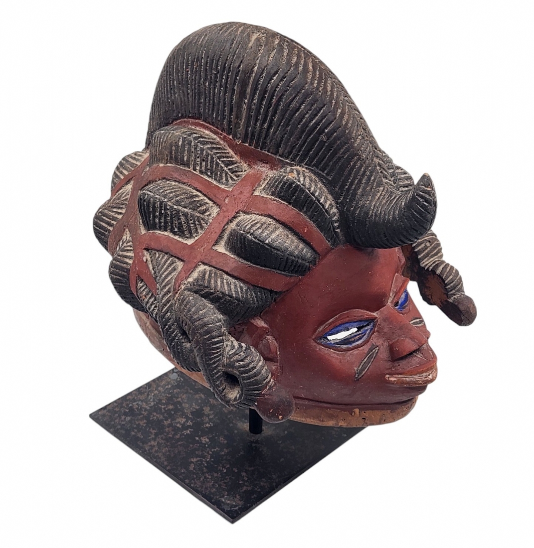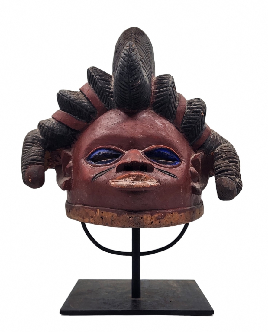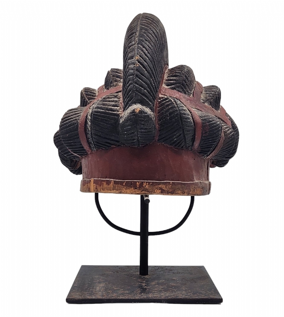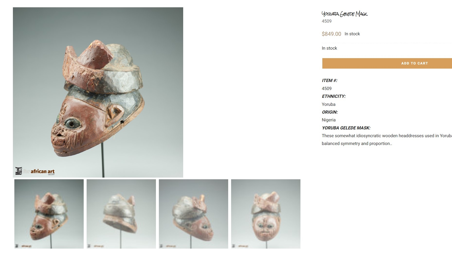 מסכה אפריקאית מסוג 'Gelede mask' של אנשי הירובה (Yoruba) מניגריה, עשויה עץ מגולף וצבוע פיגמנט אדום ושחור, המסכה נרכשה על ידי הבעלים הנוכחי בגלריה בדרום אפריקה בשנות השבעים של המאה העשרים, גובה המסכה עצמה: 33 ס"מ, גובה כולל המעמד היעודי: 44 ס"מ, רוחב: 30 ס"מ.