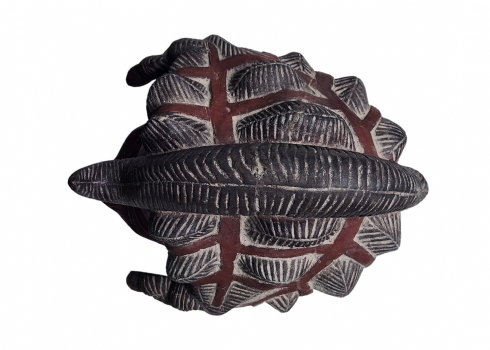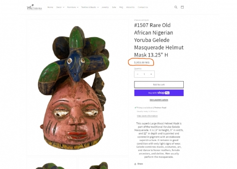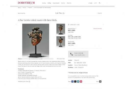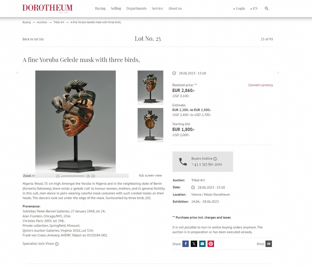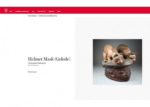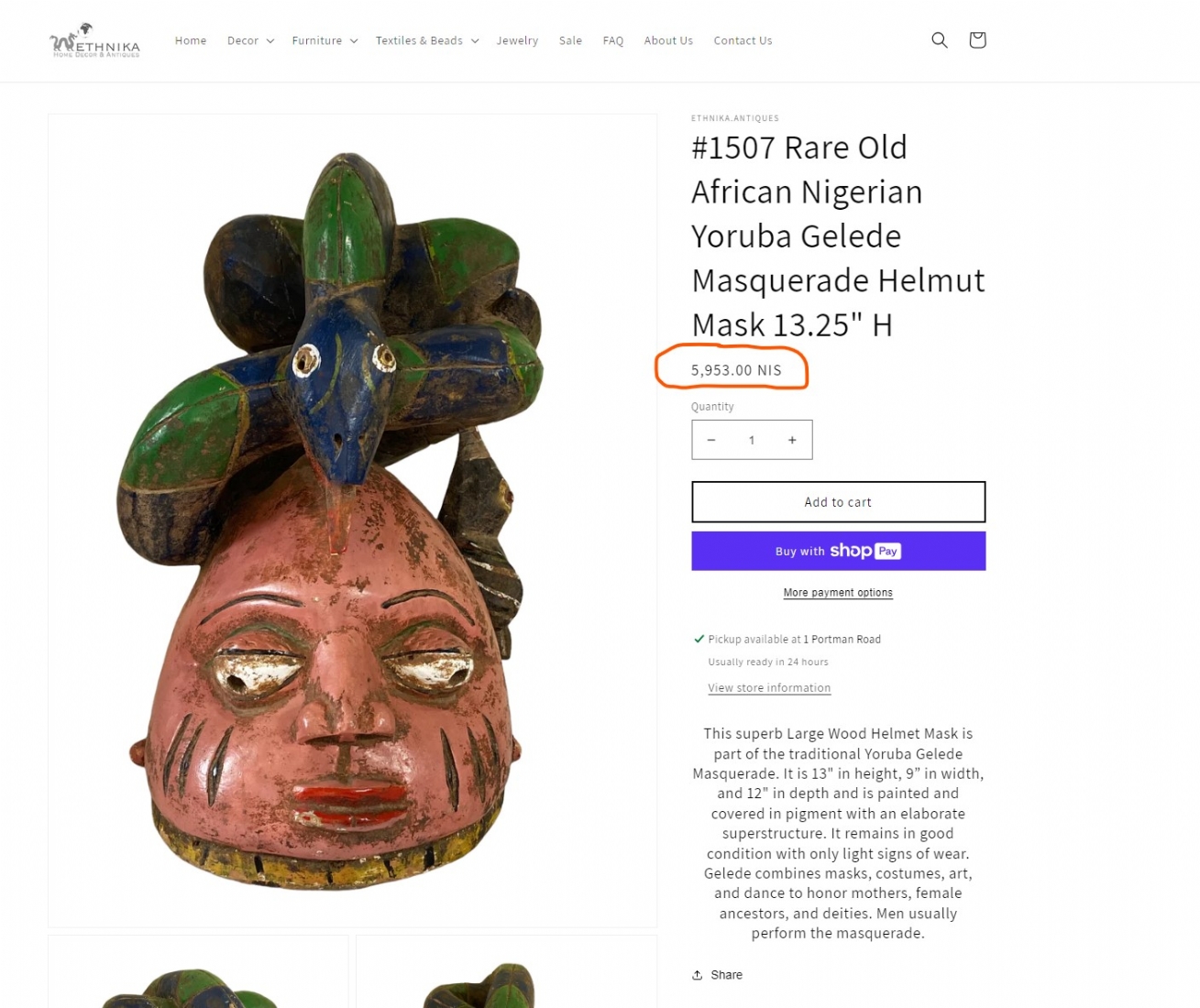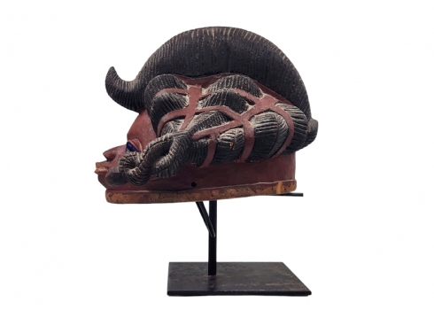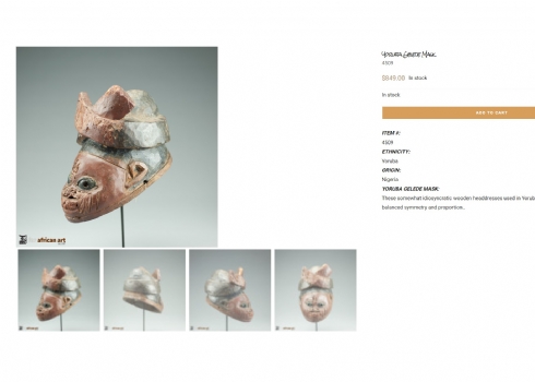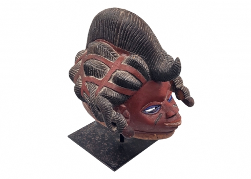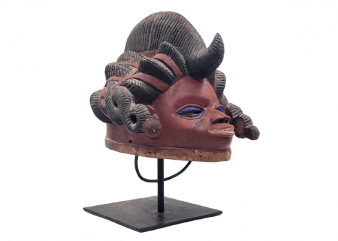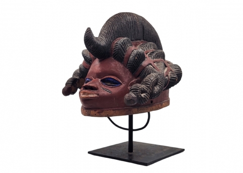 מסכה אפריקאית מסוג 'Gelede mask' של אנשי הירובה (Yoruba) מניגריה, עשויה עץ מגולף וצבוע פיגמנט אדום ושחור, המסכה נרכשה על ידי הבעלים הנוכחי בגלריה בדרום אפריקה בשנות השבעים של המאה העשרים, גובה המסכה עצמה: 33 ס"מ, גובה כולל המעמד היעודי: 44 ס"מ, רוחב: 30 ס"מ.