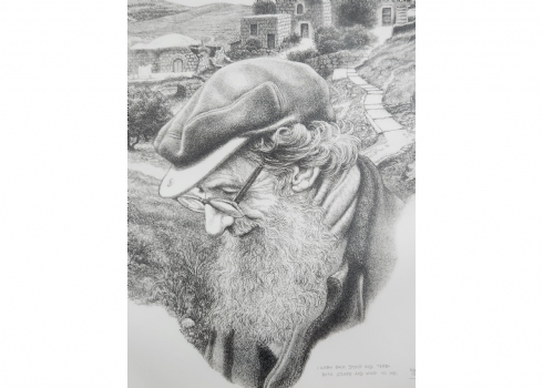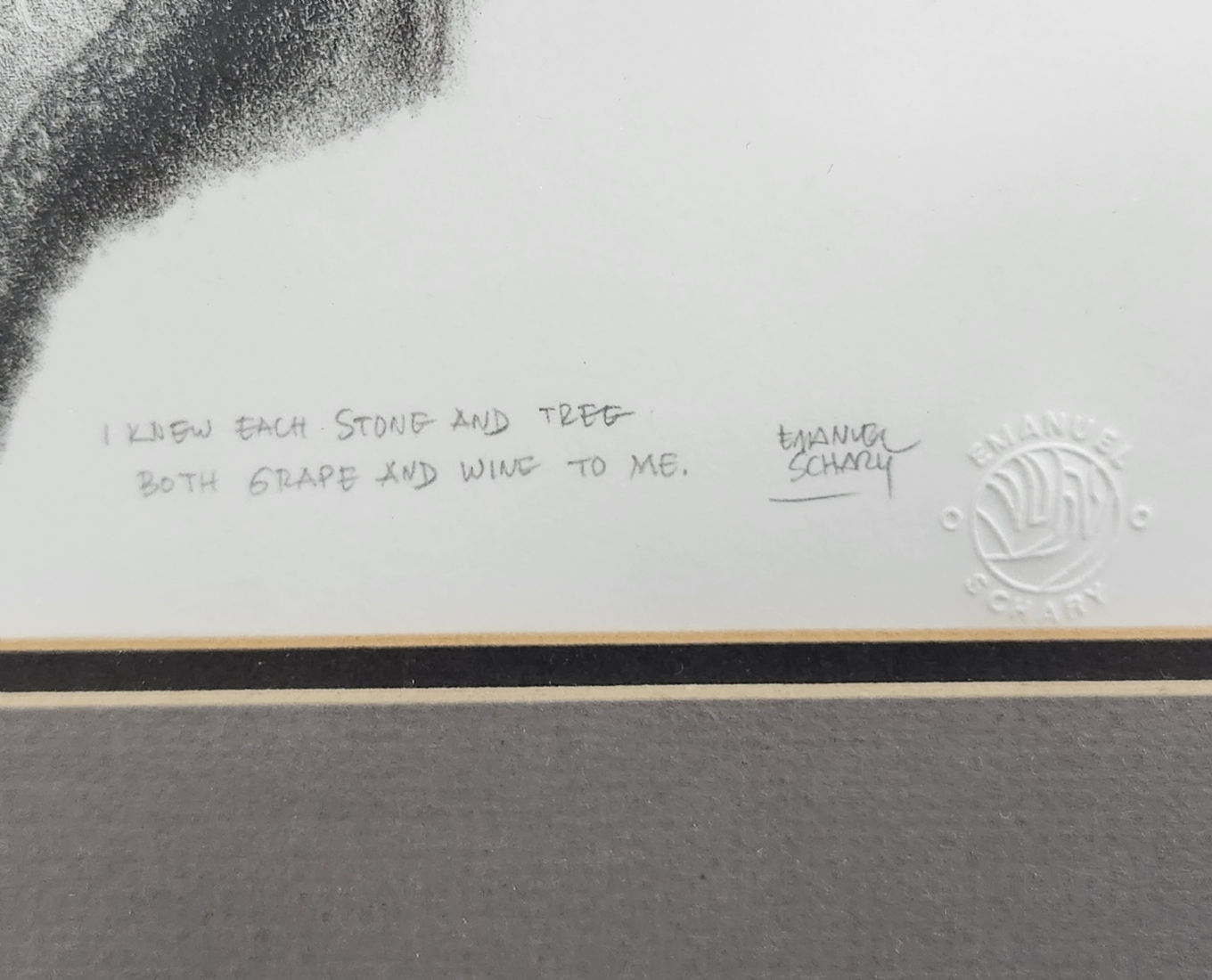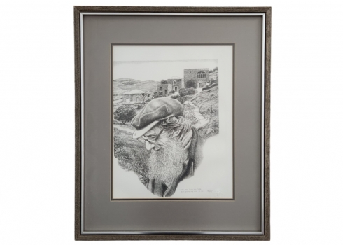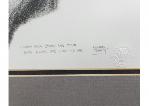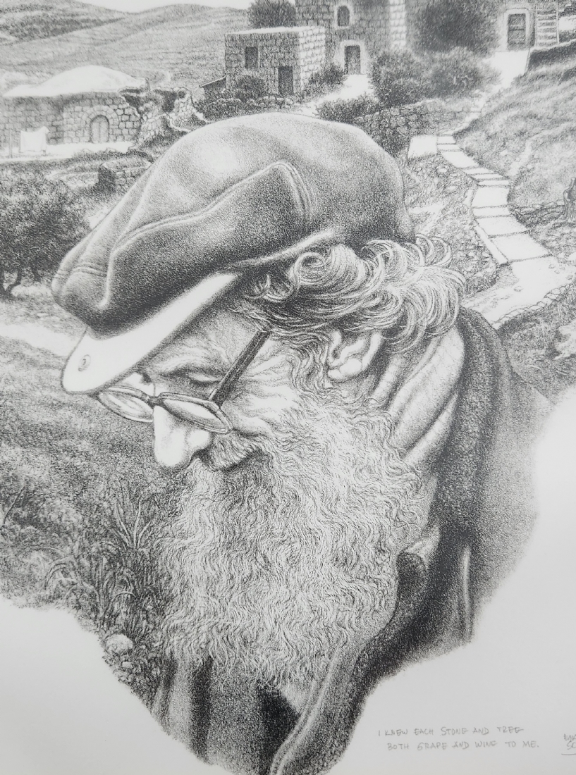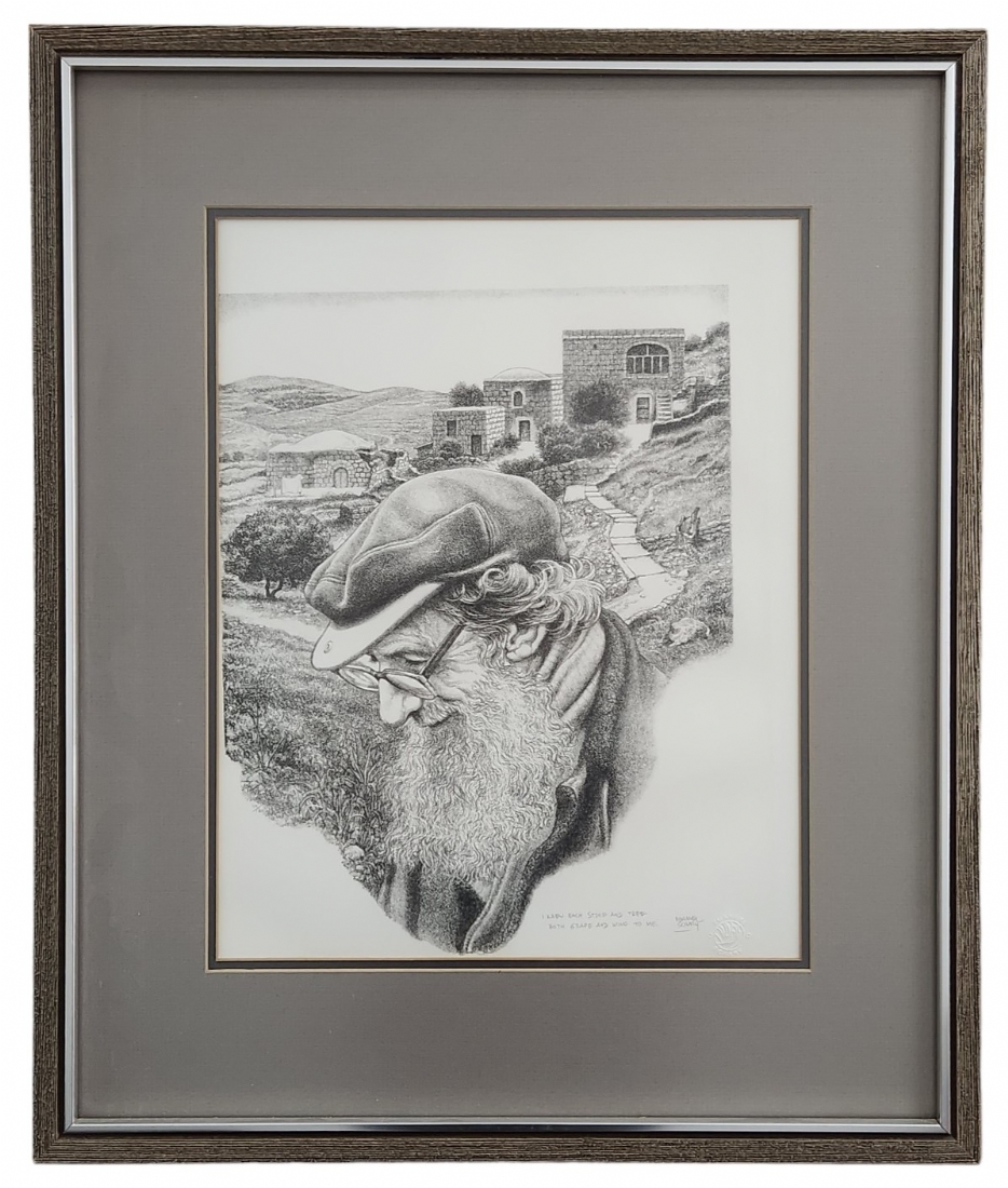 עמנואל שארי (Emanuel Schary, ארצות הברית/ישראל 1994 - 1924) - 'אני מכיר כל אבן וכל עץ', ליטוגרפיה, 1975, חתום בעיפרון ונושא את שם היצירה, 36.5X29 ס"מ, מידות המסגרת: 55.5X46.5 ס"מ.