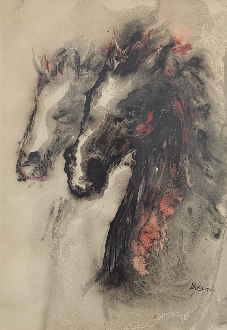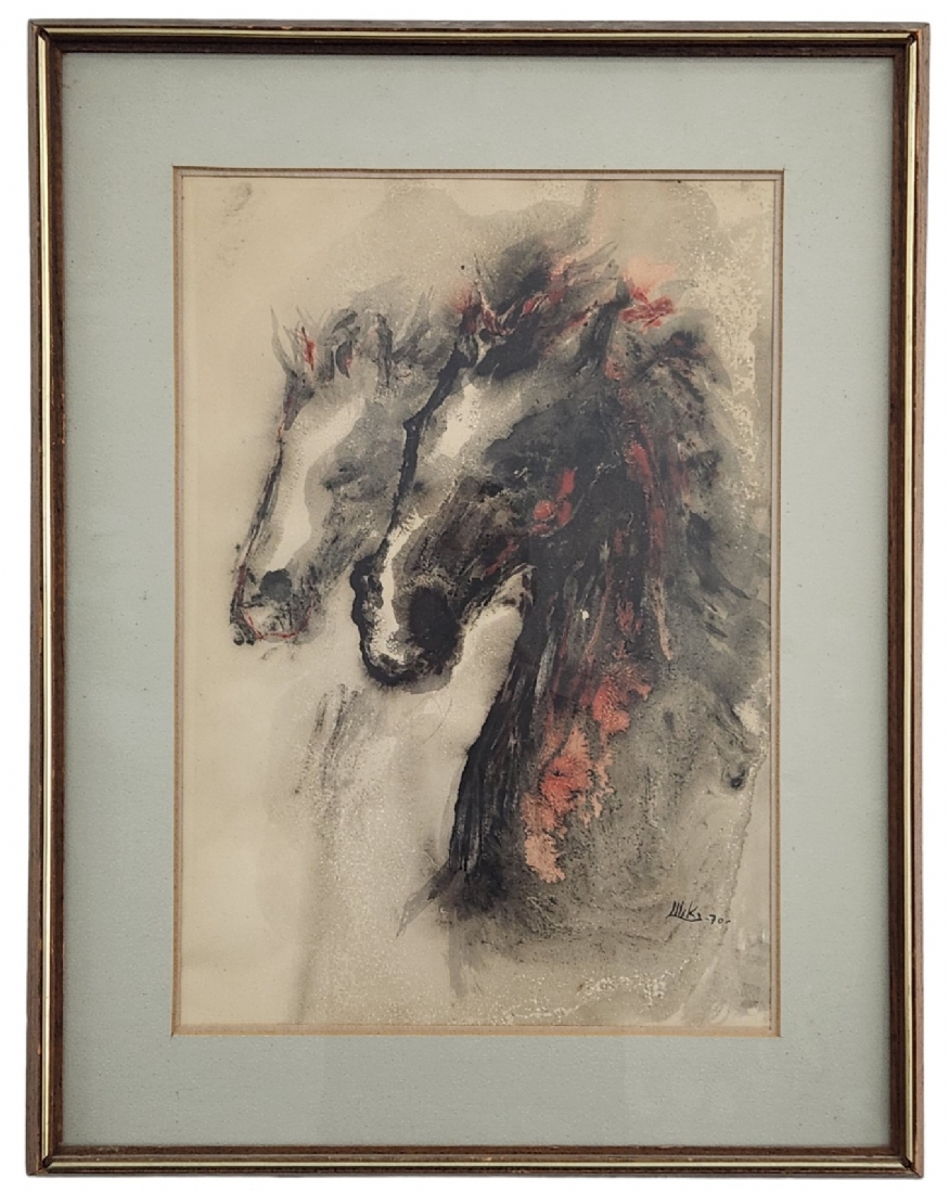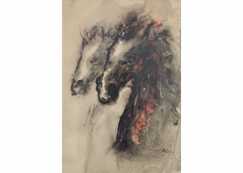 'זוג סוסים' - אקוורל על נייר, חתום ומתוארך 1970, מידות: 48.5X33.5 ס"מ.