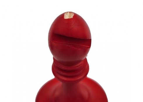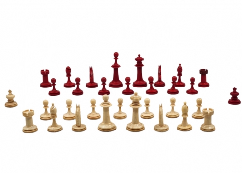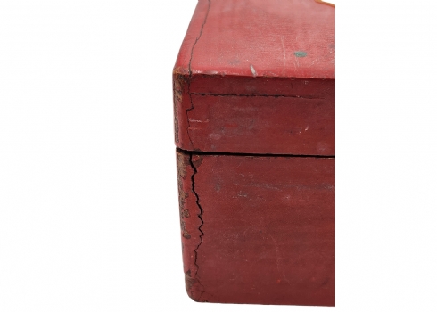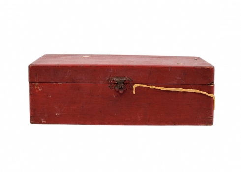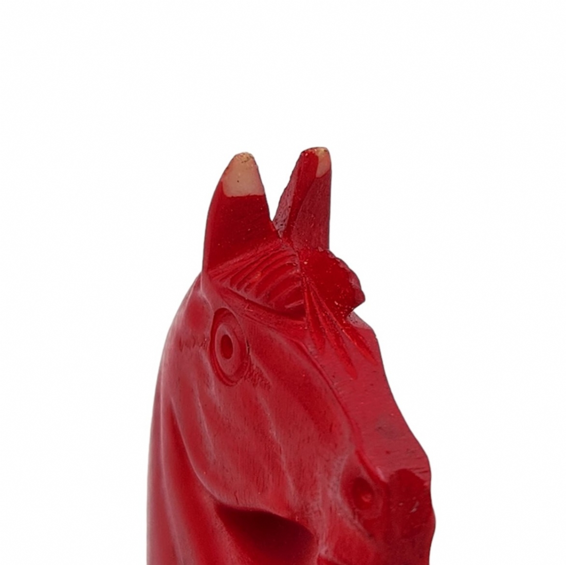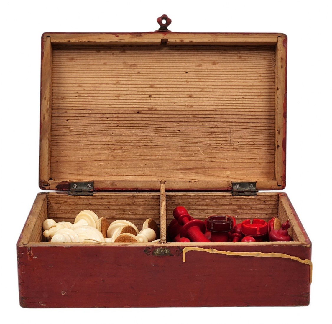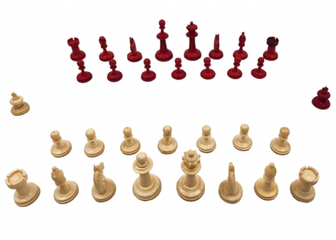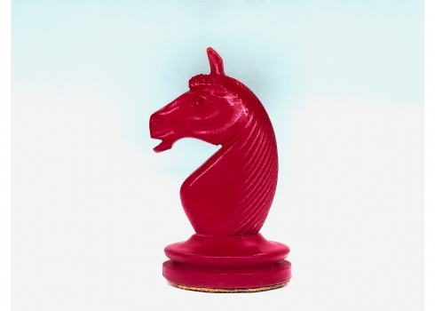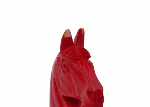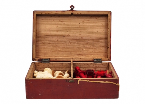 הכלים מגולפים בעבודת יד,חציים צבועים בגון אדום (ללא לוח), נתונים בתיבת עץ (פגם קטן לרץ ולשני הפרשים).גובה הפיון: 3.5 ס"מ.אורך התיבה: 20 ס"מ.