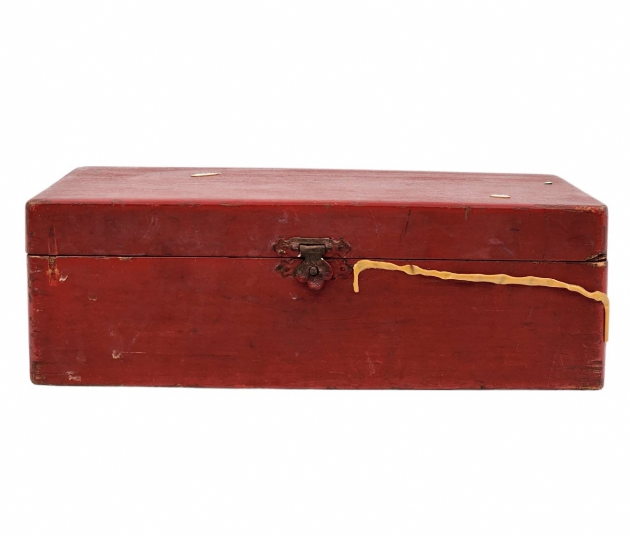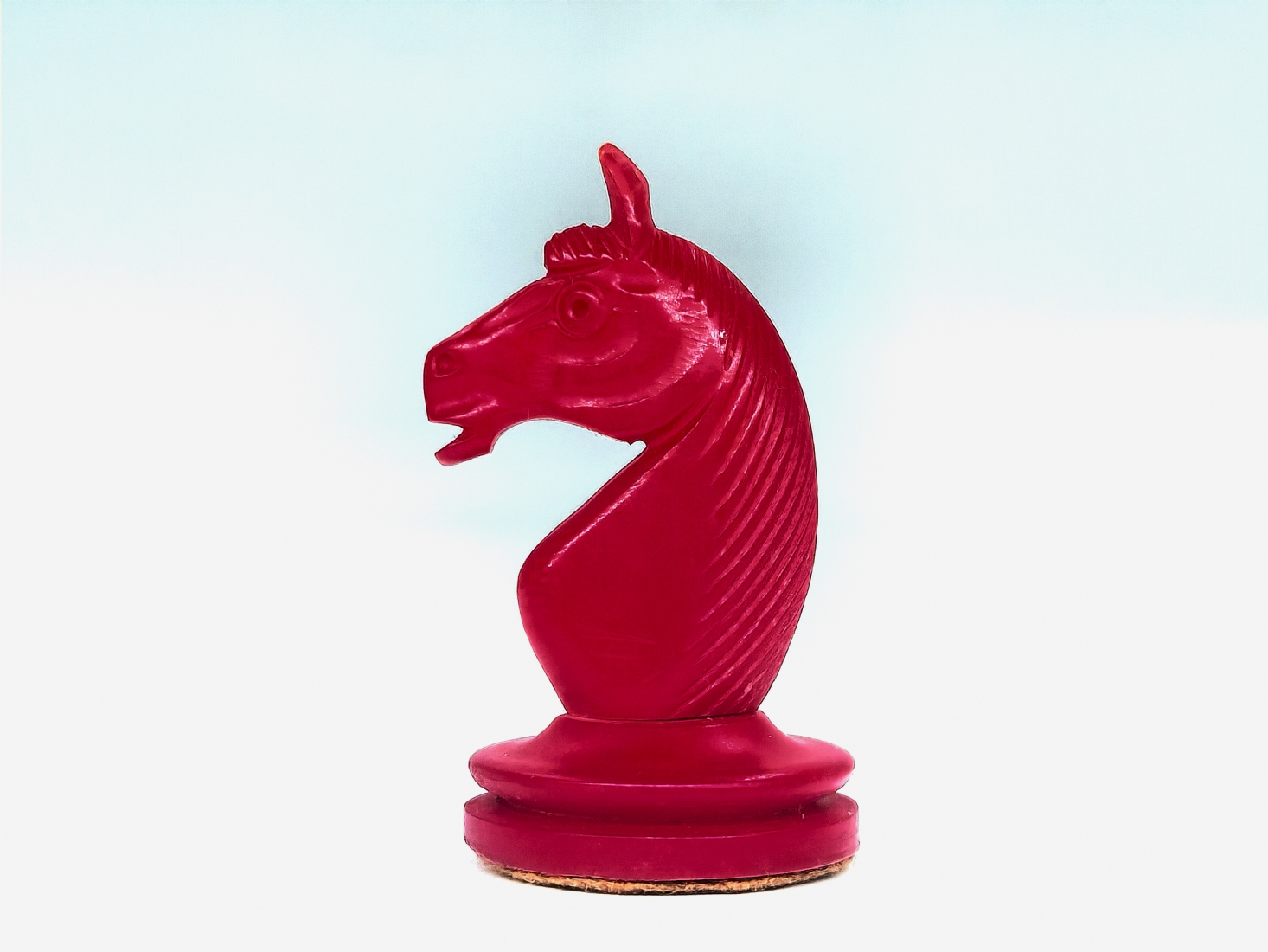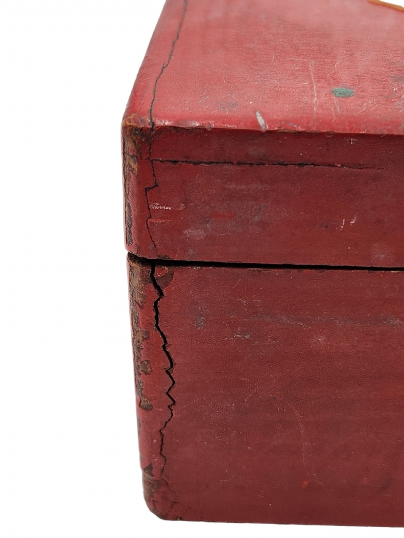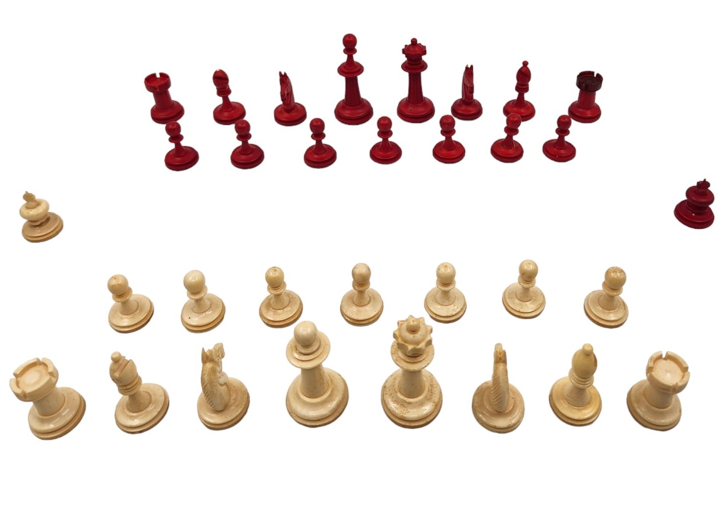 הכלים מגולפים בעבודת יד,חציים צבועים בגון אדום (ללא לוח), נתונים בתיבת עץ (פגם קטן לרץ ולשני הפרשים).גובה הפיון: 3.5 ס"מ.אורך התיבה: 20 ס"מ.