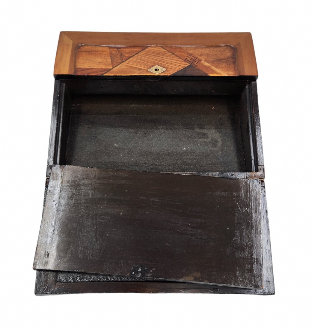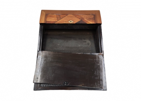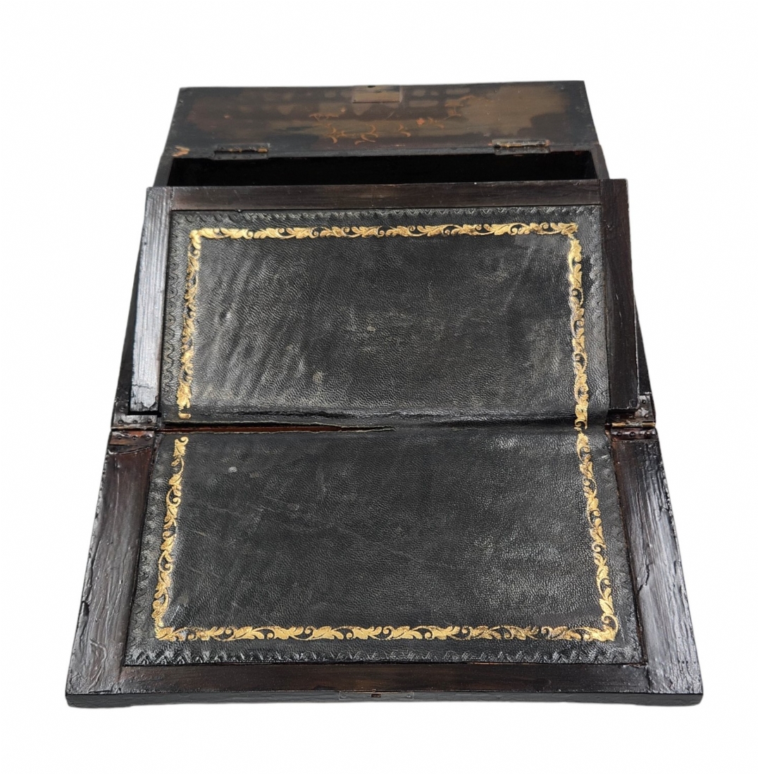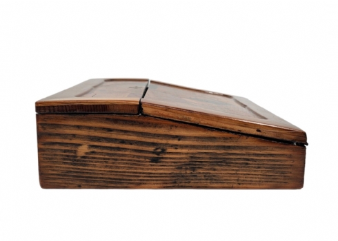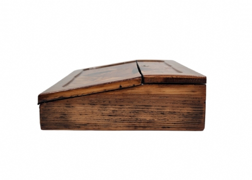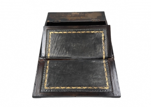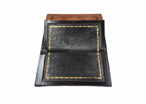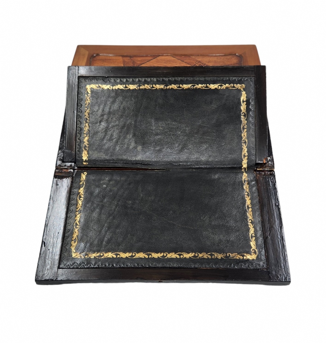 מדרון כתיבה שולחני ישן, עשוי עץ ועור, מעוטר בעבודת פרקטרי, גובה: 8.5 ס"מ, רוחב: 25 ס"מ, אורך: 31 ס"מ