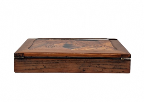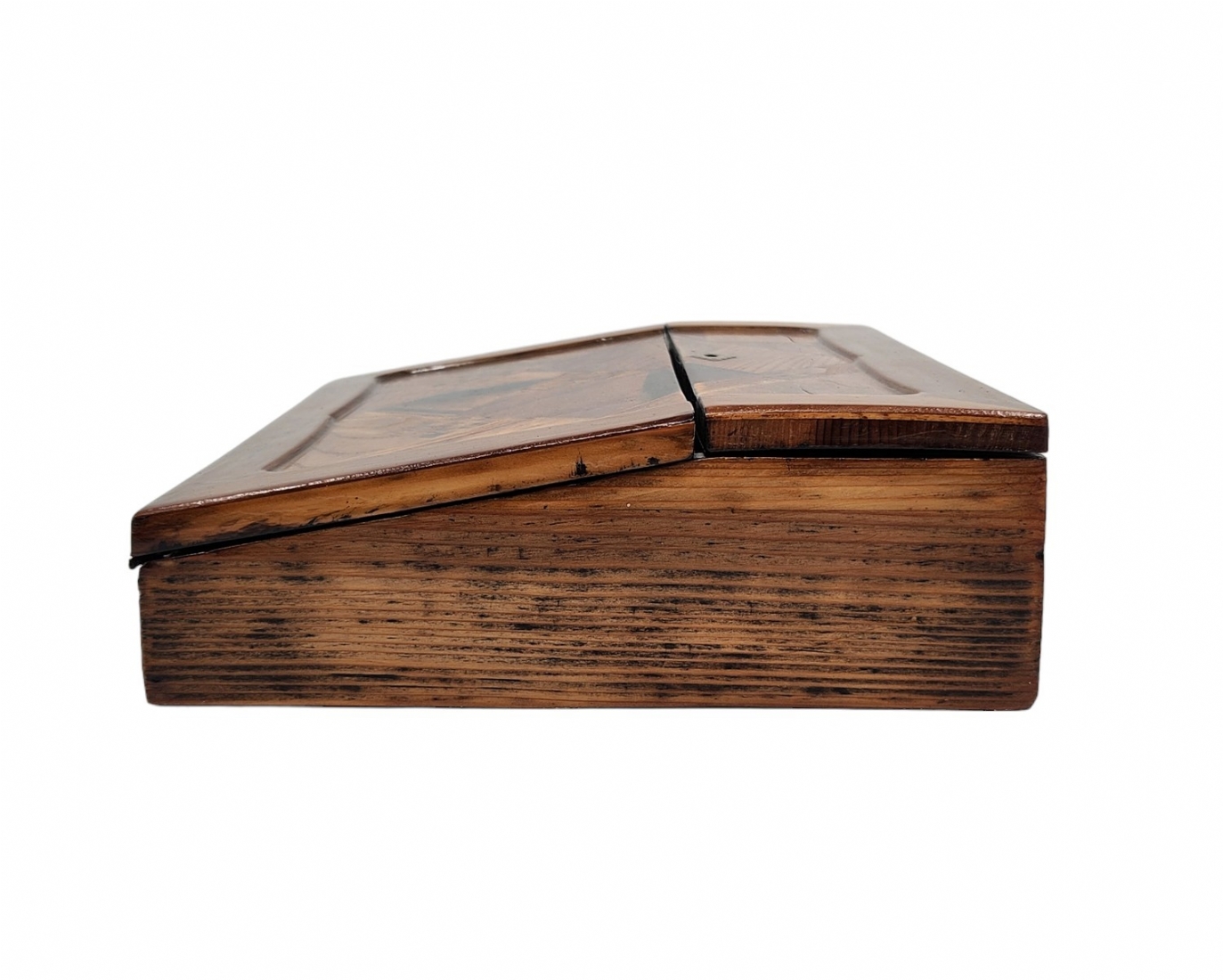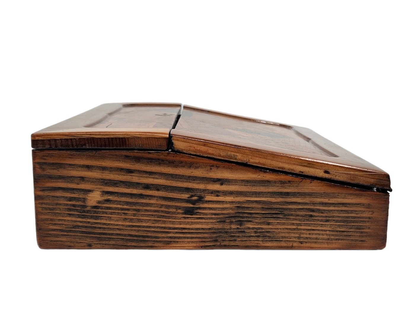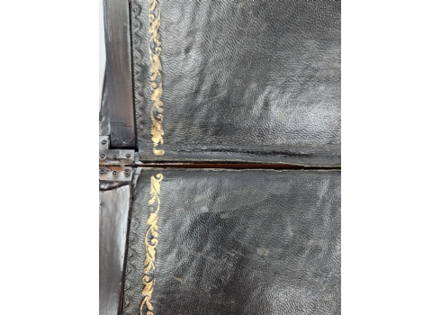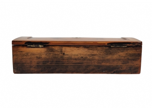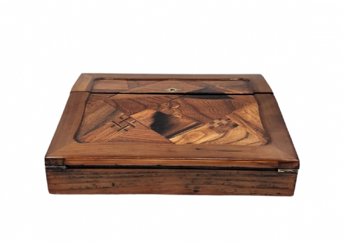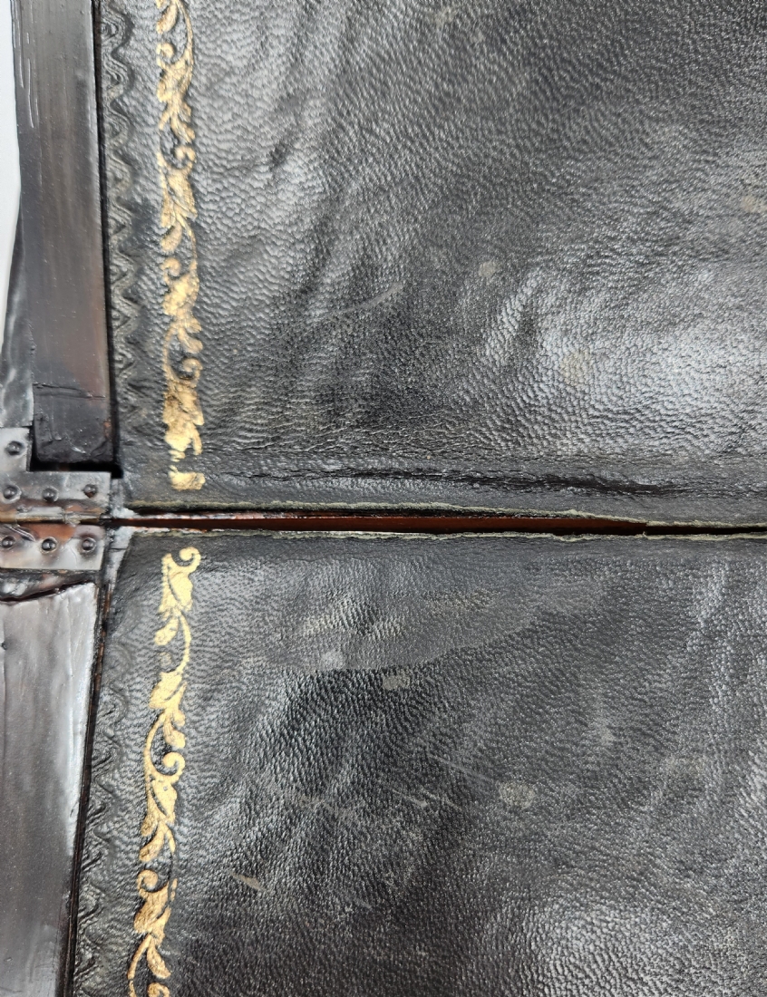 מדרון כתיבה שולחני ישן, עשוי עץ ועור, מעוטר בעבודת פרקטרי, גובה: 8.5 ס"מ, רוחב: 25 ס"מ, אורך: 31 ס"מ