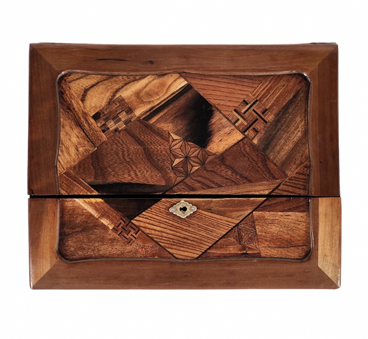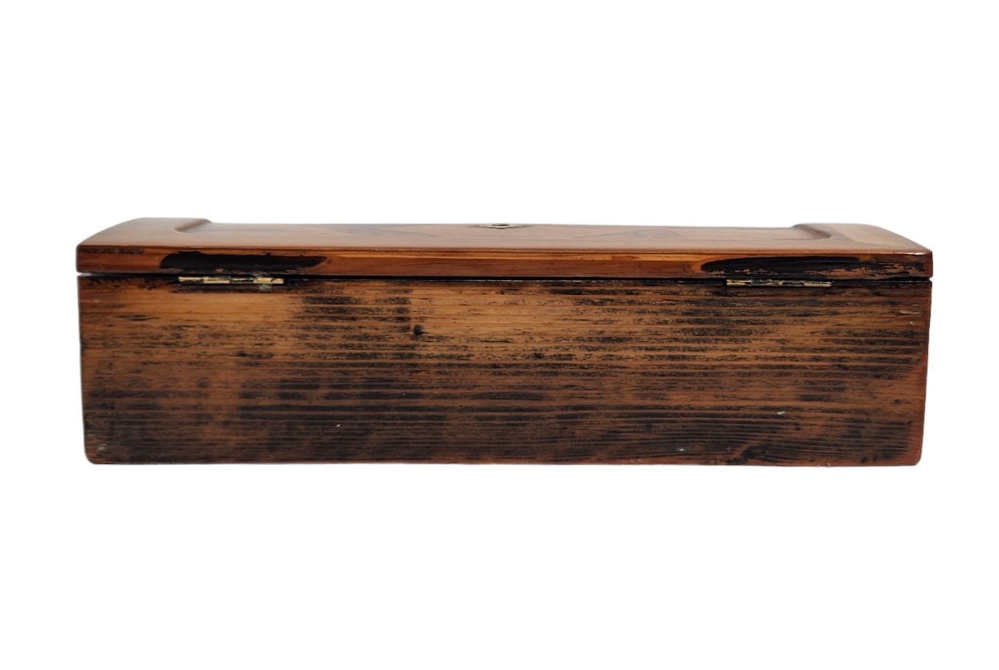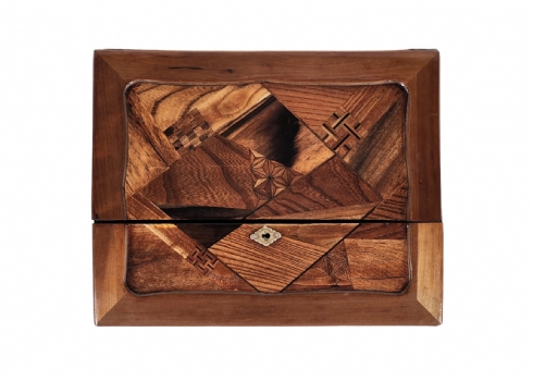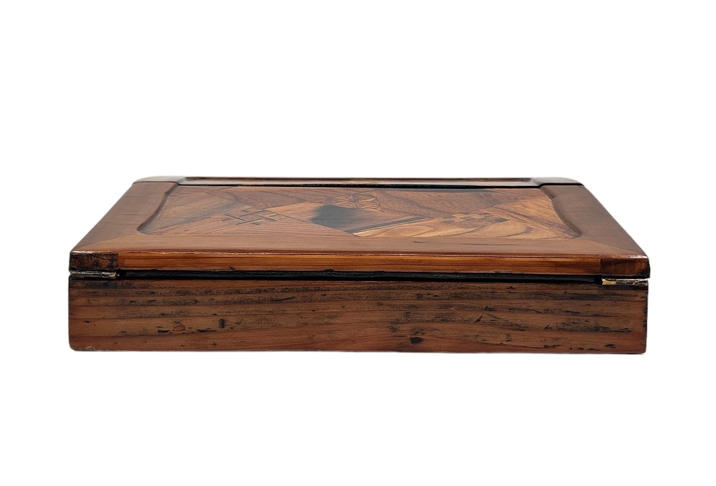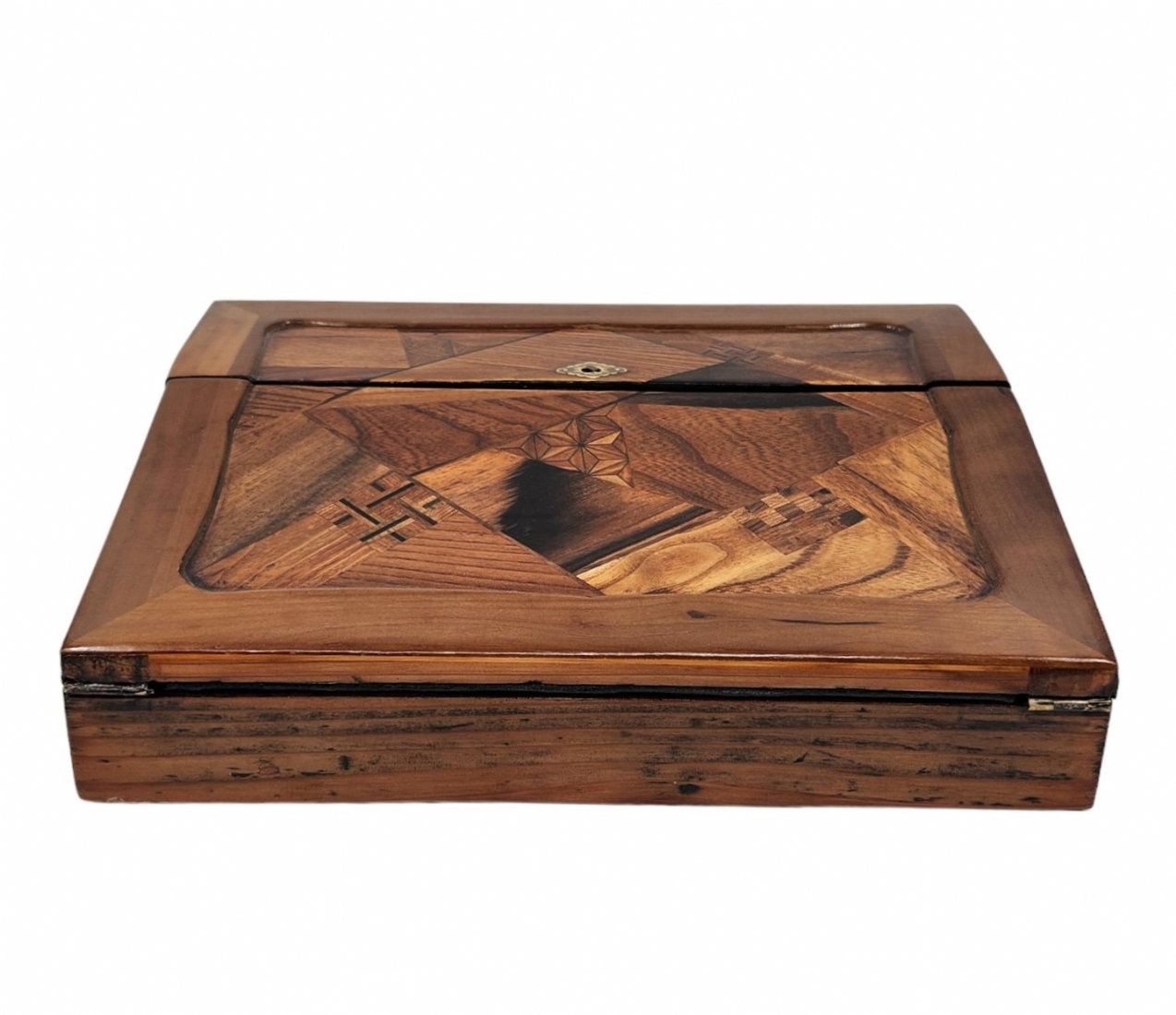 מדרון כתיבה שולחני ישן, עשוי עץ ועור, מעוטר בעבודת פרקטרי, גובה: 8.5 ס"מ, רוחב: 25 ס"מ, אורך: 31 ס"מ