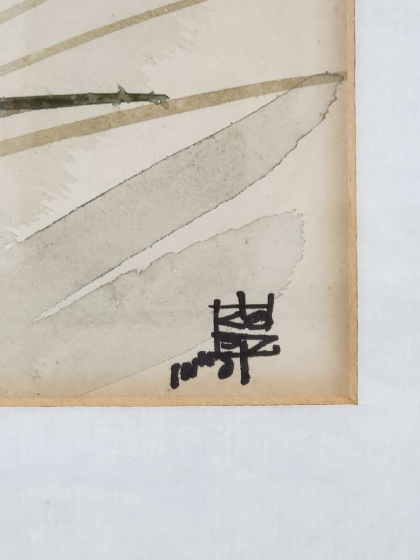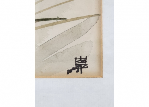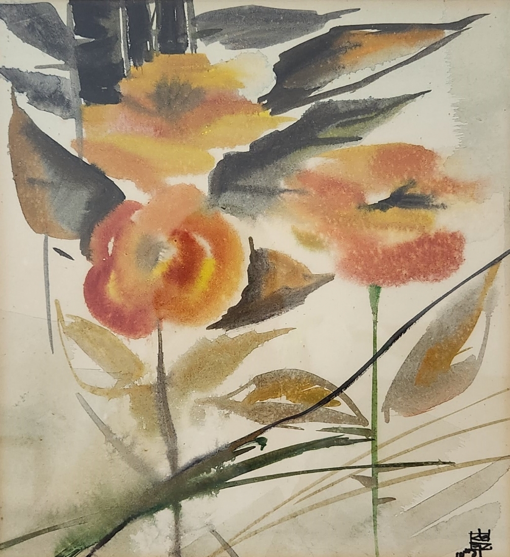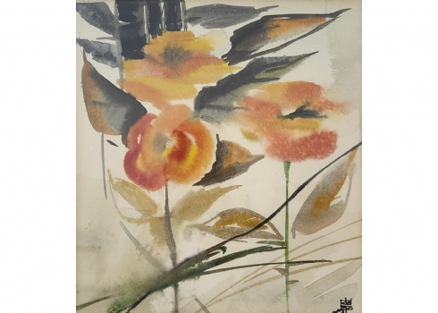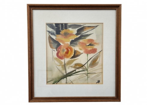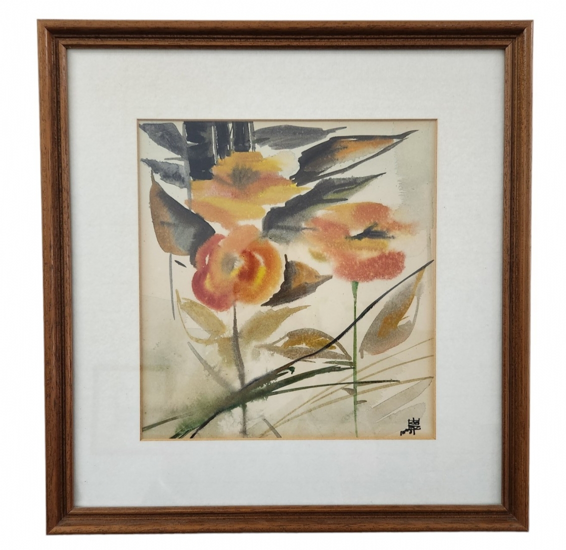 'פריחה כתומה' - אקוורל על נייר, חתום (נשמח לעזרה בזיהוי האמן), מידות: 28.5X26.5 ס"מ, מידות המסגרת: 46X43 ס"מ.
