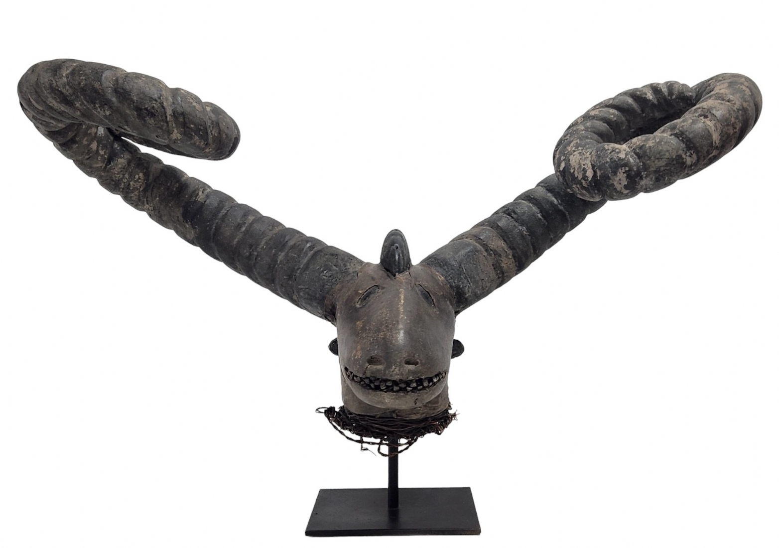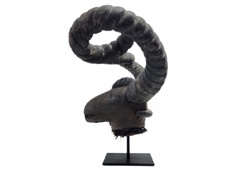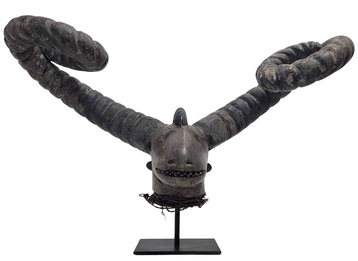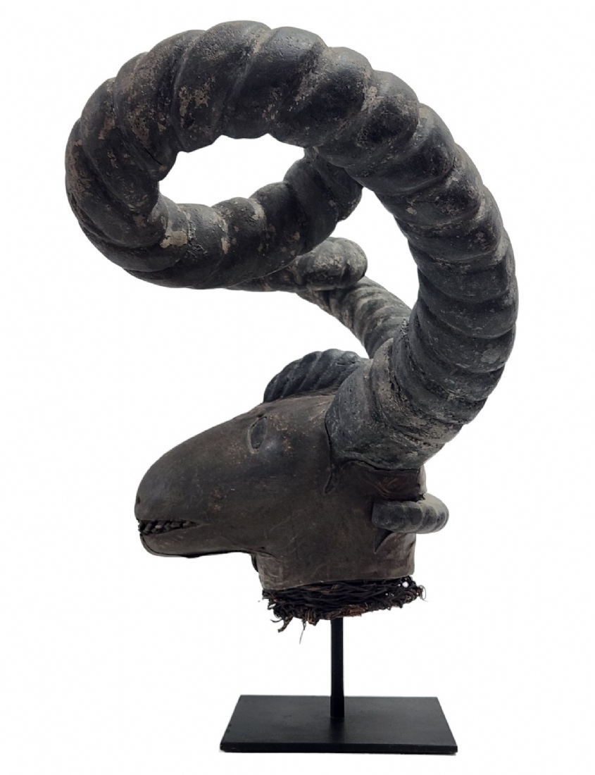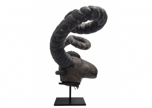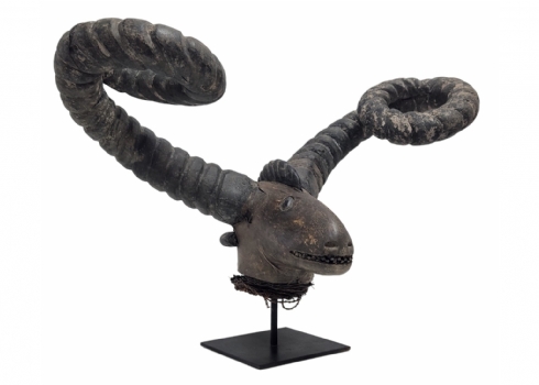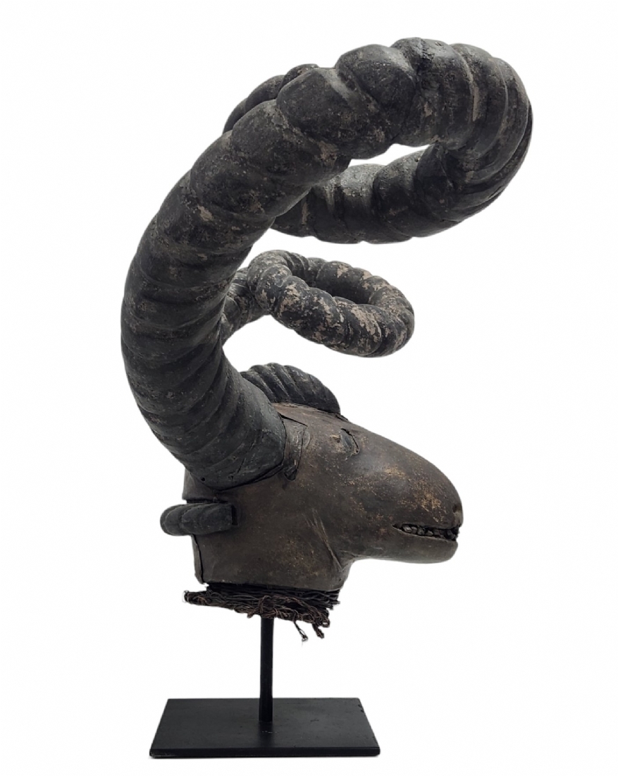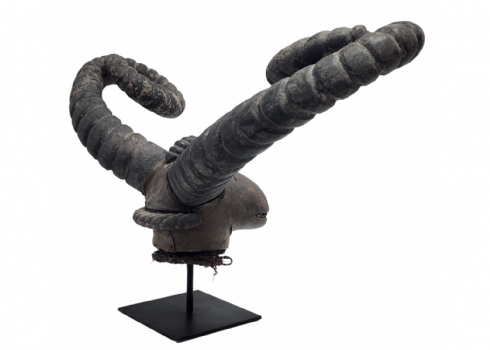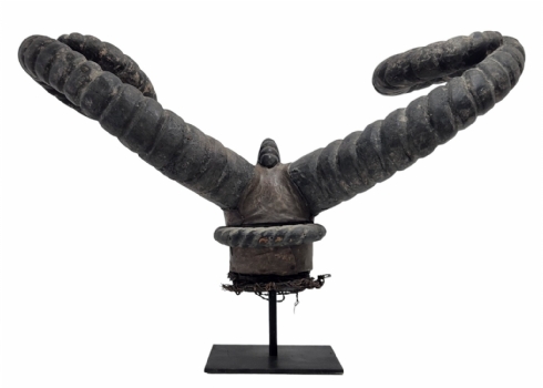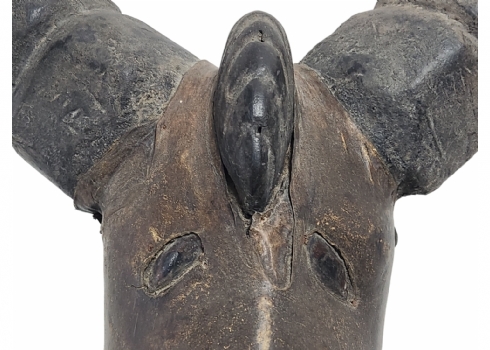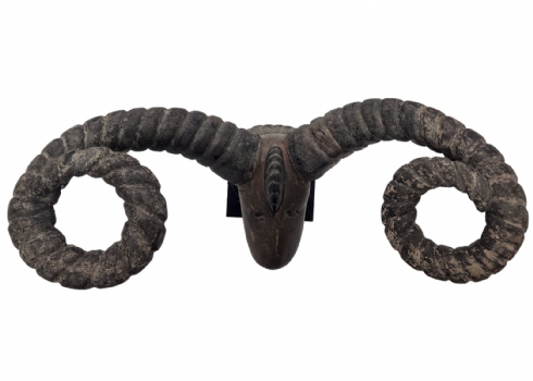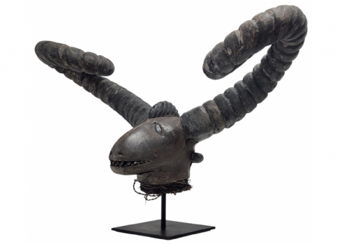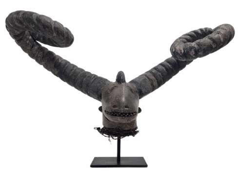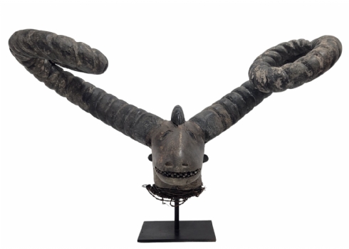 מסכה אפריקאית של אנשי האפיק (Efik people) מאזור נהר הקרוס התחתון (lower Cross River region), אזור קאלבאר (Calabar) בניגריה (Nigeria), המאה ה-19, עשוי עץ, סיבים צמחיים, עור חיה וקרני חיה, פגמים וסדקים (מצולמים), גובה: 56 ס"מ, רוחב החזית בין הקרניים: 84 ס"מ, עומק מהחזית לגב: 30 ס"מ.