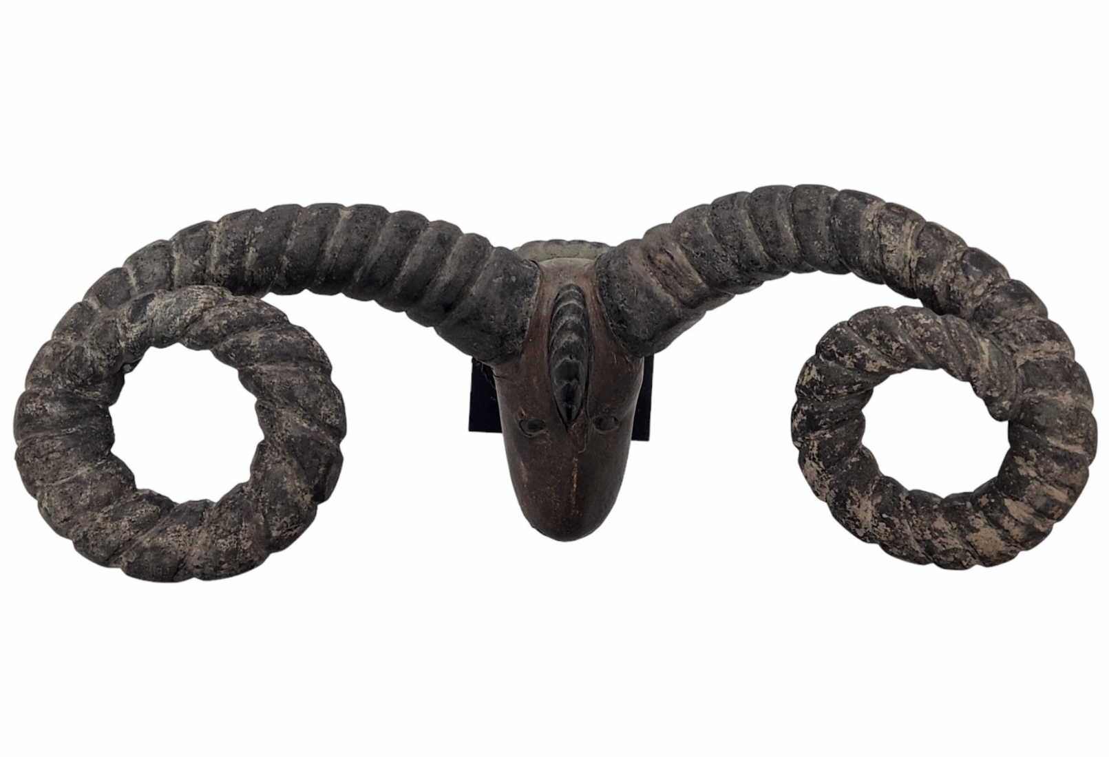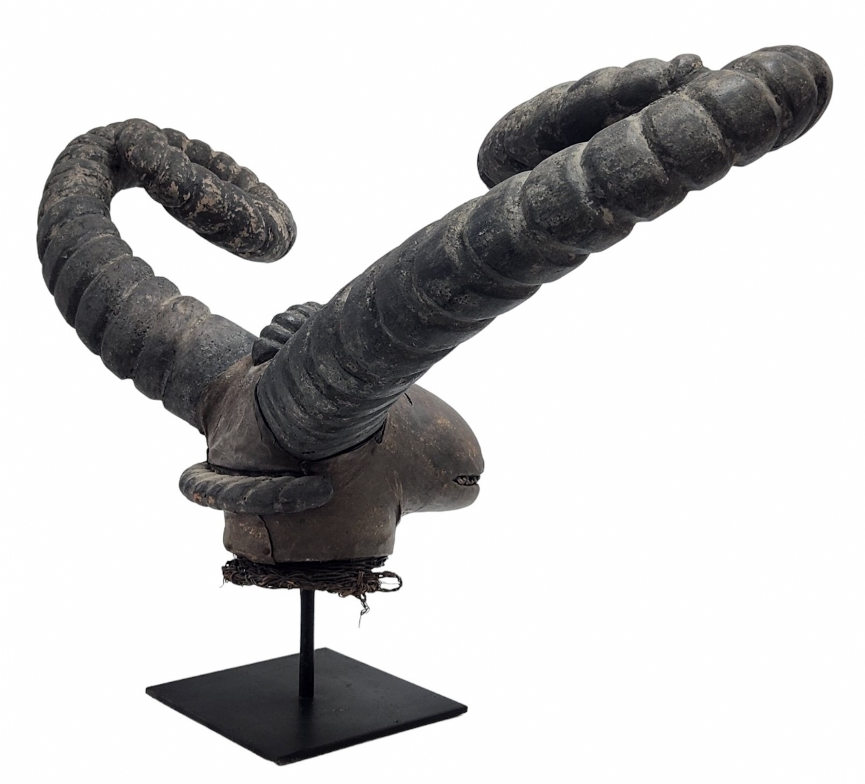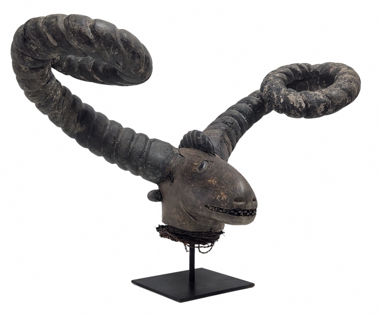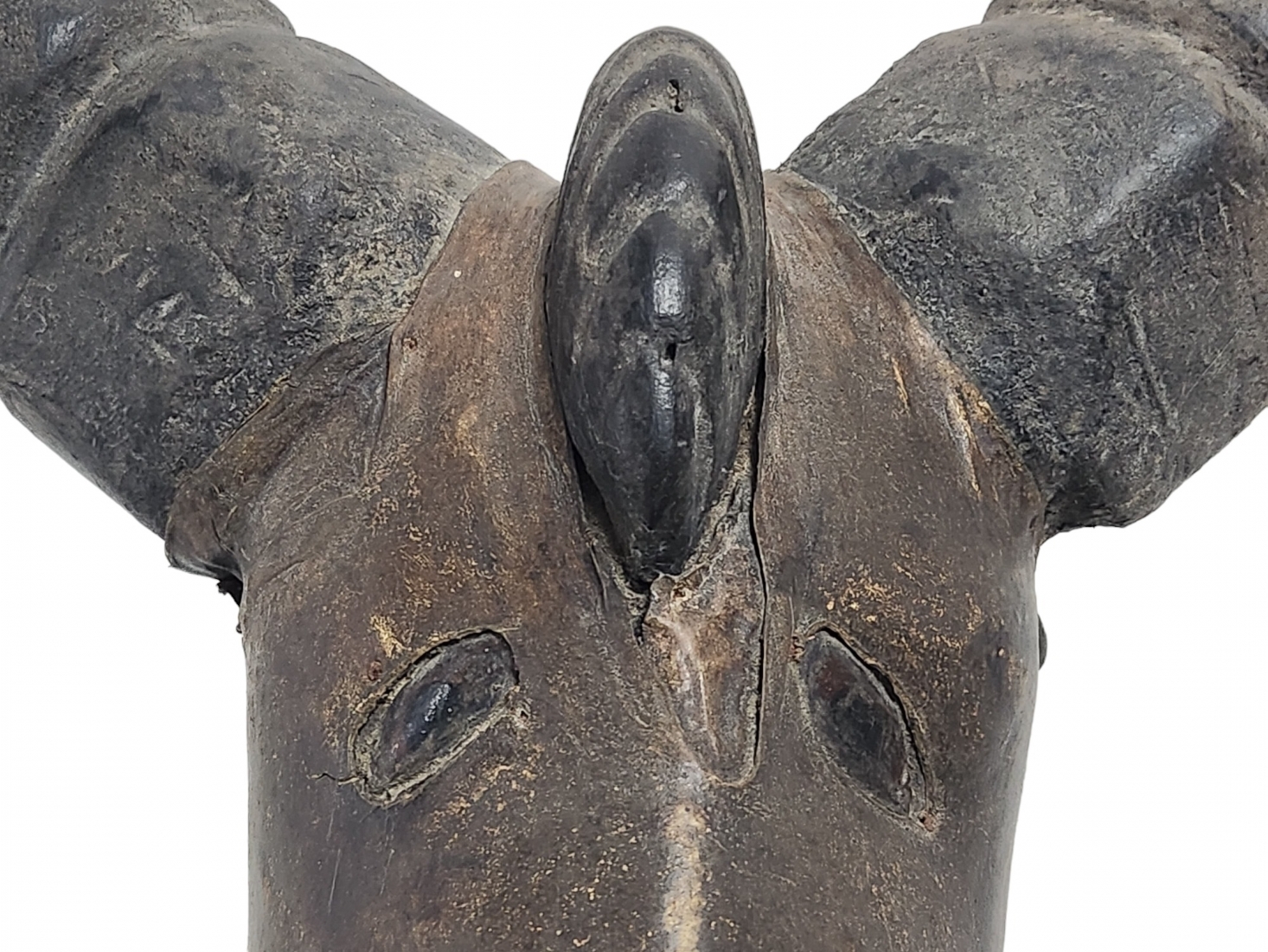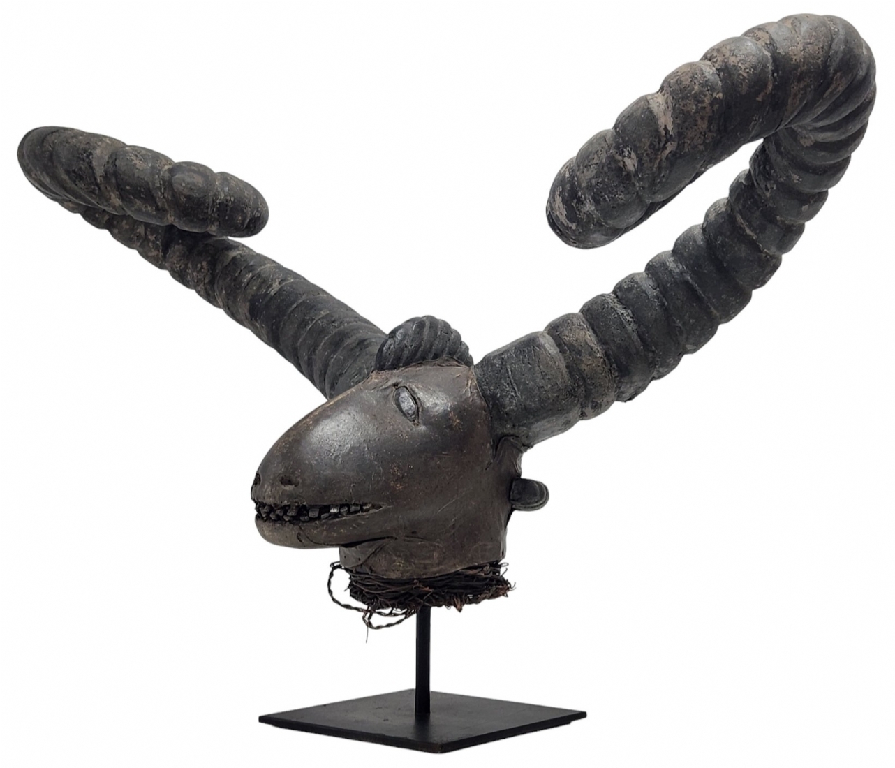 מסכה אפריקאית של אנשי האפיק (Efik people) מאזור נהר הקרוס התחתון (lower Cross River region), אזור קאלבאר (Calabar) בניגריה (Nigeria), המאה ה-19, עשוי עץ, סיבים צמחיים, עור חיה וקרני חיה, פגמים וסדקים (מצולמים), גובה: 56 ס"מ, רוחב החזית בין הקרניים: 84 ס"מ, עומק מהחזית לגב: 30 ס"מ.