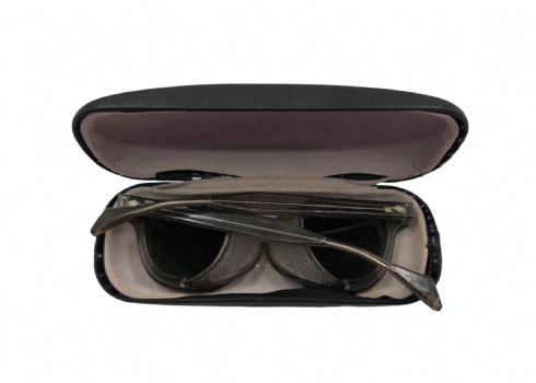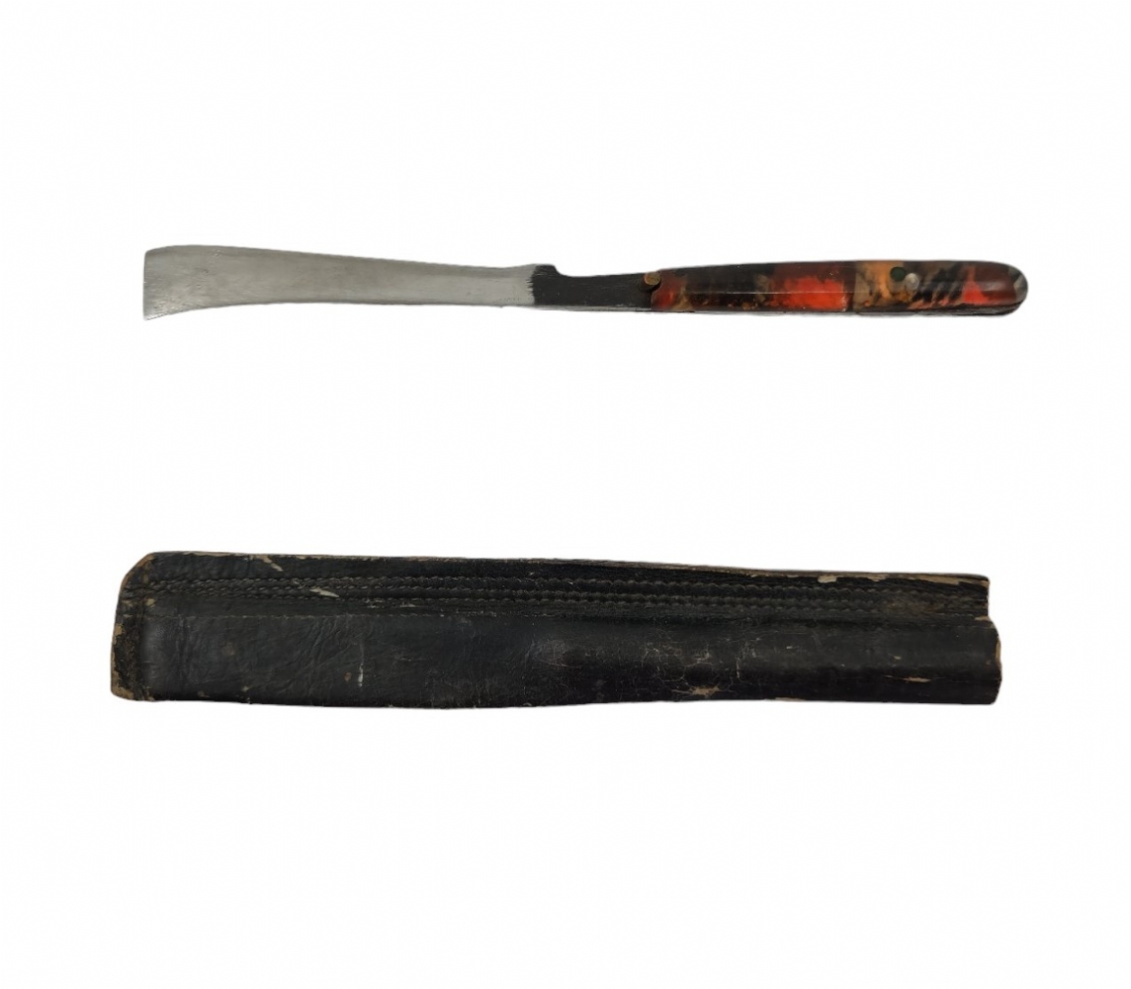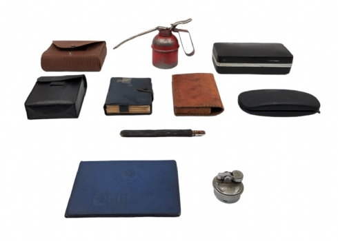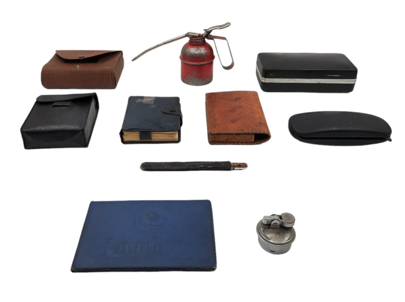 כולל, משקפת סובייטית, 2 מכונות גילוח ישנות, משקפי שמש, פלאש נייד, מצית, משמנת, דיפלומה, קלפי משחק ותער ישן.אורך התער: 14 ס"מ.