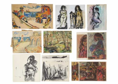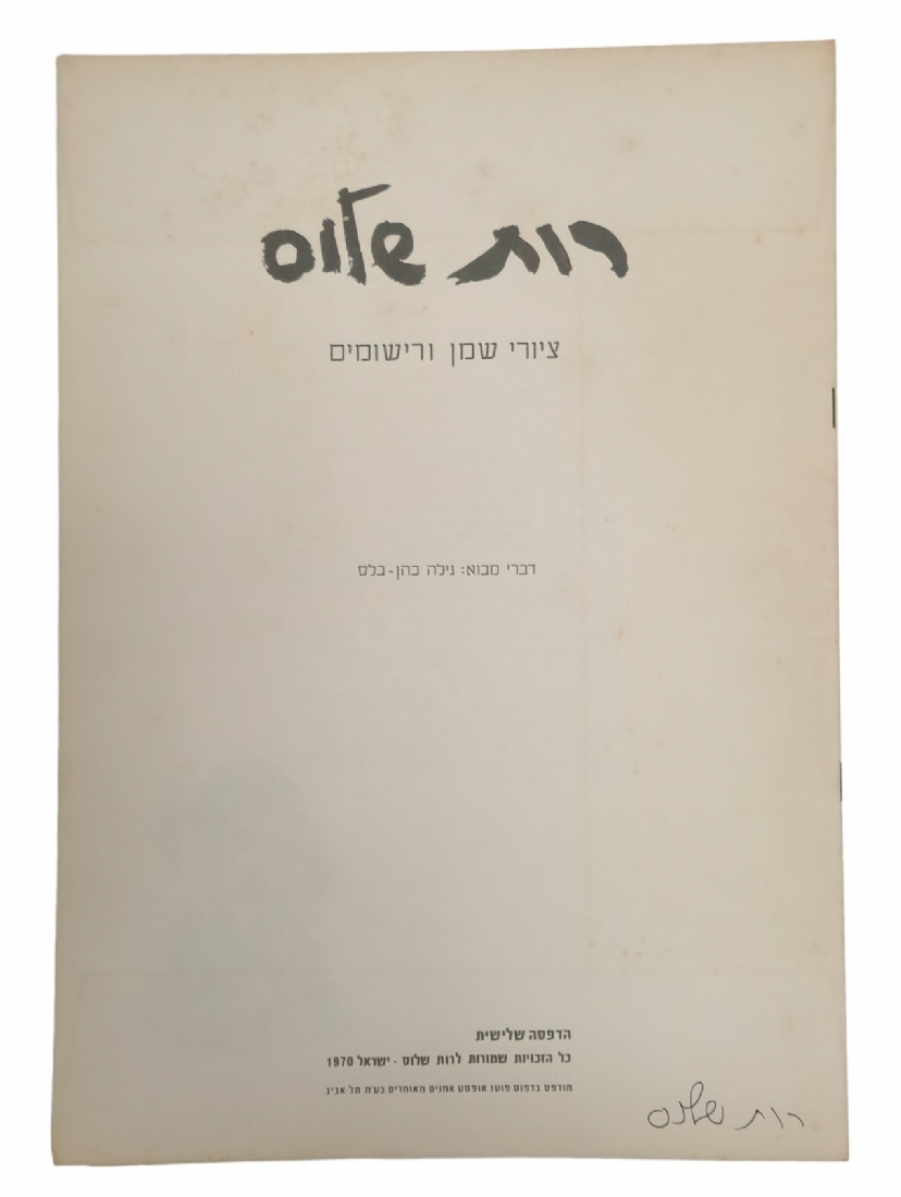 רוט שלוס - אוגדן של 10 ליטוגרפיות חתומות בפלטה, וחתימה מקורית בעט באוגדן, מידות: 34.5X24.5 ס"מ.