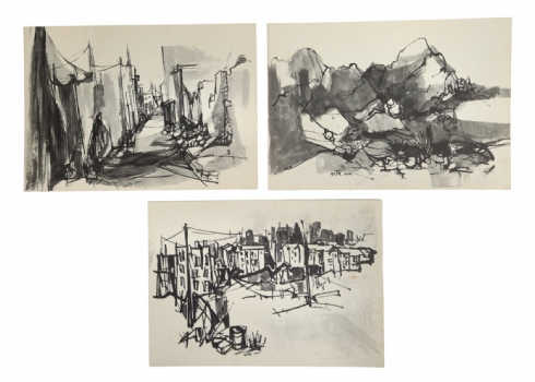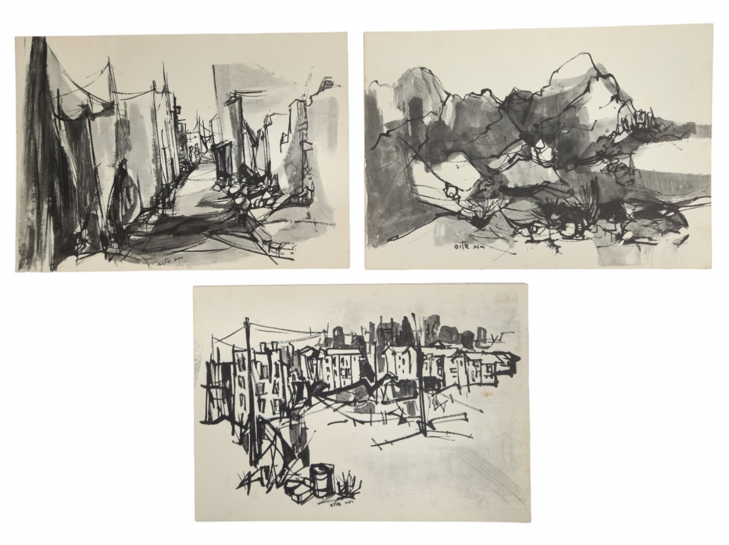 נאוה קריזה רון - 3 ציורים, אקוורל על נייר, ללא מסגרת, חתומים, מידות הציור הגדול: 23.5X32 ס"מ