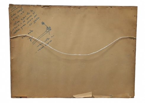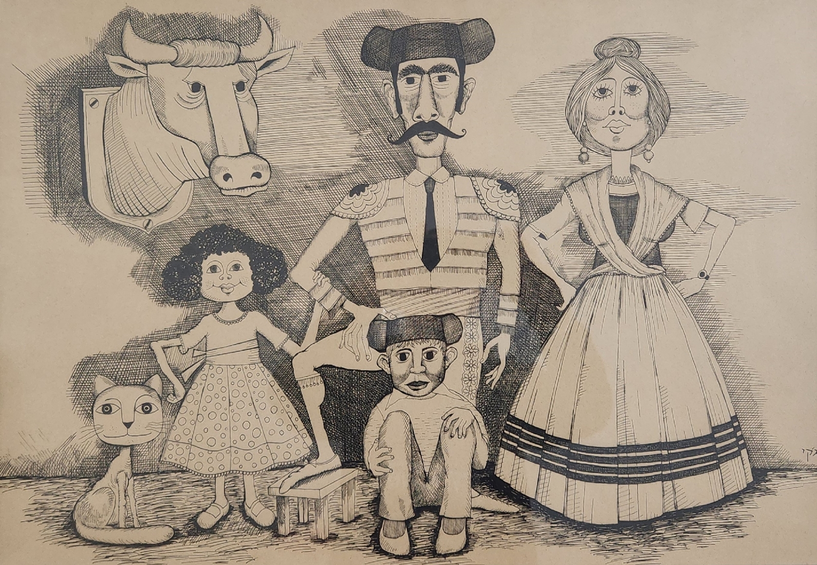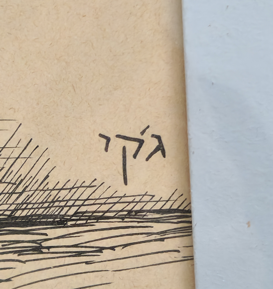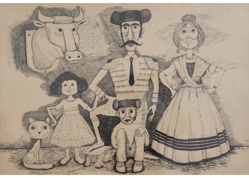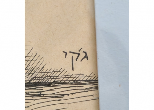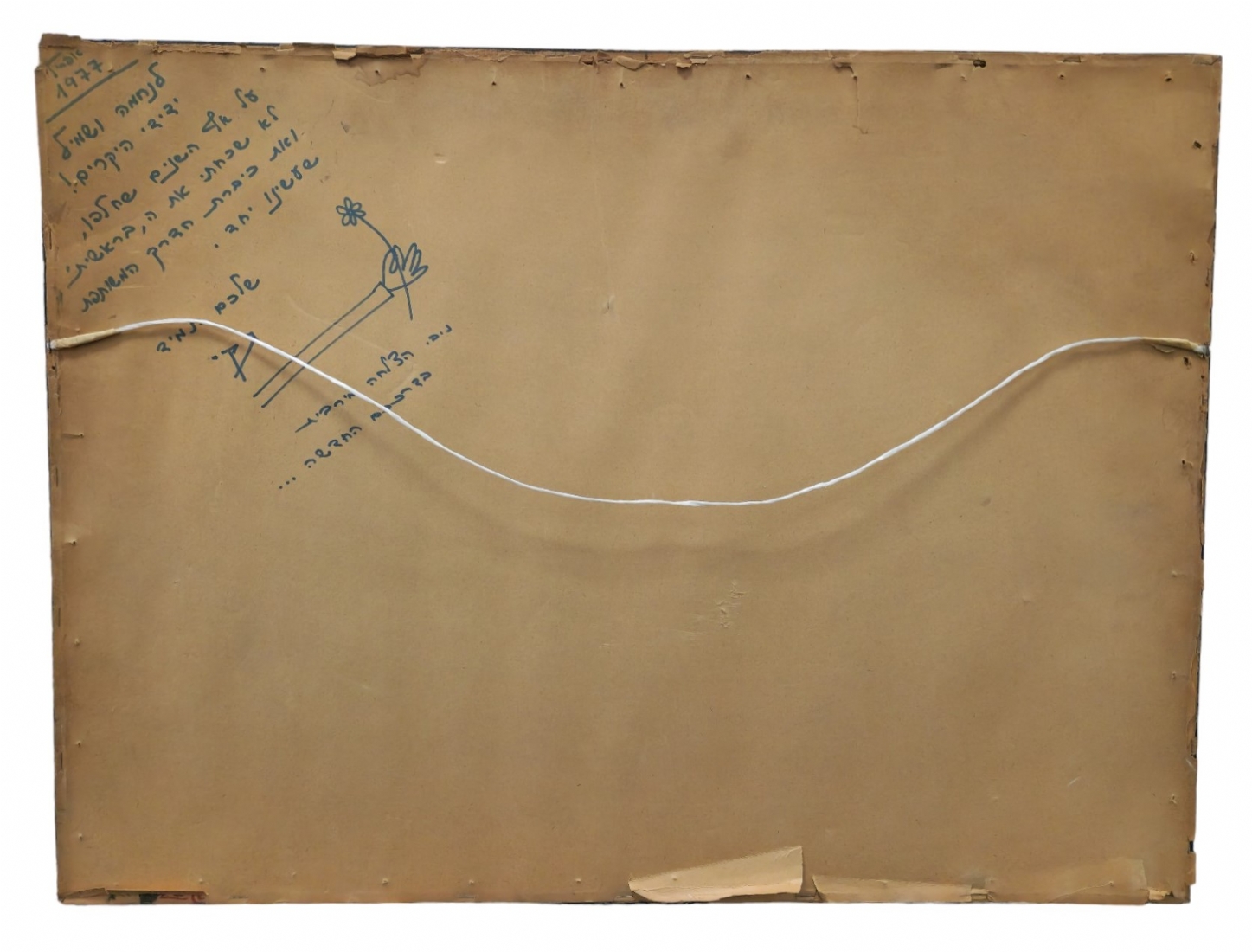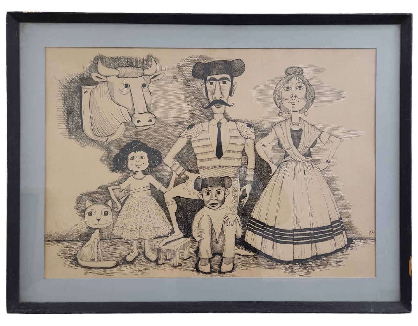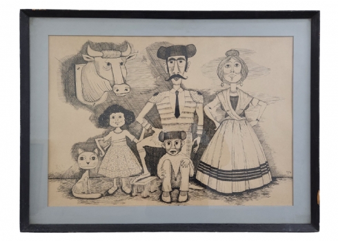 ציור נאיבי, רישום דיו על נייר, חתום, מתוארך 1977 ונושא הקדשה בגב בעבודה.מידות: 45.5X65 ס"מ, מידות המסגרת: 58X78 ס"מ.