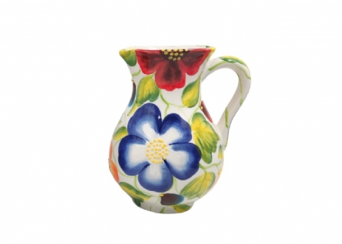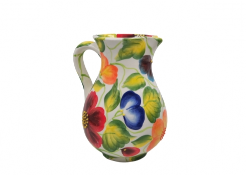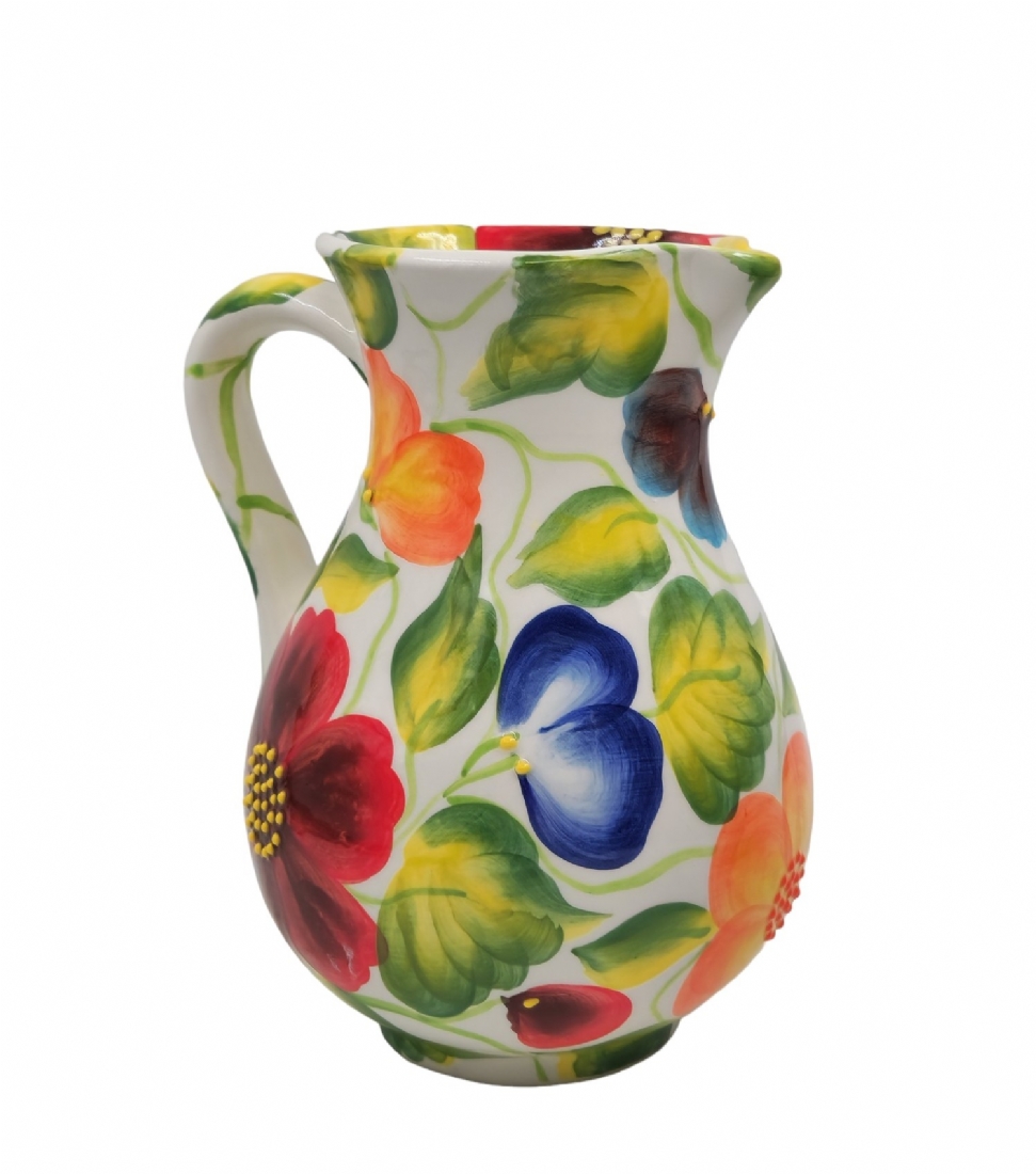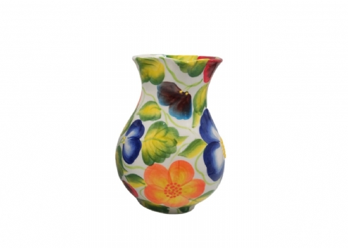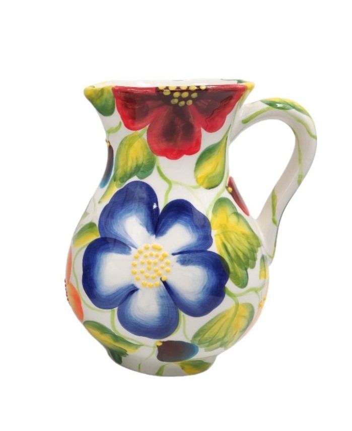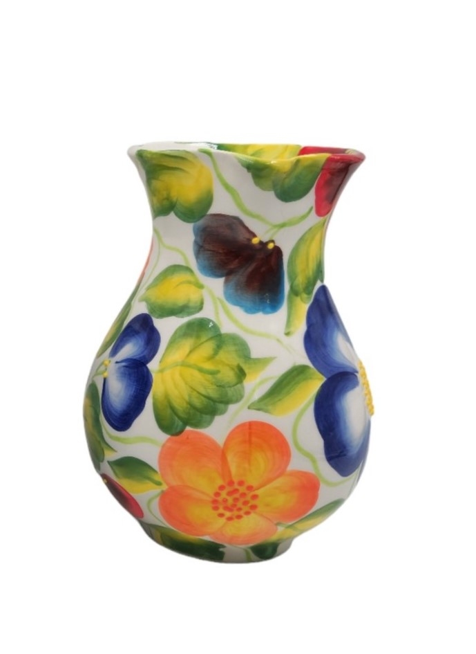 עשוי קרמיקה, מעוטר בפרחים ונקודת בלט בצביעת יד, חתום.