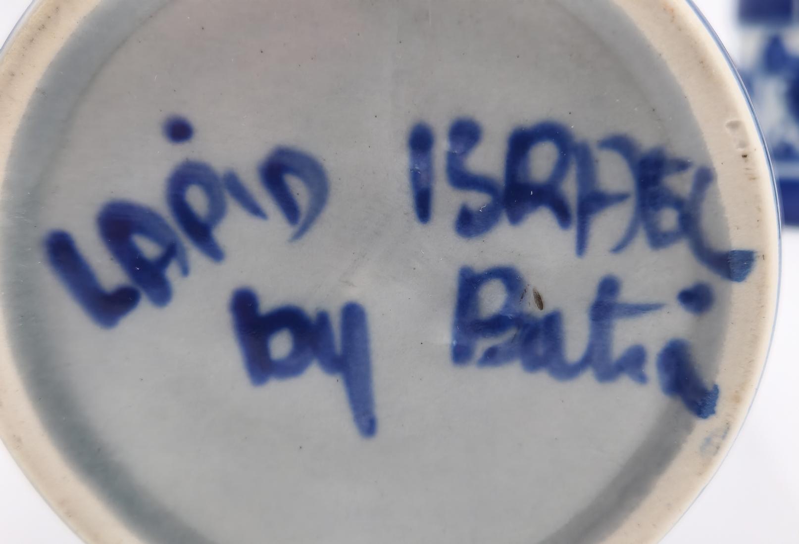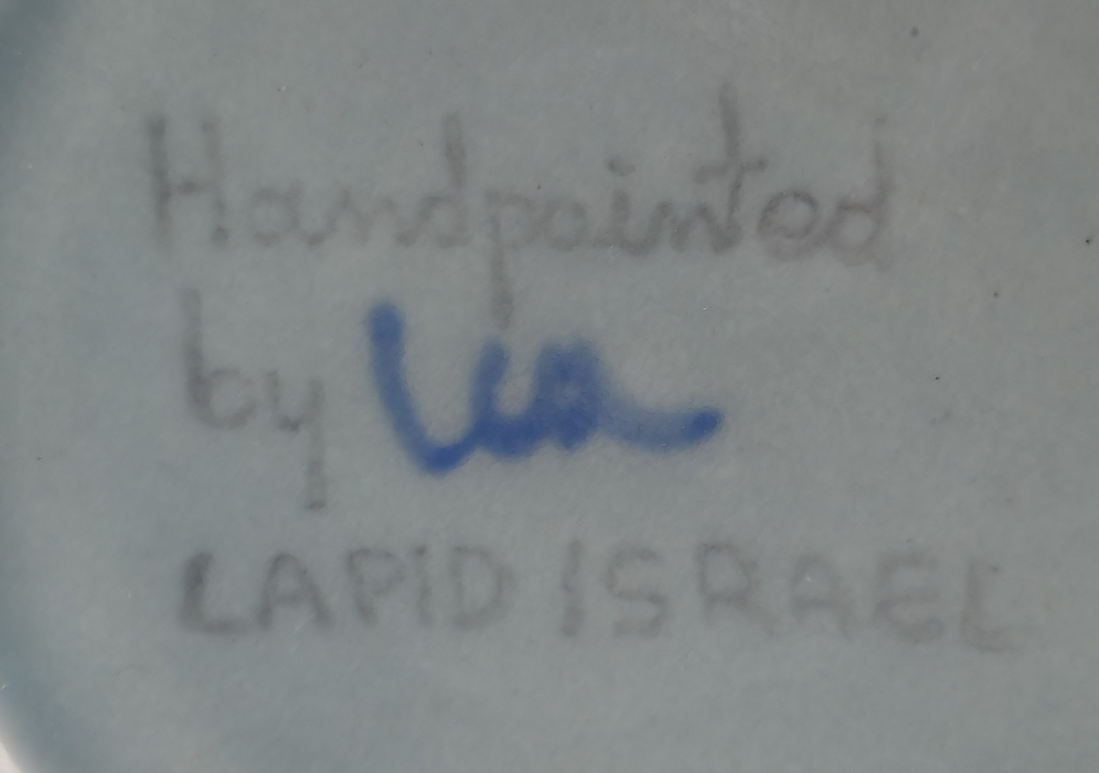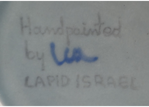 דגם 'ערבסק', מעוטרות בכחול על רקע אפור בצביעה בעבודת יד. חתום.