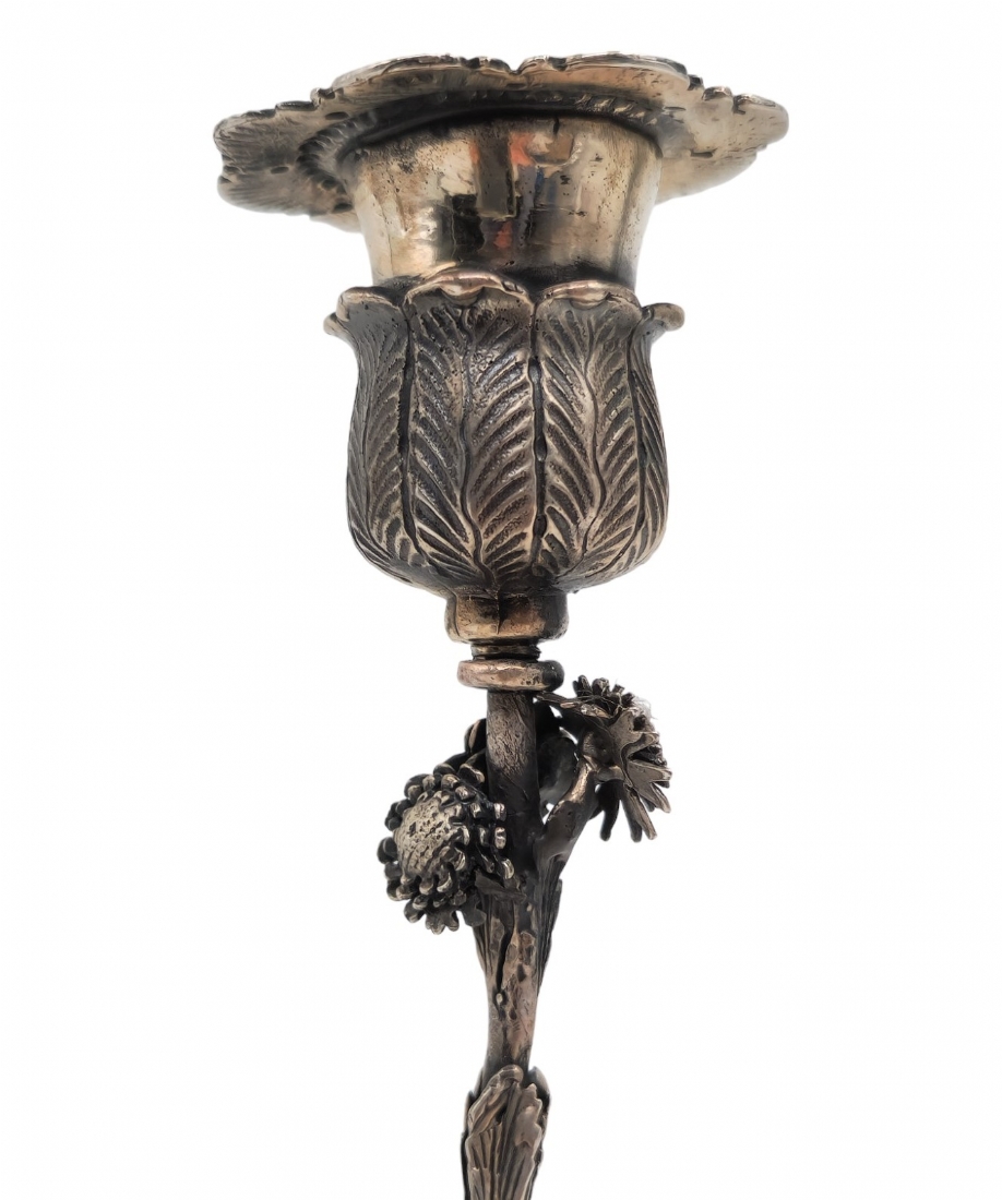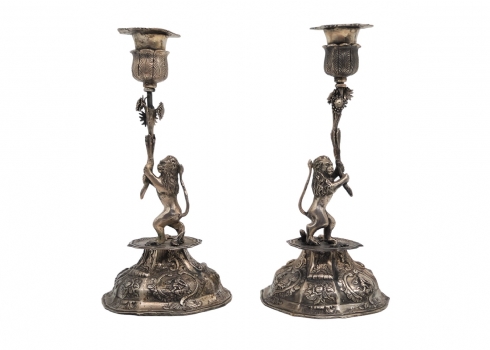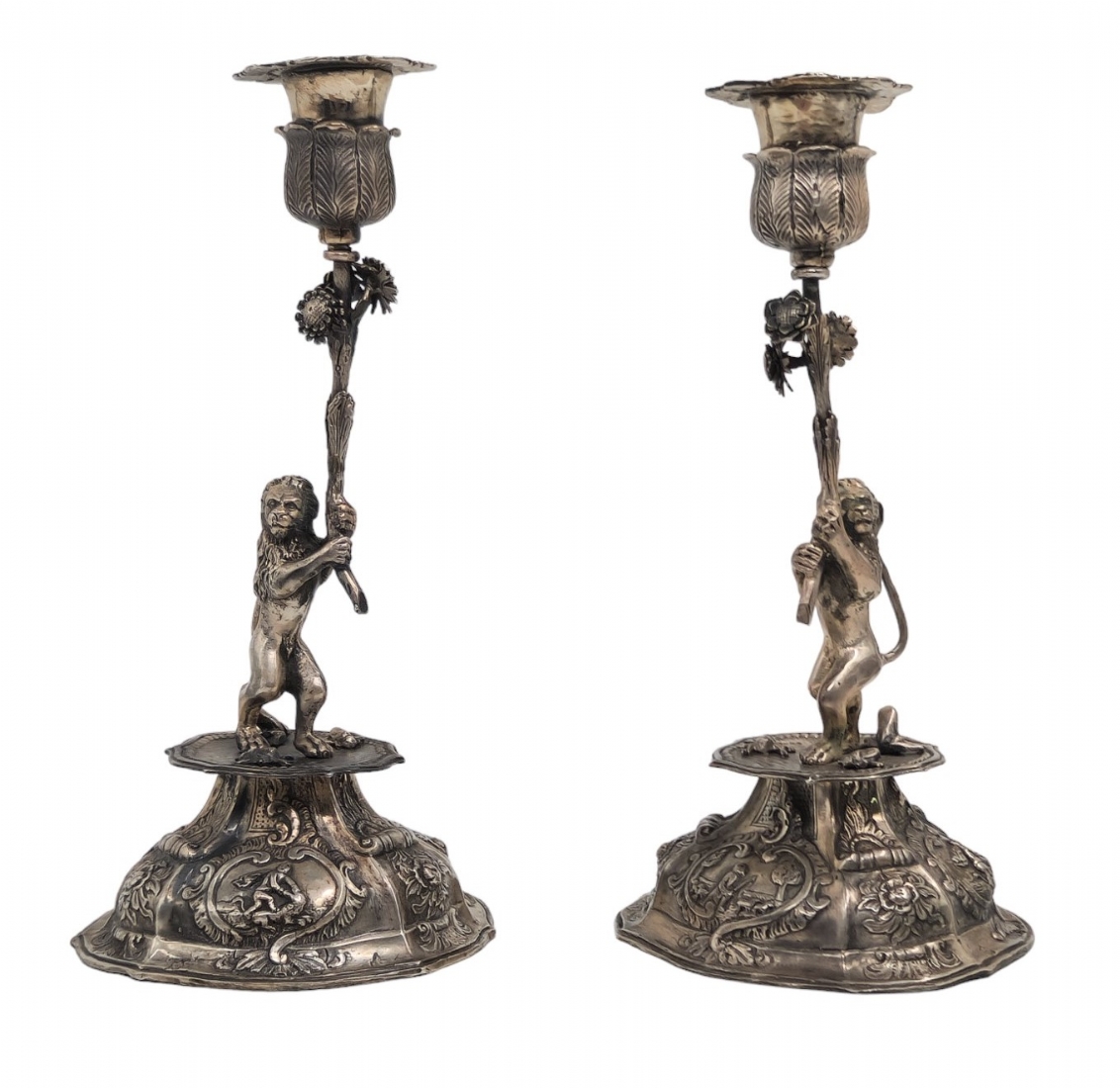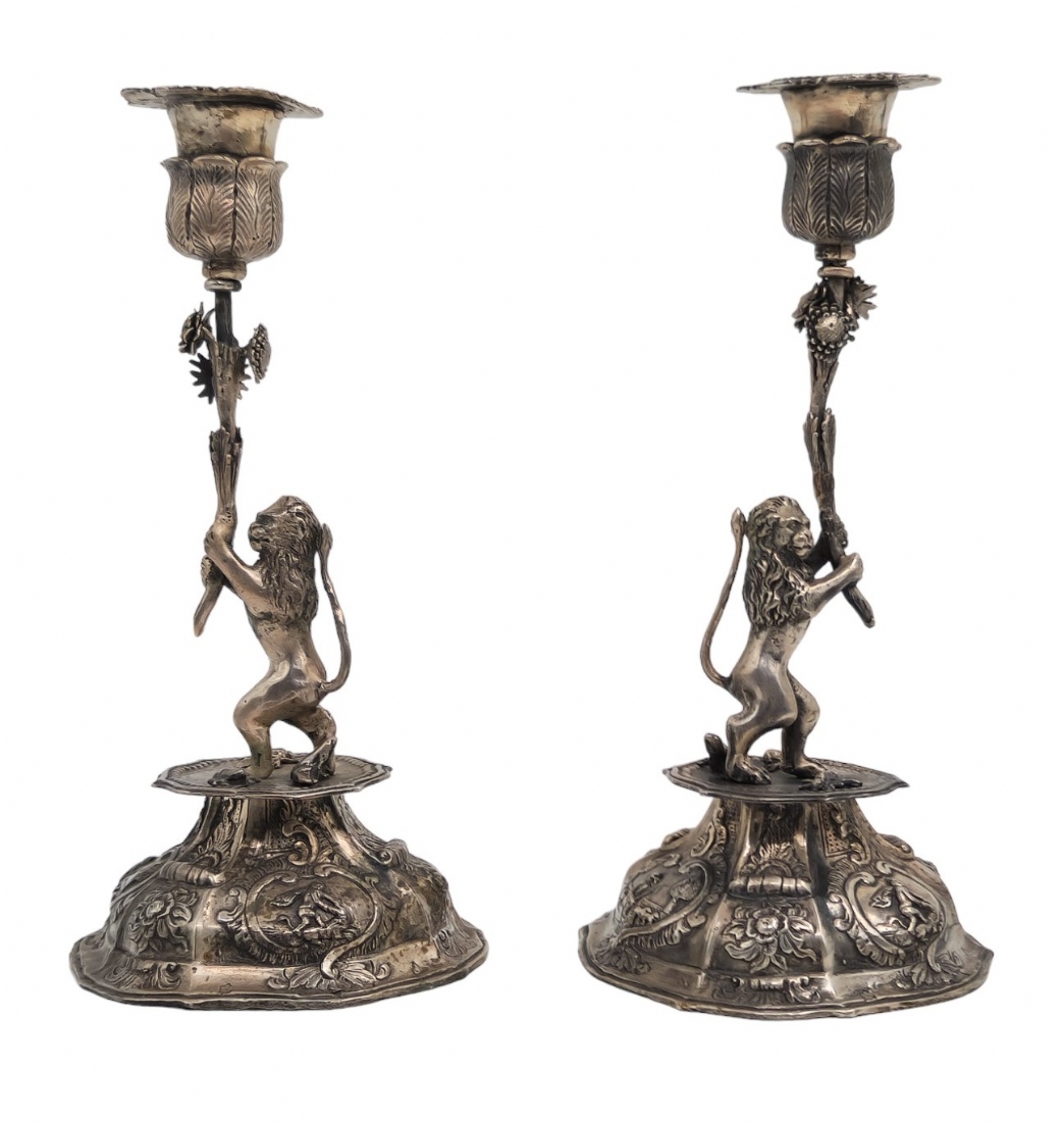 עשויים כסף בעבודת צורפות ידנית איכותית מאד, נושאים חותמות פסאודו מאה-18, משקל כולל: 521 גרם סה"כ. רוחב הבסיס: 8.5 ס"מ, גובה: 17.5 ס"מ.