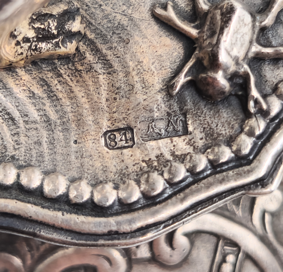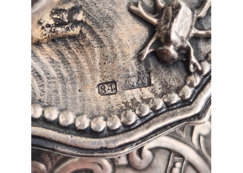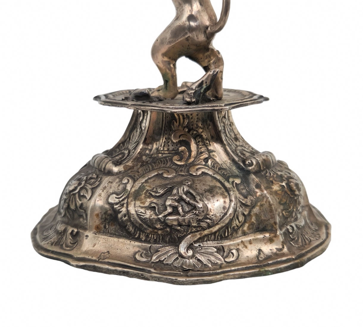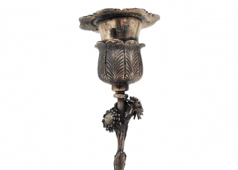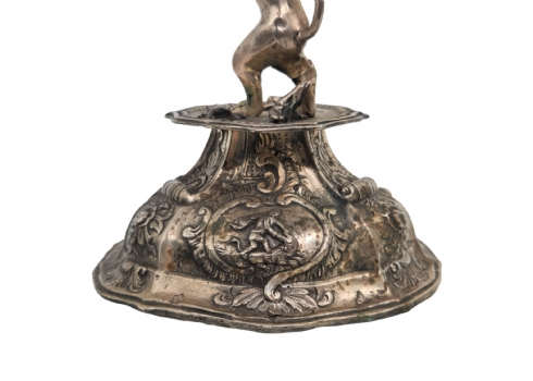 עשויים כסף בעבודת צורפות ידנית איכותית מאד, נושאים חותמות פסאודו מאה-18, משקל כולל: 521 גרם סה"כ. רוחב הבסיס: 8.5 ס"מ, גובה: 17.5 ס"מ.