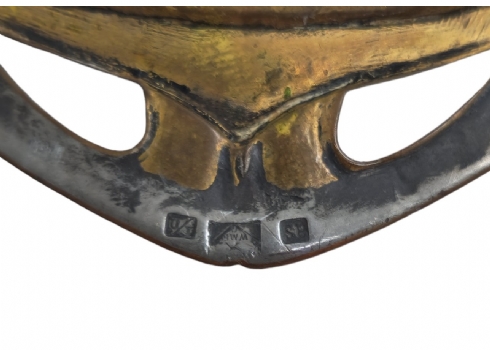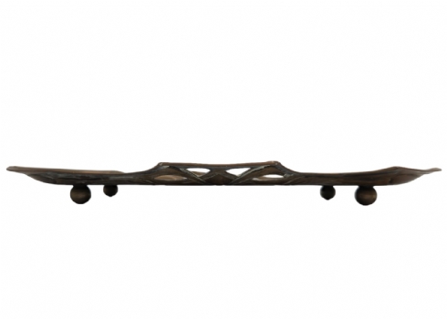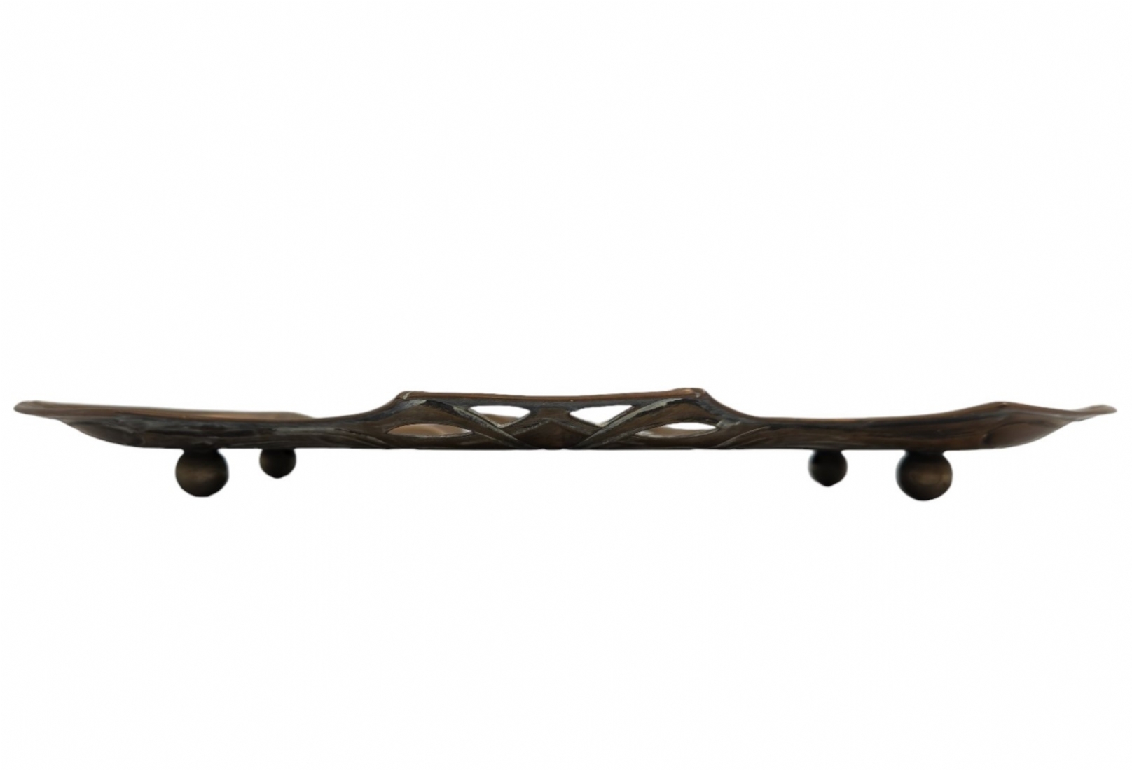 עשוי פליז ושאריות כסף (היה בעבר מצופה כסף), בעל 4 רגליות כדוריות, מעוטר בעיטורי בלט בדגמי גבעולים מפותלים בהיקף, חתום.