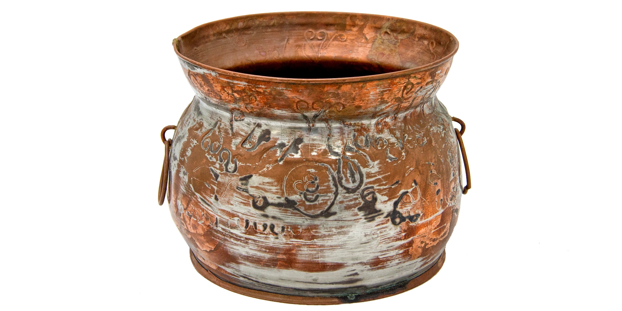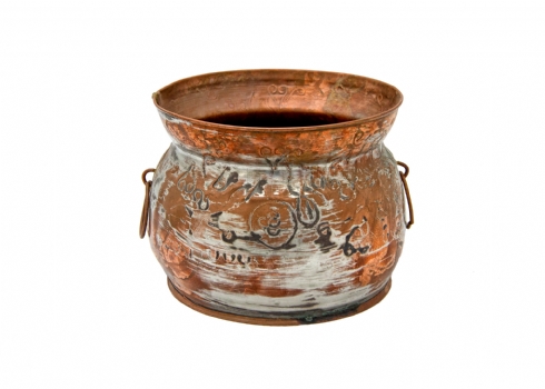 כלי נחושת מרוקע בעבודת יד, שאריות בדיל. גובה: 18.5 ס"מ.