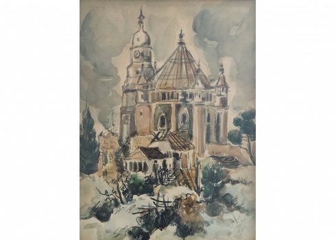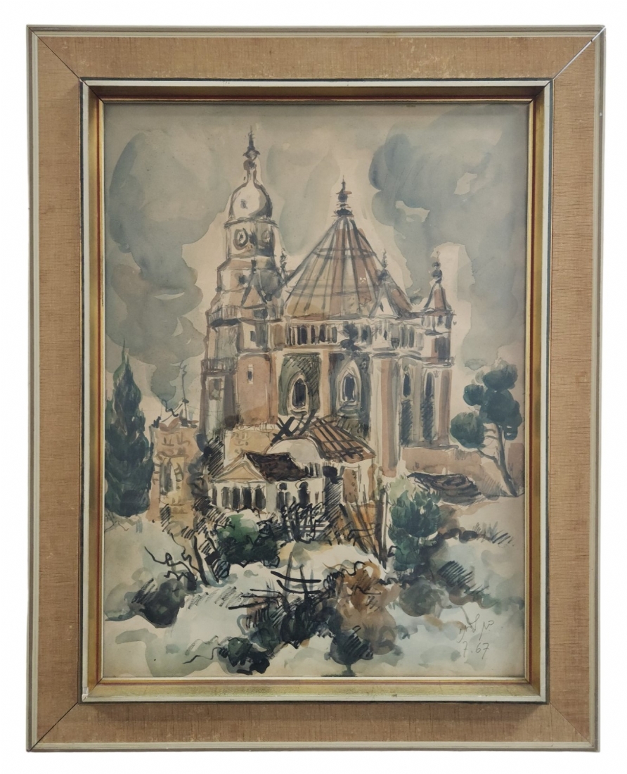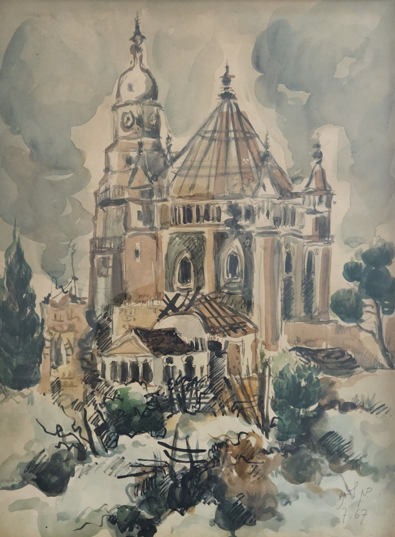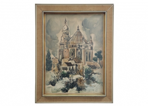 דן לבני (Dan Livni) - 'כנסיה בפריז' - אקוורל על נייר