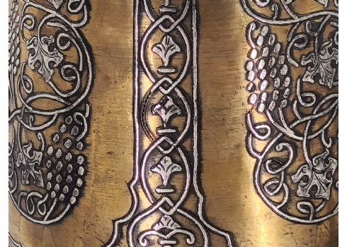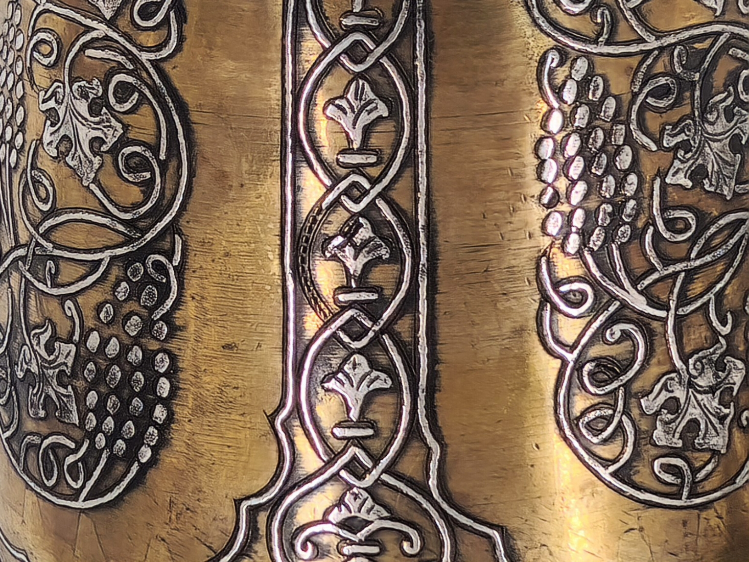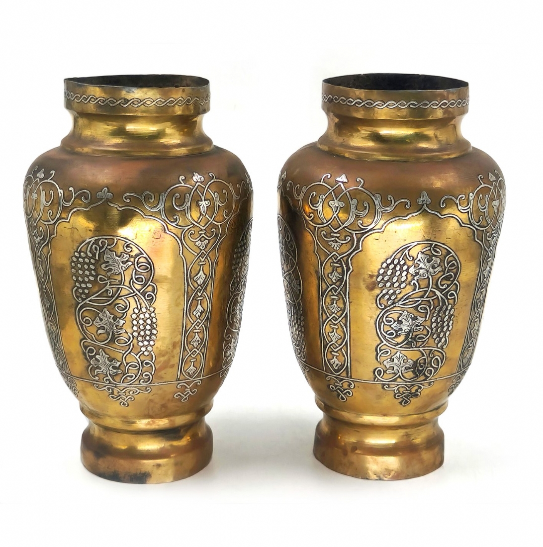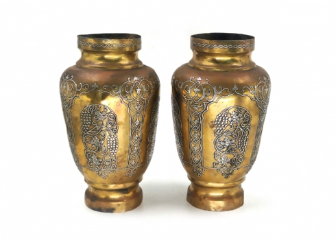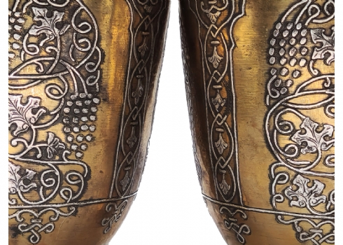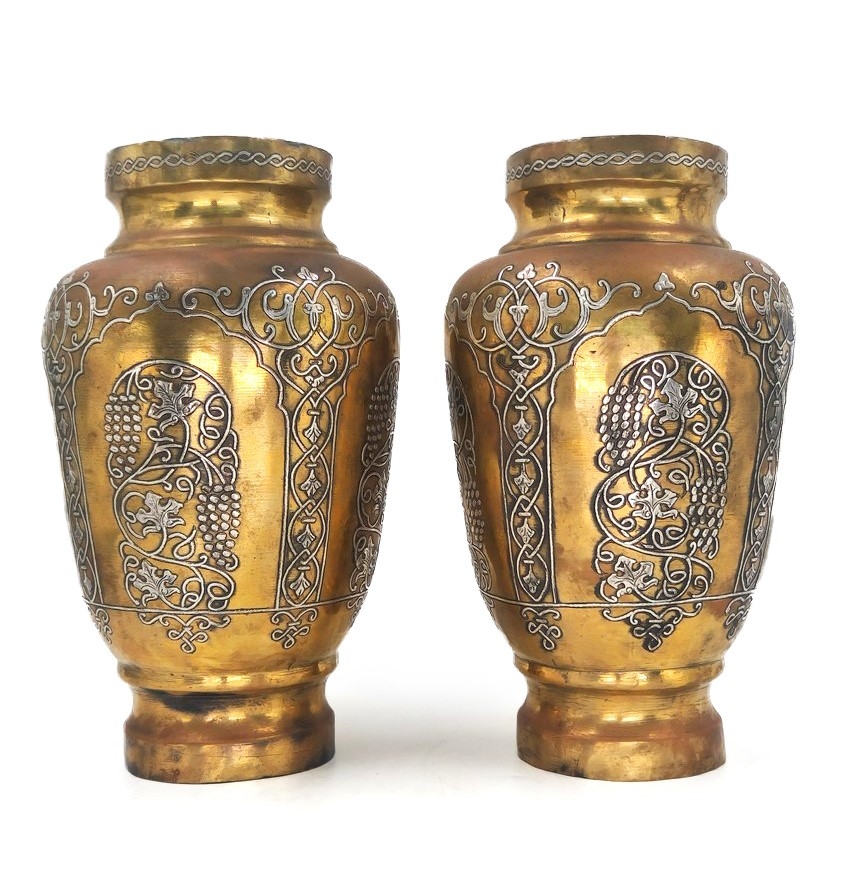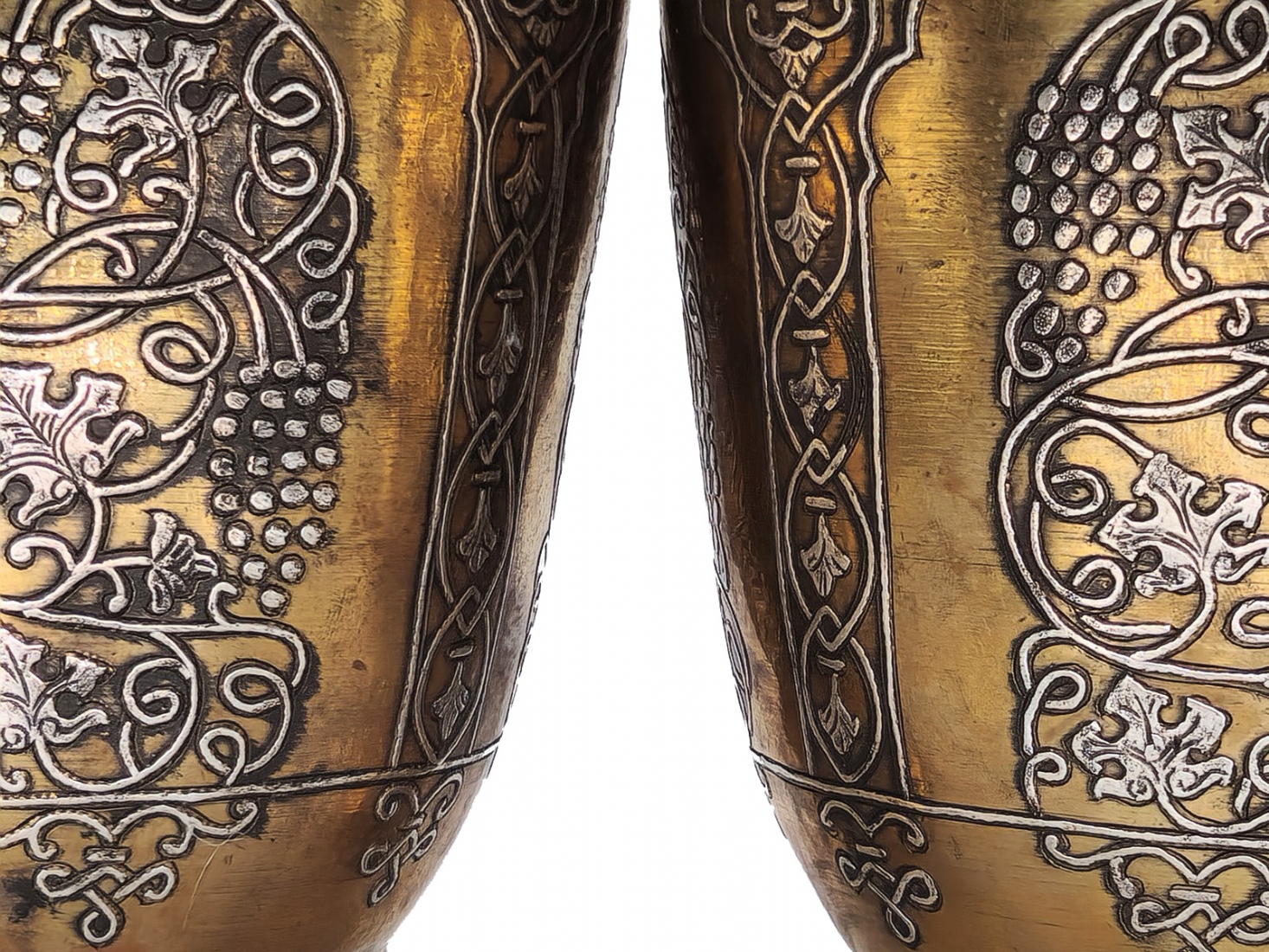 זוג כדים איסלמים עשויים בעבודת דמשק, עשויים פליז ומשובצים כסף בדגם גפנים משורגות