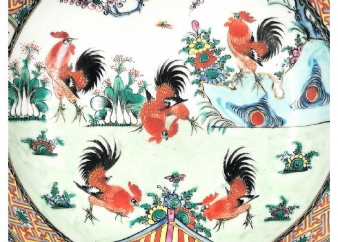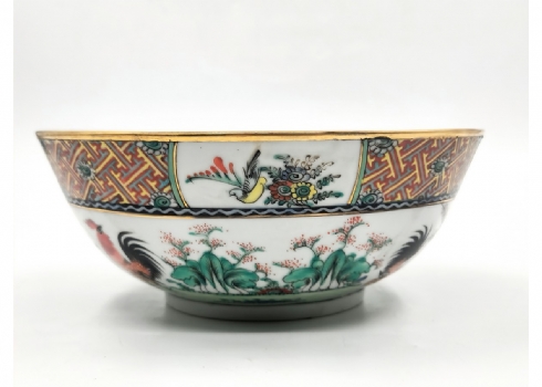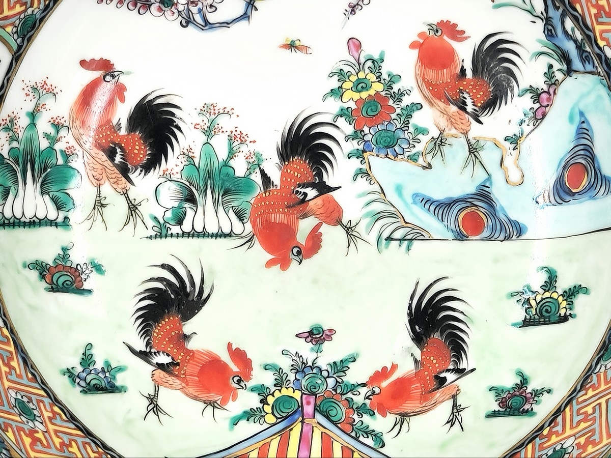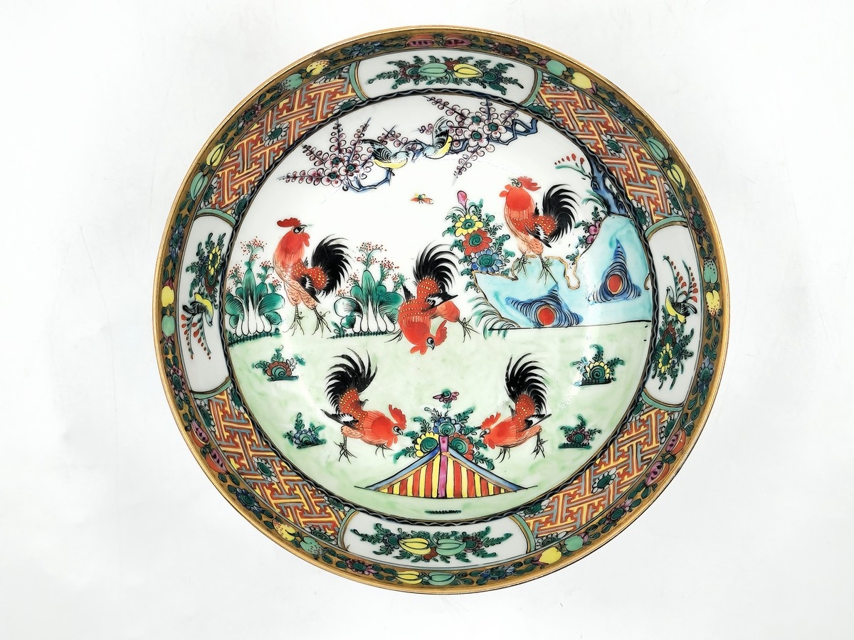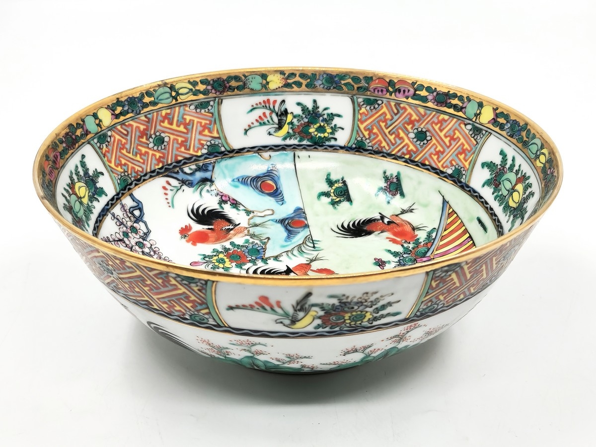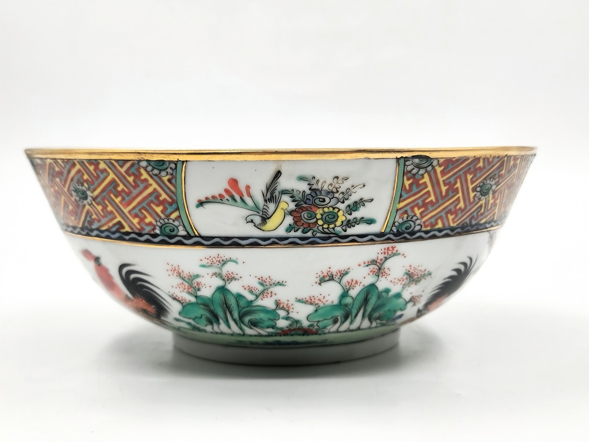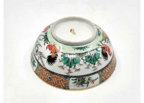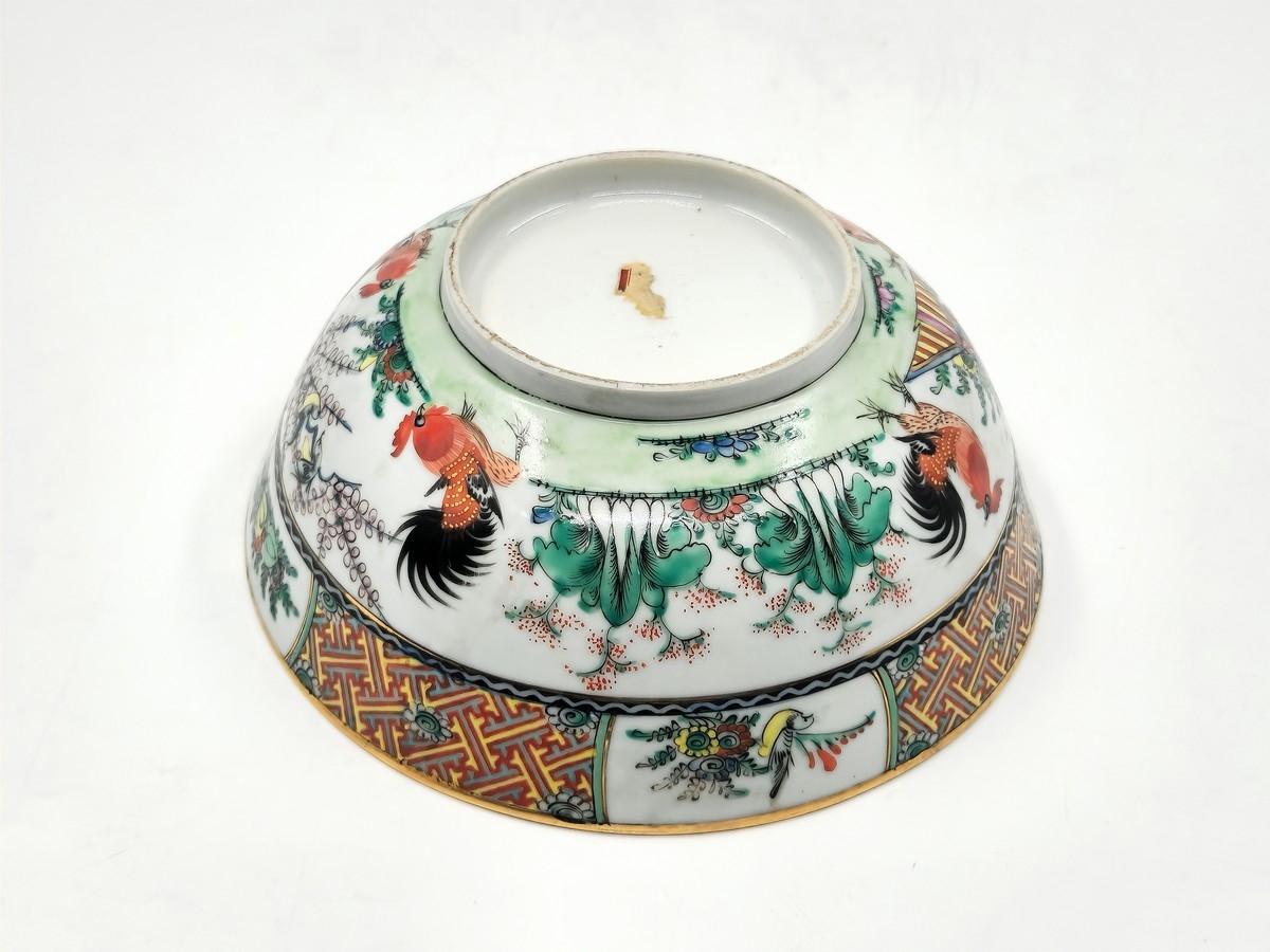 קערת פורצלן סינית מעוטרת באמייל בדגם תרנגולים וגן פורח