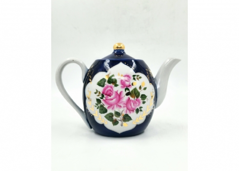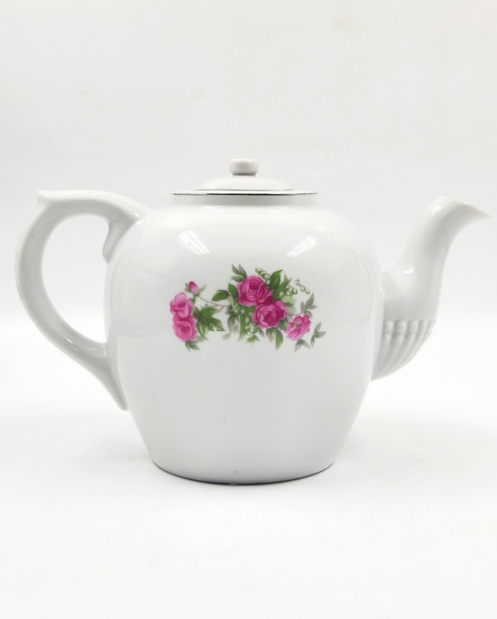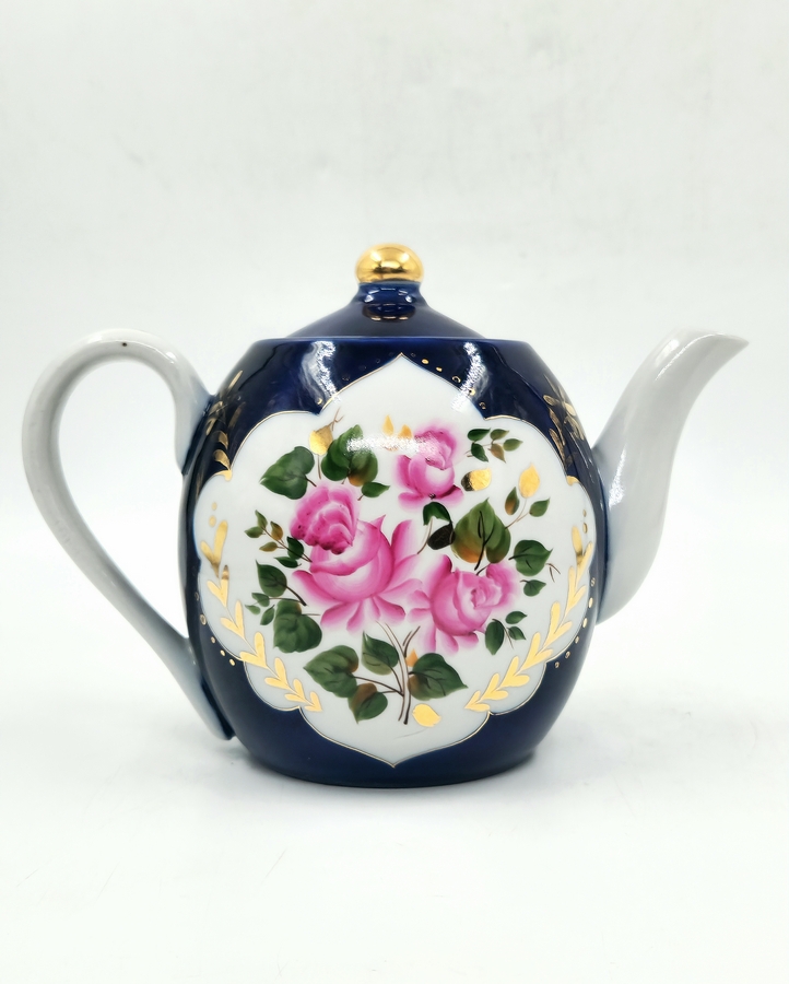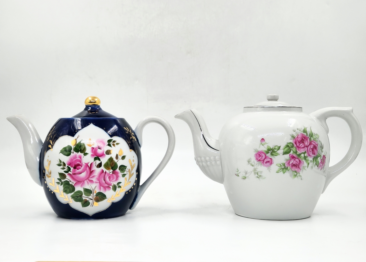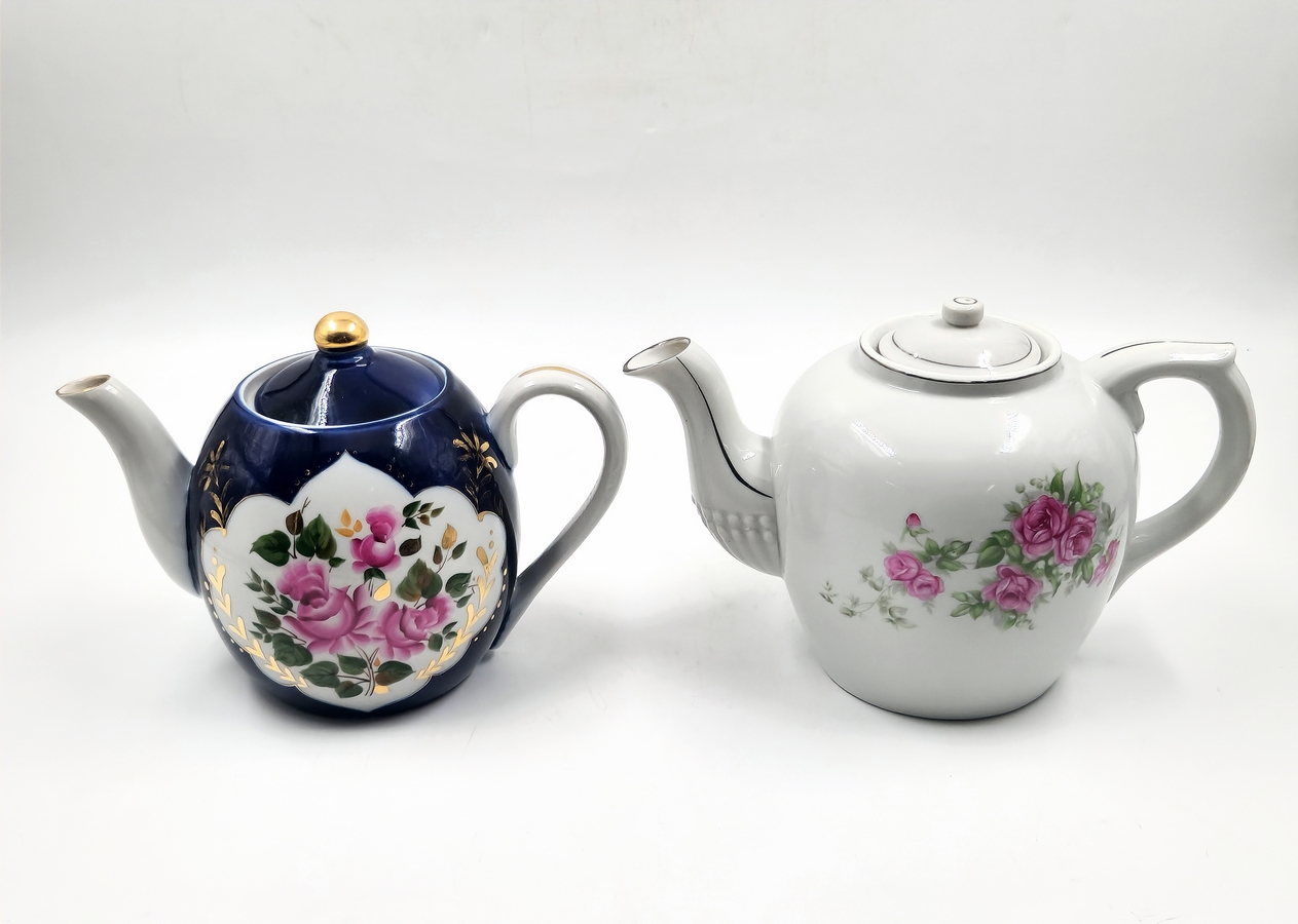 שני קומקומים (אחד יפני ואחד רוסי סובייטי) עשויים פורצלן חתומים