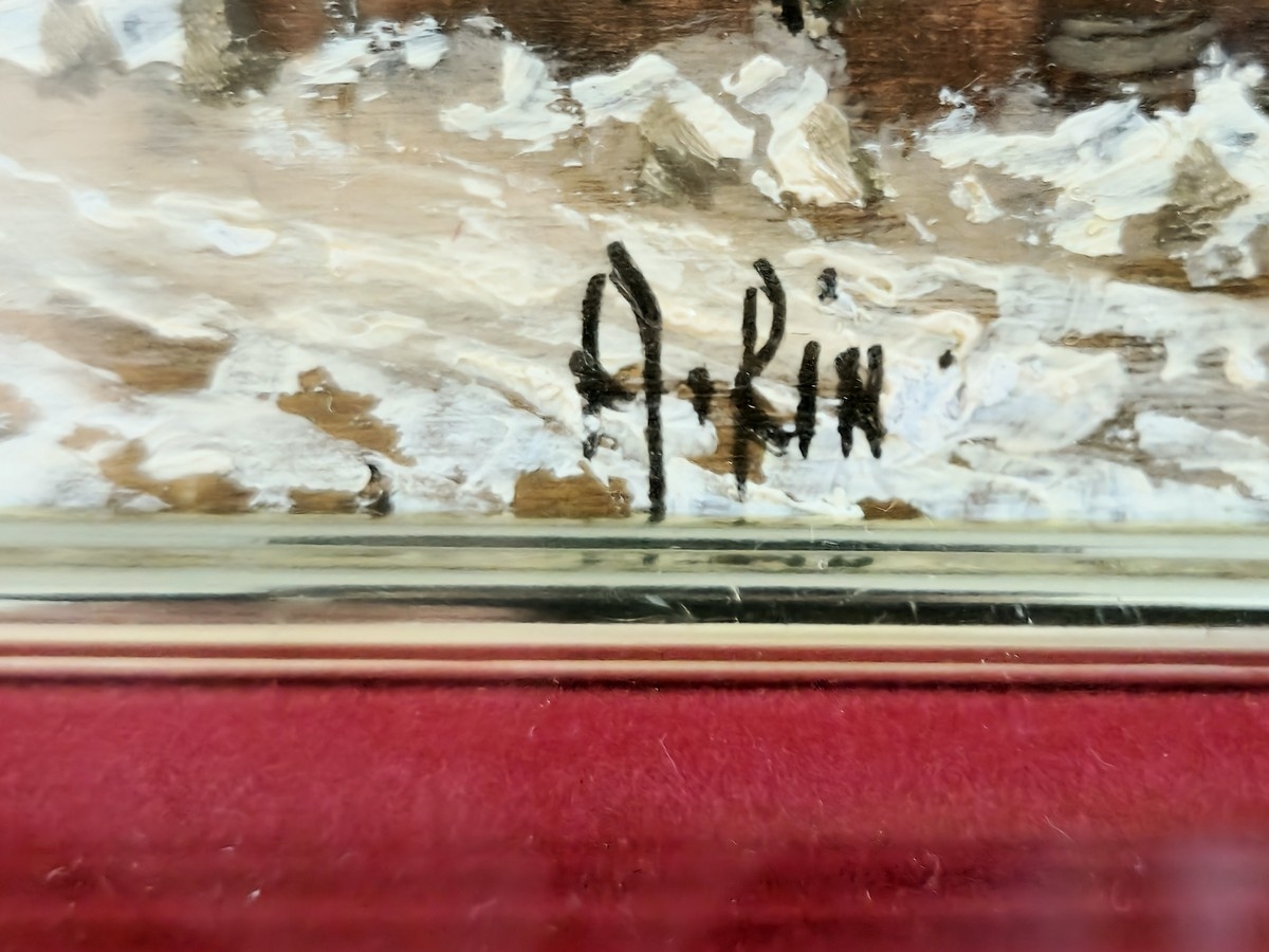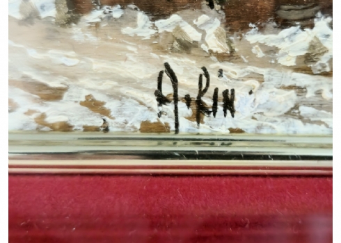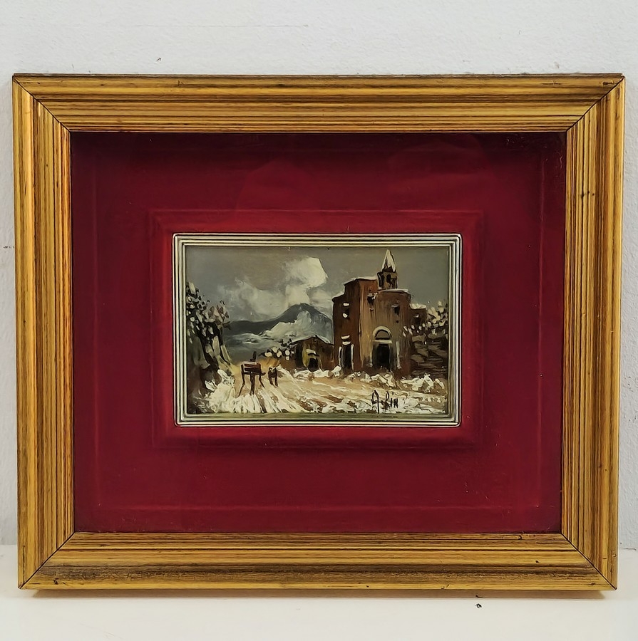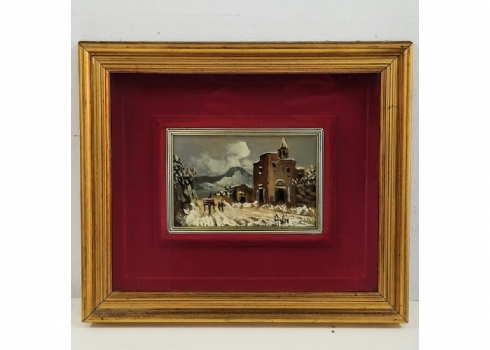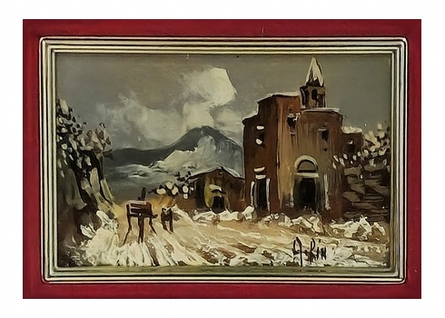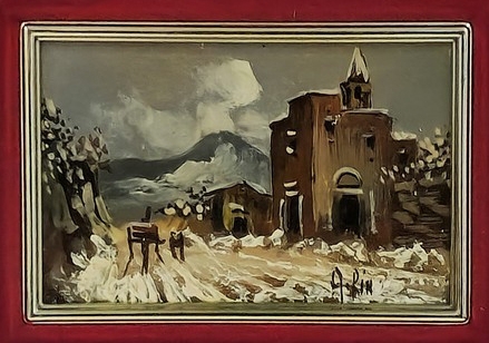 'צריח בנוף מושלג' - ציור שמן על לוח, חתום