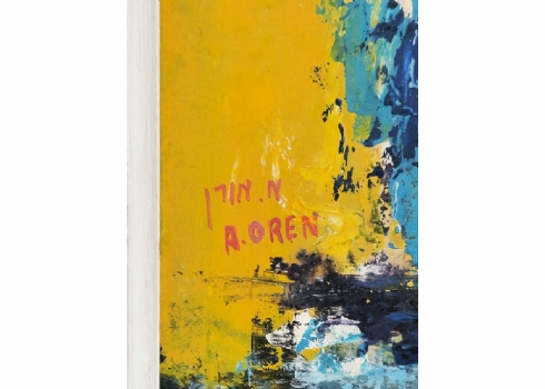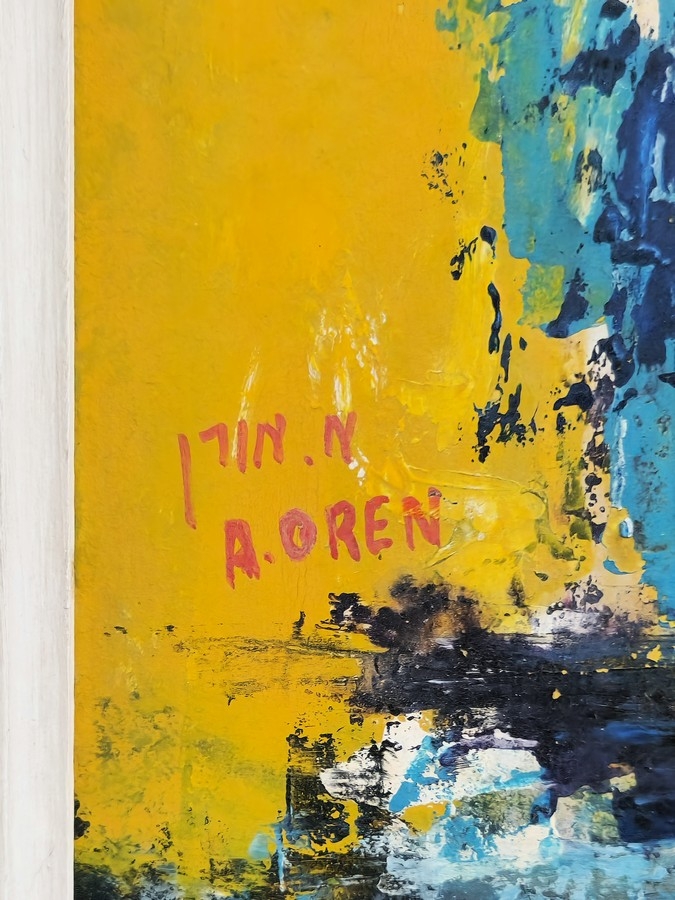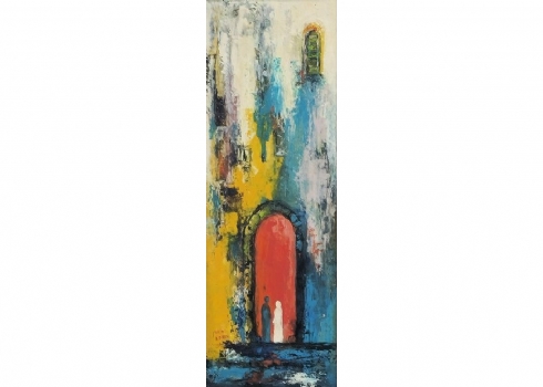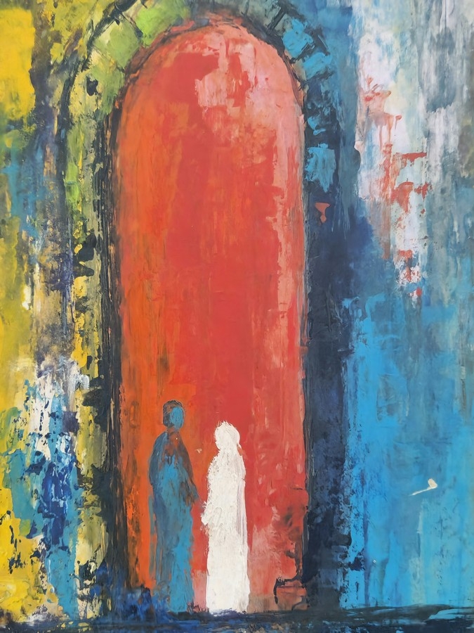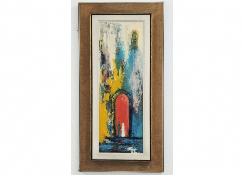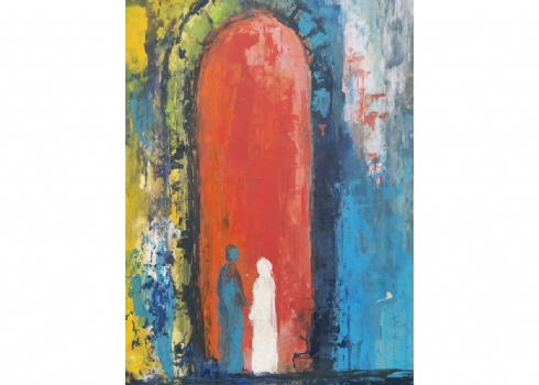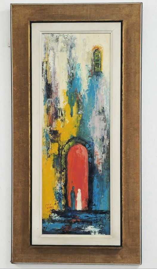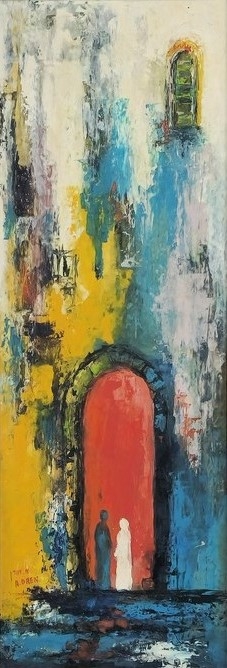 א. אורן (A.OREN), 'זוג בפתח דלת אדומה' - שמן על לוח, חתום