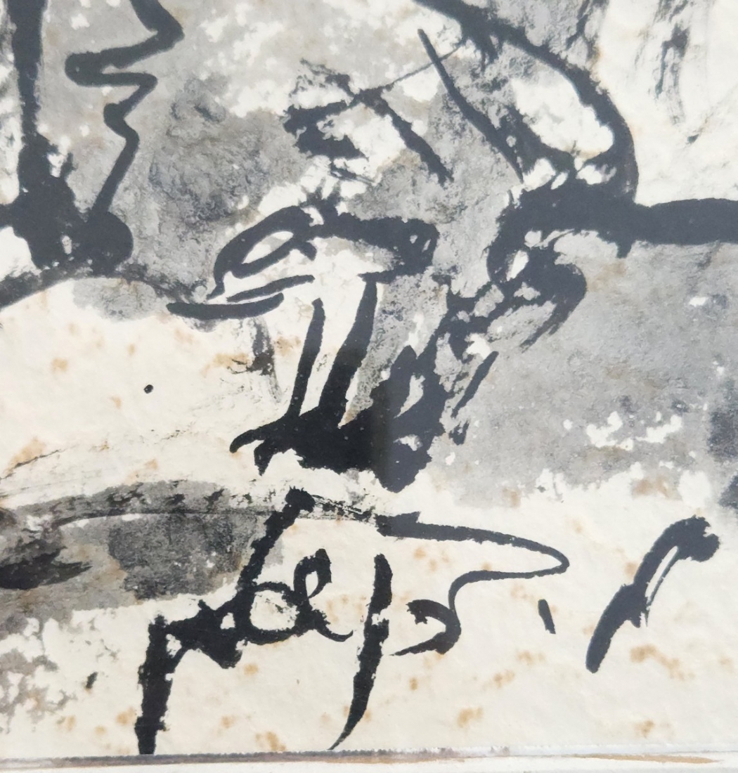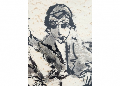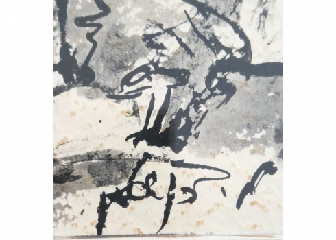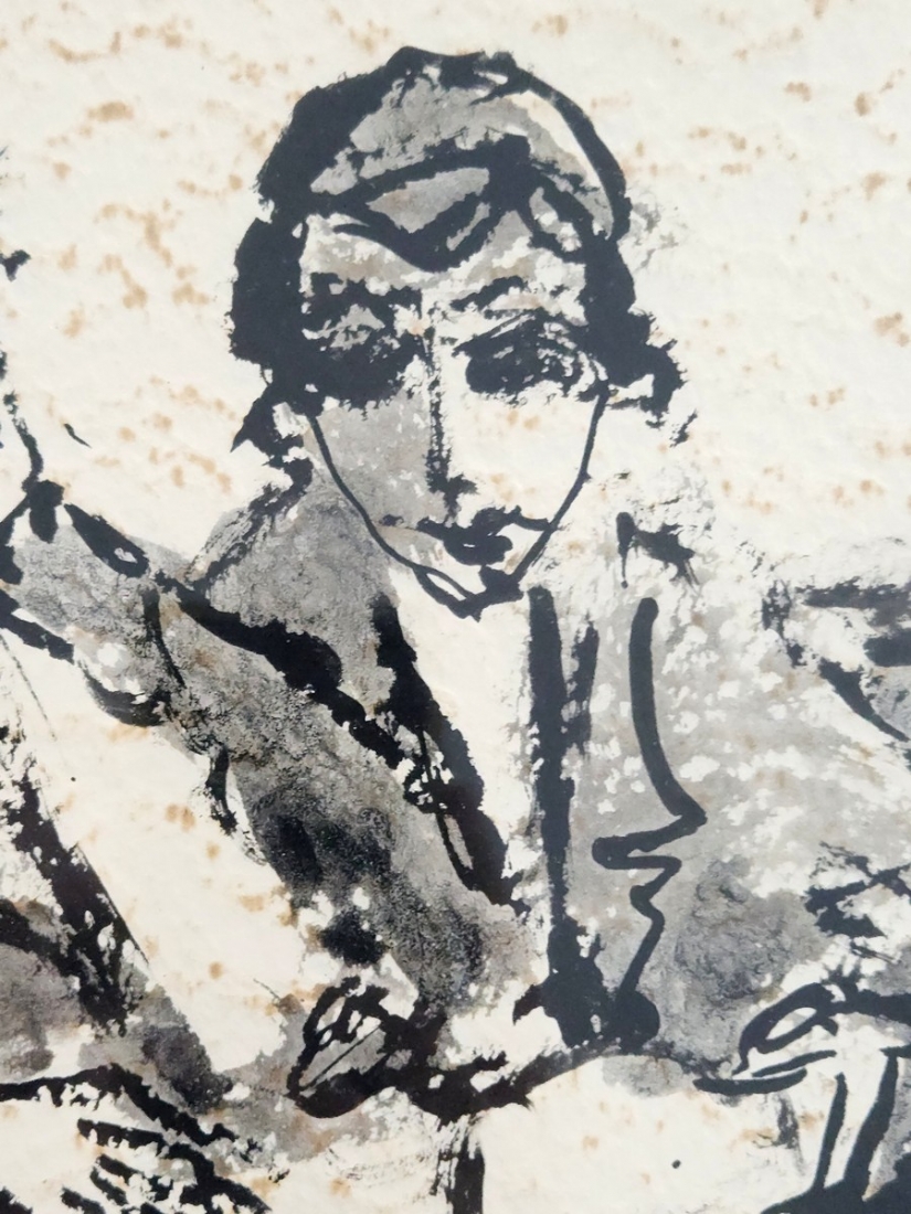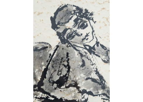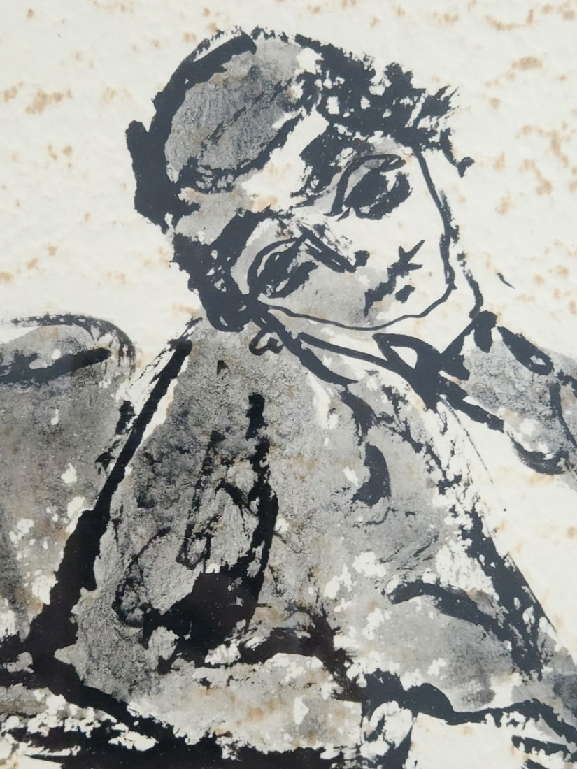 מצוייר על נייר עם טקסטורה עם מראה 'מוכתם' ב'כתמים' חומים (זה סוג הנייר לא פגם),