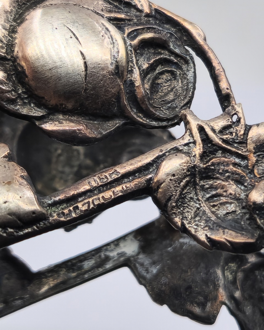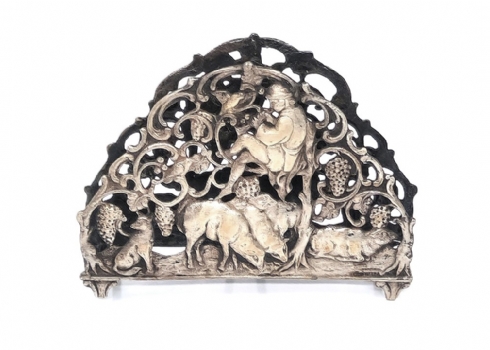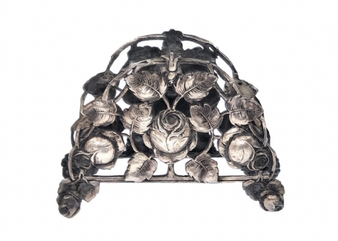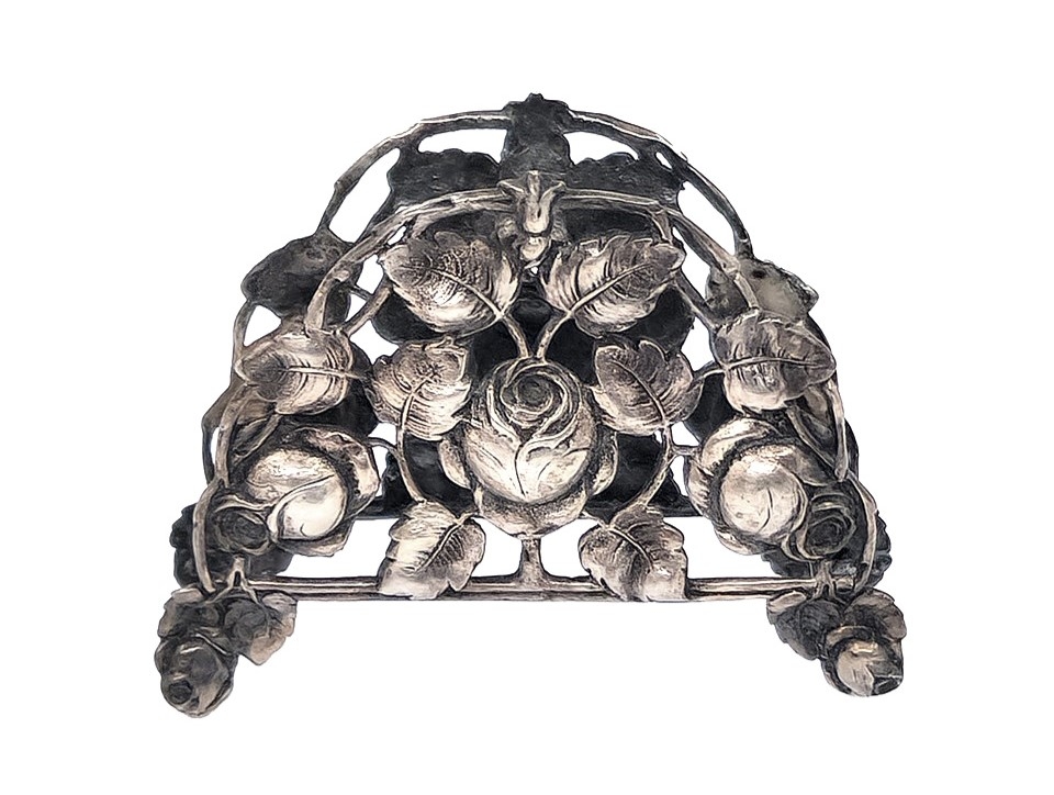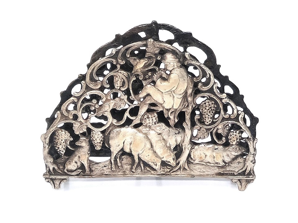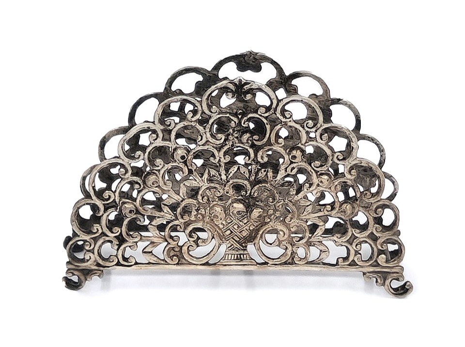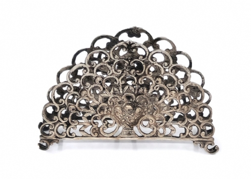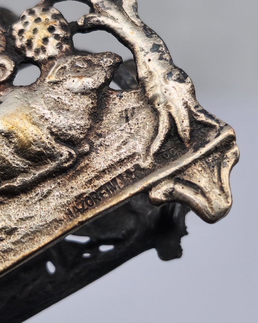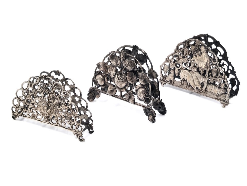 שלושה מחזיקי מפיות מעוטרים, עשויים כסף, אחד חתום HAZORFIM 800